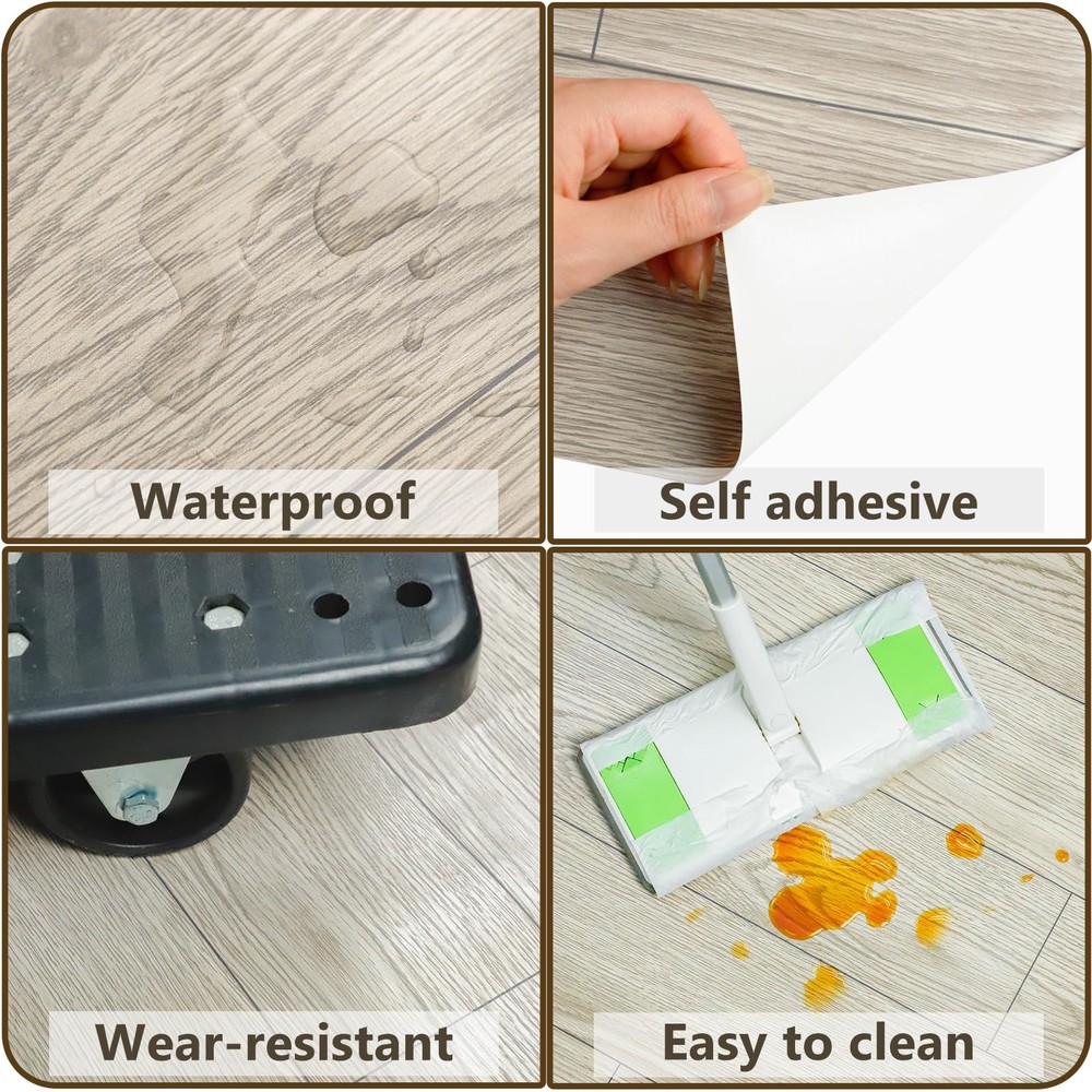 floor stickers are made of PVC materials that feature a slip-resistant, wear-resistant, and flame-retardant surface that is easy to clean and install. The water-resistant film allows for worry-free cleaning on various surfaces, including tiles, marble floors, wood floors, cement, and self-leveling floors. Ideal for any space, these stickers offer excellent sound insulation and heat preservation. Upgrade your floors with ease! 【Vinyl Flooring Roll】Our vinyl flooring is conveniently rolled up, providing significant advantages compared to traditional tile and strip floor stickers. It reduces material usage, seam requirements, and installation time, making it easier to handle, transport, and store. 【Quick and Easy Installation】Our peel and stick vinyl flooring is extremely easy to install and requires no special tools or adhesives. Simply peel off the backing and stick them onto any flat and clean surface. 【Waterproof and Wear-resistant 】Created with a precise 5-layer manufacturing process, our peel and stick floor tiles are designed to endure daily wear and tear. Not only are they waterproof, but they also resist dirt and damage. Cleaning them is effortless, just like maintaining a regular floor, so you can enjoy peace of mind. 【First Choice for Rental Houses】Our thin vinyl plank flooring is an ideal choice for rental homes, as it offers an economical and convenient way to remodel without damaging the existing flooring from adhesive. 【Attention】Please note that this vinyl flooring is thin, measuring just 0.3mm in thickness. Consider the thickness factor before making your purchase. While it may resemble contact paper, it features a special anti-wear layer for enhanced adhesion and durability on the floor surface.