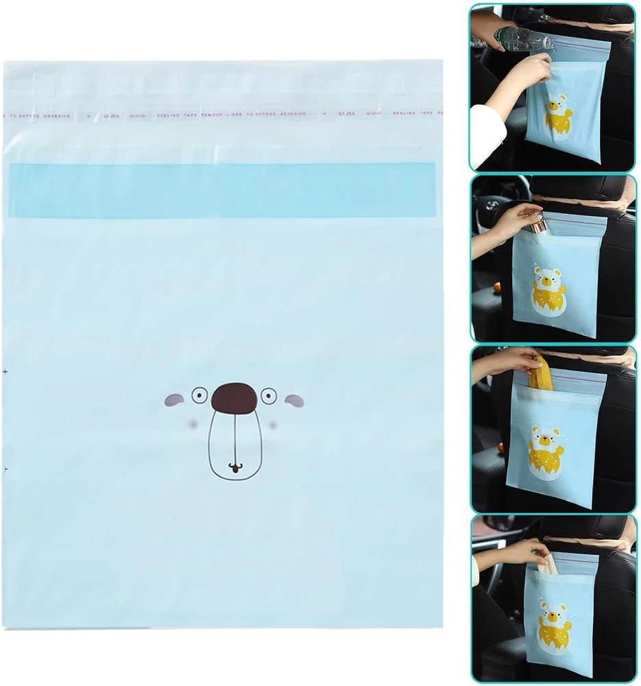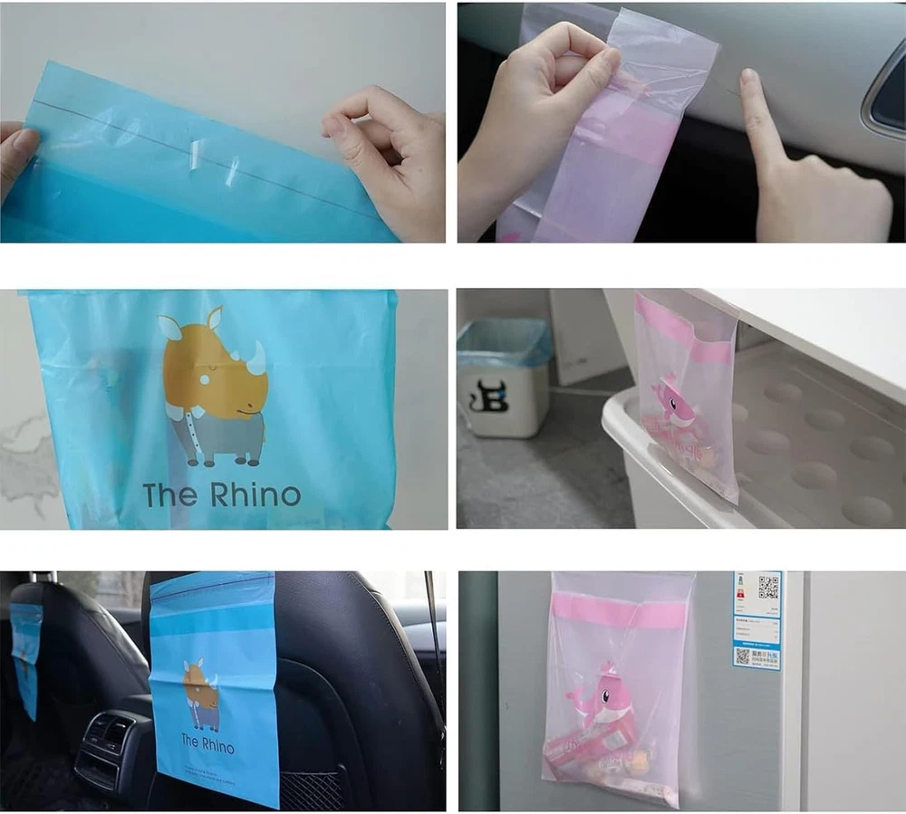Self-Adhesive Waterproof Trash Bags for Cars, Offices and Kitchens 30 Pack Peel off the white film above the adhesive tape, wipe off the dust and water on the surface of the object where to use, stick the bag thereafter. Be sure to seal the opening and discard after using In size of 12inx9.8in, compared with the traditional trash can, easier to carry, saving more space when using in car Good PE material makes it water-proof and leak-proof. Nontoxic and odorless, updated adhesive tape is wider, and more sticky. can bear more load without peeling off and leave no trace when tearing off Acts as a disposable trash bag for rubbish and vomit in car, as well as a storage bag for small carriage during long journey, Keep your car tidy and well organized, especially when travelling with baby inside, it is also a good choice in kitchen, bedroom, bathroom, office It can put different kinds of small rubbish and stuff. Perfect for auto, baby stroller, home, BBQ, camping, office, kitchen, etc. Great small car trash bag for road trips and even plane trips. Thank you for viewing our Self-Adhesive Waterproof Trash Bags for Cars, Offices and Kitchens 30 Pack.