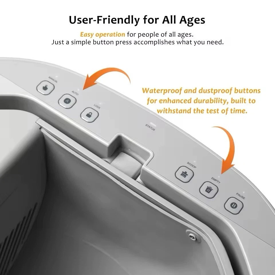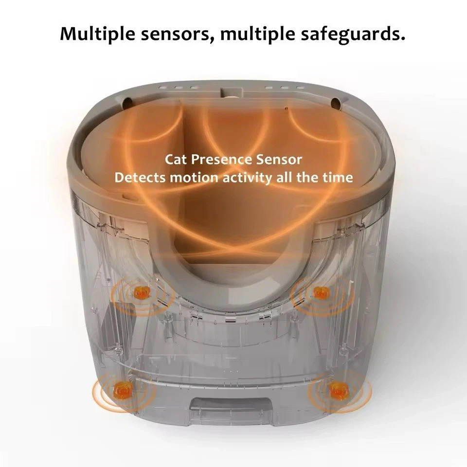 This self-cleaning cat litter box is designed for everyday use and is suitable for multiple cats. It features automatic cleaning functionality and built-in safety sensors to help protect your cat during operation. The unit is operated directly from the control panel on the device and does not require an app, Wi-Fi connection, or smart home integration. Its simple design makes it easy to use and maintain. The litter box has a modern gray finish and a spacious interior, making it suitable for cats of different sizes and life stages.