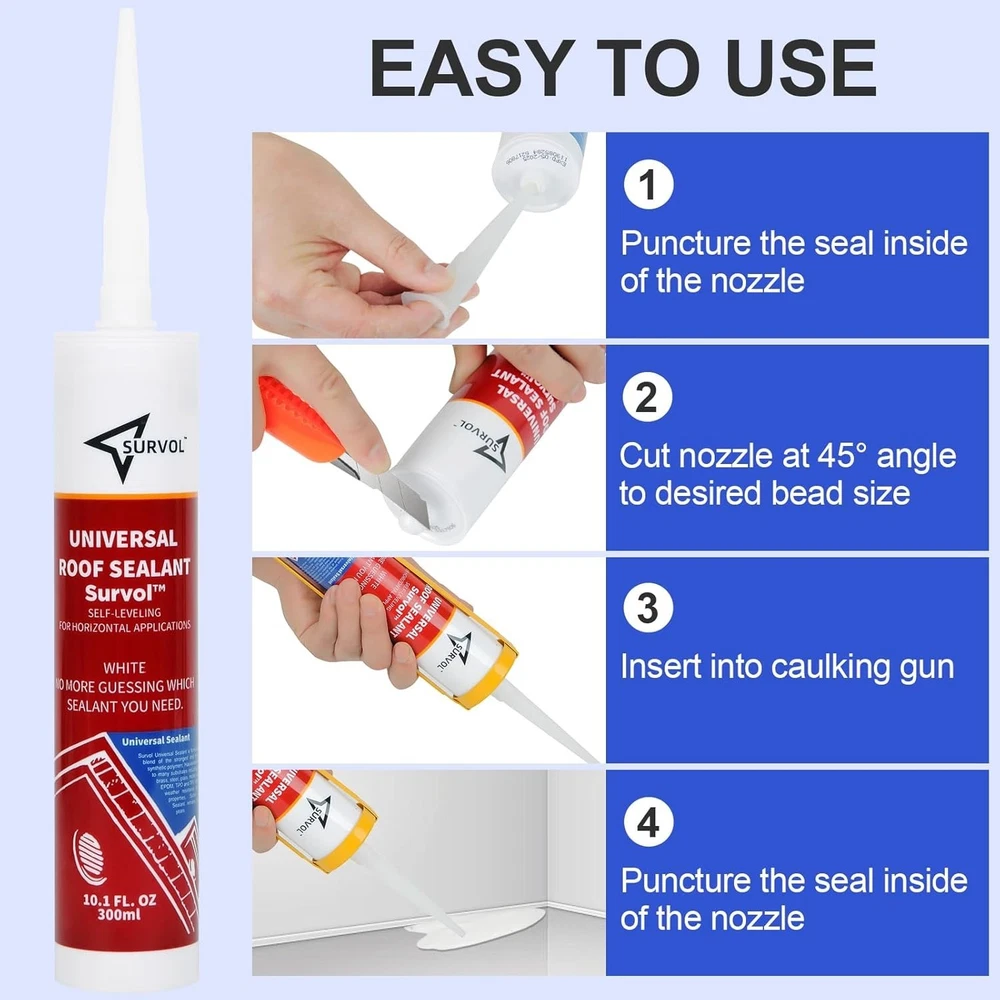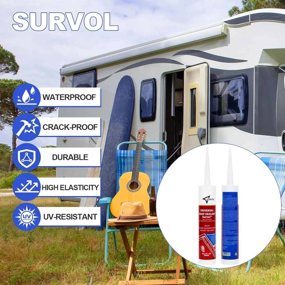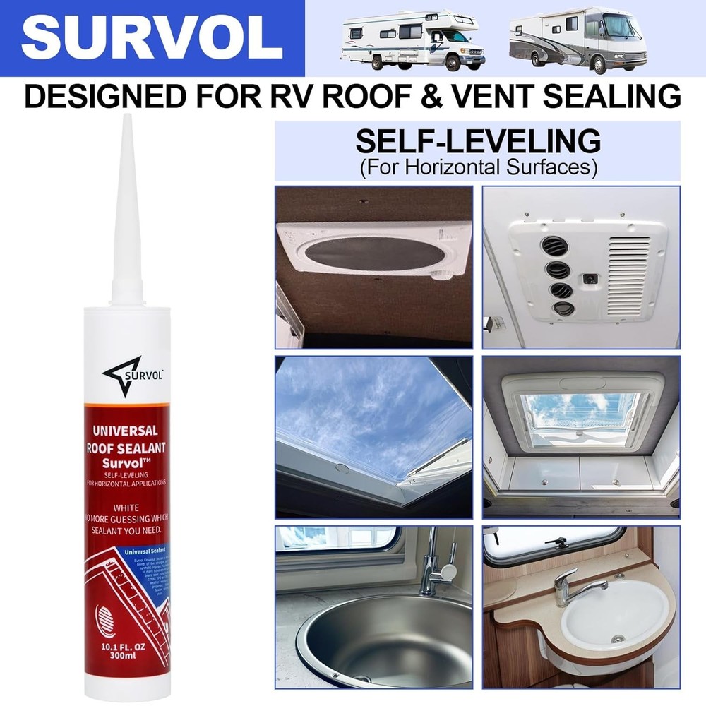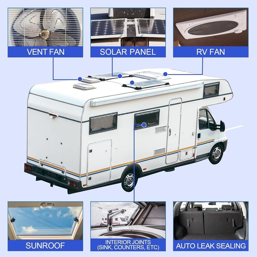 Fast Friday Store ✿✿✿✿✿ Self-Leveling Lap Sealant Caulk for Seal RV Camper Roof Air Vent Skylight Seams ☛ RV Roof Sealant has excellent adhesion on concrete, creates a strong seal along the RV's roof edges, air vents and windows ☛ Unrivaled Bonding with many substrates including aluminum, brass, steel, glass, mortar, wood, PVC, EPDM, TPO, TPV, window and more. With superior, weather resistance and sealing properties, silicon sealer remains flexible for years ☛ Watertight Seal, RV Caulking Sealant prevents leaks with its waterproof and breathable seal that will not shrink and stays flexible, making it a long-lasting solution for all your caulking and sealing needs ☛ Premium grade, strong formula ensures an excellent bond, making long-lasting life ensures that you have no trouble about resealing or replacing your caulking for years to come. Working Temps: -40° F to 200° F ☛ Permanently flexible and will not shrink or crack when subjected to extreme weather conditions
