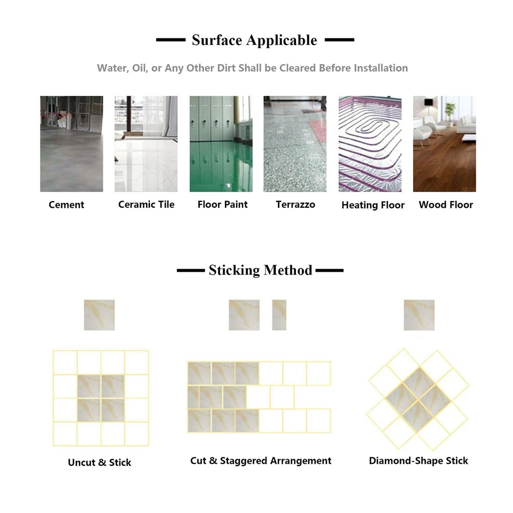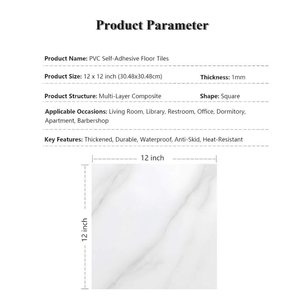 If you are looking for a way to renovate your old floorings at a low cost, vinyl floor tile is your best choice! ๐๐ข๐๐๐ฅ๐ข๐ค๐ ๐ฆ๐๐ซ๐๐ฅ๐ ๐๐ฅ๐จ๐จ๐ซ ๐ฉ๐๐ญ๐ญ๐๐ซ๐ง ๐๐๐ฌ๐ฒ ๐ข๐ง๐ฌ๐ญ๐๐ฅ๐ฅ๐๐ญ๐ข๐จ๐ง: Just peel and stick on floor. ๐๐๐ ๐๐ฌ ๐ฒ๐จ๐ฎ ๐ง๐๐๐: Light yet sturdy trimmable vinyl floor tiles, cut to fit any place in any shape. ๐๐๐ฌ๐ฒ ๐ซ๐๐ฆ๐จ๐ฏ๐๐ฅ: Leave no residue when any removal or replacement is needed. ๐๐๐ฌ๐ฒ ๐๐ฅ๐๐๐ง๐ข๐ง๐ ๐๐ง๐ ๐ฆ๐๐ข๐ง๐ญ๐๐ง๐๐ง๐๐: Clean the waterproof vinyl flooring with wet cloth or mob. ๐๐ญ๐๐๐ฅ๐ ๐๐ง๐ ๐๐ฎ๐ซ๐๐๐ฅ๐: Waterbased pressure sensitive adhesive ensures stability. Anti-scratch material ensures durability and longevity. ๐๐ฎ๐ฅ๐ญ๐ข๐ฉ๐ฅ๐ ๐๐ฉ๐ฉ๐ฅ๐ข๐๐๐๐ฅ๐ ๐จ๐๐๐๐ฌ๐ข๐จ๐ง๐ฌ: Can be used for kitchen floor, living room flooring, bathroom floor tiles, garage floor, office floor renovation, etc., on surfaces such as cement, old marble flooring, floor paint, terrazzo, heating floor, wood floor etc. We offer a 30-day full-money-back guarantee. Do not hesitate to ask if you have any questions about our floor tiles or installation. We'll try our best to help! ๐๐ซ๐๐ฆ๐ข๐ฎ๐ฆ ๐ช๐ฎ๐๐ฅ๐ข๐ญ๐ฒ: vinyl floor tiles are made of high-quality vinyl and backed with eco-friendly adhesive, which ensure durability and longevity. These peel and stick vinyl floor tiles are sturdy, waterproof, heat-resistant and anti-scratch. The lifelike marble patterns make the vinyl tiles look the same as traditional marble floor tiles. ๐๐๐ฌ๐ฒ ๐๐๐ ๐ข๐ง๐ฌ๐ญ๐๐ฅ๐ฅ๐๐ญ๐ข๐จ๐ง ๐๐ง๐ ๐ซ๐๐ฆ๐จ๐ฏ๐๐ฅ: No need to hire professionals to install the floor tiles. made the tiles peel and stick floor tiles, and the vinyl tiles are trimmable to meet any DIY need. Even a lady can easily renovate her flooring with these peel and stick vinyl floor tiles. If any replacement or removal is needed, the vinyl floor tiles can be removed without leaving residue. ๐๐๐๐จ๐ซ๐ญ๐ฅ๐๐ฌ๐ฌ ๐ญ๐จ ๐๐ฅ๐๐๐ง: You can clean the waterproof peel and stick vinyl tiles the same way as cleaning traditional marble floor tiles. The vinyl tiles that adhere to the floor tightly are waterproof and not easy to get dirty. You don't have to worry about laborious cleaning. ๐๐ข๐๐๐ฅ๐ฒ ๐๐ฉ๐ฉ๐ฅ๐ข๐๐๐๐ฅ๐: These peel and stick vinyl floor tiles are ideal laminate or linoleum floor replacements. The vinyl flooring tiles can stick on any flat and clean surface, such as cement, old marble flooring, floor paint, terrazzo, heating floor, wood floor, etc., in living rooms, bedrooms, kitchens, bathrooms, office, garage, and more. ๐๐ข๐ณ๐ ๐๐ง๐ ๐ฉ๐๐๐ค๐๐ ๐: The size of each floor tile is 12x12 inch (30.48x30.48cm), and the thickness is 0.04 inch (1mm). Each pack includes 20 vinyl tiles, covering a total area of 20 square feet (1.86 square meters).