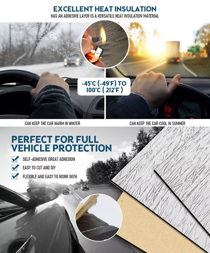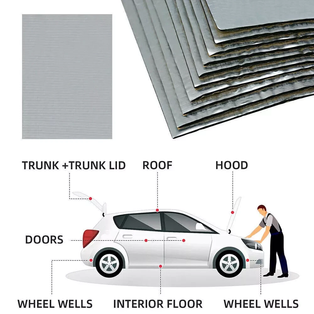 Product Features 3: Easy to Cut,Self-Adhesive Application 4: Underlay,Boot,Panel,Chasis Shipment quantity: 12 sheets 20''x12'' Sound Deadener Product Features 5: Easy Installation Type: Car Truck Noise Reduce Dampening Placement on Vehicle: Cargo/Trunk/Bonnet/Dashboard/Under Seat/Doors Product width: 30cm=12inch Product Features 4: Waterproofing, Fireproofing Application 8: Industrial equipment noise reduction and heat dissipation Product Features 6: Dustproof, Waterproof, Anti-moisture Application 5: Ceiling,underneath bonnets,Underfelt Application 3: Car& Home Interior Heat Sound Deadener Insulation Coverage: 1.8 sqm=19 sqft Application 1: Hood,Firewall,Doors,Floor,Roof Material: Aluminum foil foam Superseded Part Number: Heat Sound Deadener Insulation Mat Brand: MODIGT Application 6: Turbo,Front Fender,Rear Fender Fitment Type: Direct Replacement gtin13: Does not apply Application 7: Van,Truck,limousine,Camper,Boat,Motor Homes,School Bus,Low Rider Manufacturer Warranty: 2 Years Application 2: For Use in The Application Of Any Sound Deadeningr Color: Silver Product Features 2: Noise Reduction Product length: 50cm=20inch Product Features 1: Heat preservation Product Features 7: Reduce the road/ Engine/ Wind noise Product Features 8: Environmentally friendly and durable UPC: Does not apply