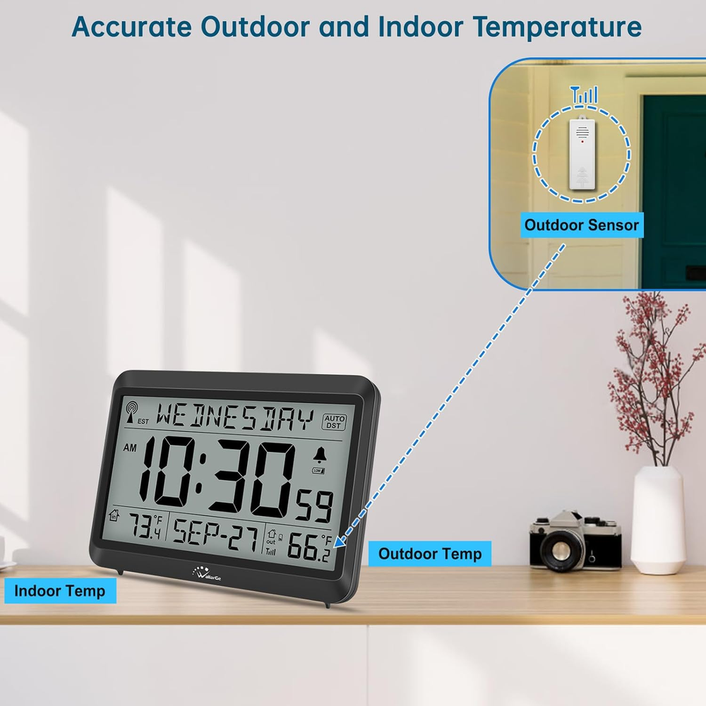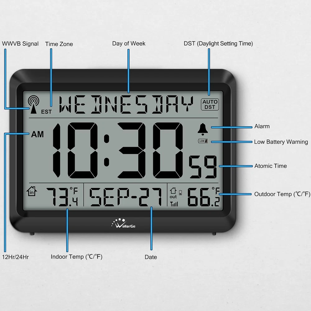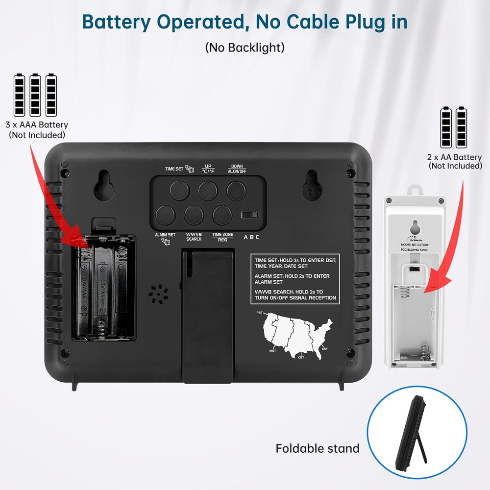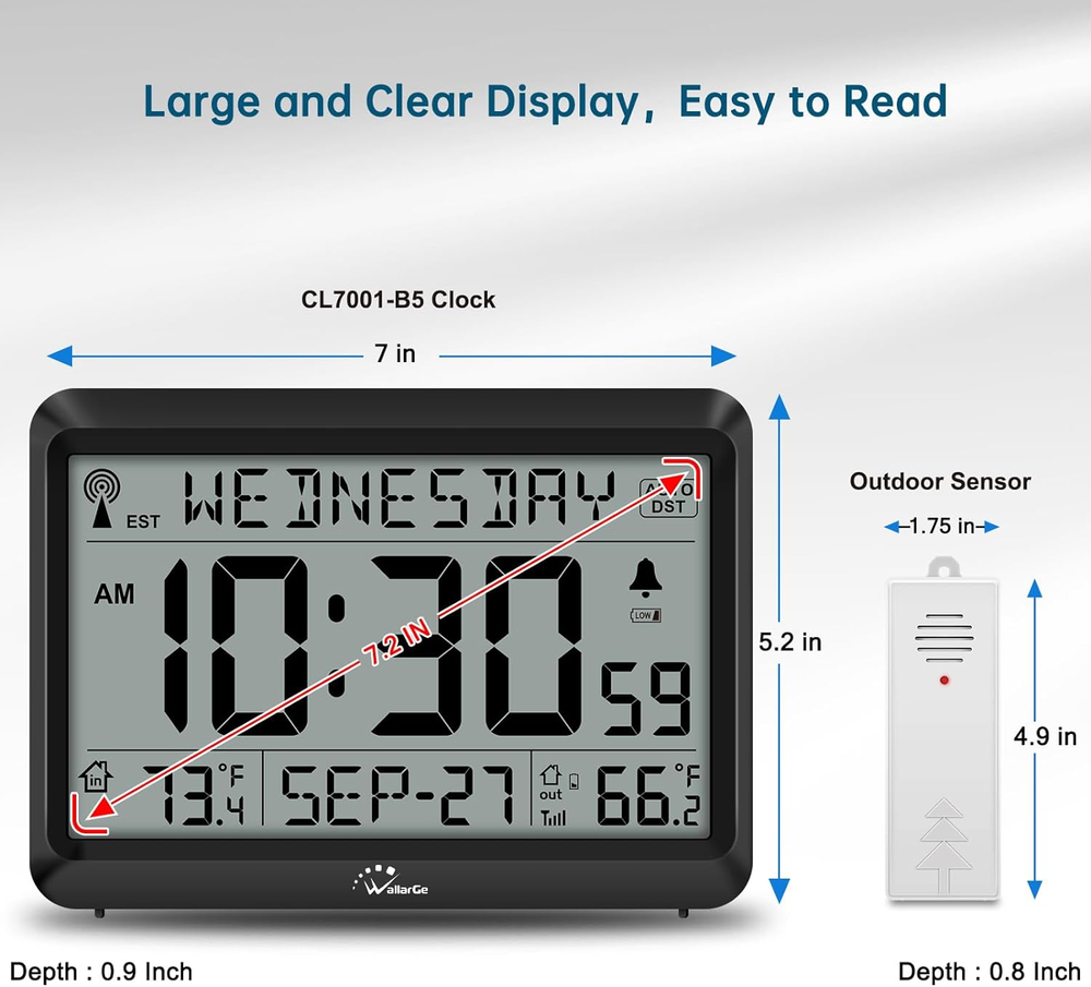 Business is our speciality NEW Atomic Clock with Indoor Outdoor Temperature, Self-Setting Digital Wall Clock Battery Operated, 4 Time Zones, DST FEATURES ๐๐ฐ๐ฐ๐๐ฟ๐ฎ๐๐ฒ ๐๐๐ผ๐บ๐ถ๐ฐ ๐๐น๐ผ๐ฐ๐ธ - The atomic clock has a built-in receiver that automatically synchronizes itself with the WWVB radio broadcast, which will update time automatically every midnight to ensure accurate time. It has 4 time zones: EST, CST, MST, PST. ๐๐๐ผ๐บ๐ถ๐ฐ ๐๐น๐ผ๐ฐ๐ธ ๐๐ถ๐๐ต ๐๐ป๐ฑ๐ผ๐ผ๐ฟ ๐ฎ๐ป๐ฑ ๐ข๐๐๐ฑ๐ผ๐ผ๐ฟ ๐ง๐ฒ๐บ๐ฝ๐ฒ๐ฟ๐ฎ๐๐๐ฟ๐ฒ - This atomic clock can display both indoor and outdoor temperature, helps you better manage your daily life. The wireless outdoor sensor monitors and transmits the outdoor temperature to the clock to display. The sensor should be placed within 330 feet and out of direct sunlight or rain. ๐๐ถ๐ด๐ถ๐๐ฎ๐น ๐๐น๐ฎ๐ฟ๐บ ๐๐น๐ผ๐ฐ๐ธ ๐๐ฎ๐๐๐ฒ๐ฟ๐ ๐ข๐ฝ๐ฒ๐ฟ๐ฎ๐๐ฒ๐ฑ - The clock is supported by 3 x AAA battery and outdoor sensor is supported by 2 x AA battery. (Batteries are not included). When batteries of clock or sensor are running low, there would be a low battery symbol appearing on screen and blinking, reminding you to replace new batteries in time. ๐๐ฎ๐ฟ๐ด๐ฒ ๐๐ถ๐๐ฝ๐น๐ฎ๐ ๐๐ถ๐๐ต ๐ง๐ฒ๐บ๐ฝ๐ฒ๐ฟ๐ฎ๐๐๐ฟ๐ฒ, ๐๐ฎ๐ ๐ฎ๐ป๐ฑ ๐๐ฎ๐๐ฒ - Two temperature modes switchable (Celsius and Fahrenheit). When click button, both indoor and outdoor temperature exchange mode at the same time. There are also two display modes of time selectable: Standard Time and Military Time. ๐๐จ๐ง๐ข ๐๐ฆ๐ง ๐ฎ๐ป๐ฑ ๐๐น๐ฎ๐ฟ๐บ โ With DST on, clock will go forward or fall back one hour automatically in daylight saving time. When DST or alarm is on, there would be a corresponding icon staying on screen. Both of them could be turned off manually if for no need. Product Description Get Started Quickly 1. Adjust the outdoor temperature link channel of clock and outdoor sensor to be same๏ผlike A-A, B-B, C-C. 2. Install batteries (3xAAA for clock and 2xAA for outdoor sensor) and choose your time zone. 3. Outdoor temperature starts to connect first, once finished, clock starts to search for WWVB signal. 4. Put clock to a place with good signal for better reception and outdoor sensor to a safe place outside within 330feet/100m. 5. Clock updates time automatically when signal received successfully. Tips: In most areas, a signal can only be received at night. If your clock does not receive WWVB signal in daytime, please wait overnight and it will be set in the morning. Outdoor temperature range: -40โ ~ 158โ (-40ยฐC to 70ยฐC). Indoor temperature range: 32โ ~ 122โ (0ยฐC to 50ยฐC). When clicking to change the temp display unit, indoor and outdoor will change simultaneously. The outdoor sensor should be placed within 300ft/100m and out of direct sun light or rain. This atomic is a wall clock and table clock. There are hangging holes on the clock back, you can hang it on wall easily. There is also a folding stan on the back, so it can also be used as a desk clock. 1 Battery Operated 2 AUTO DST 3 Optional Alarm 4 12 Hr/24 Hr Display 5 Temp Switching After installing batteries, my clock is not showing the outside temp, how to make it work? Select any one of the ABC channels on the clock and set the channel of the sensor to be the same. The outdoor temperature will be displayed within 3 minutes. Does it light up in the dark? No, it doesnโt have a backlight feature. What time zone does it support? 4 U.S time zones (EST, CST, MST, PST ). How to correct the wrong day of week? Set the correct date and year then day of week will be corrected automatically. Is the outdoor sensor waterproof? It's waterproof, but for a longer service life, we recommend that you do not expose the sensor to direct rain or sunlight. Item model number CL7001-B5 Style Modern Are Batteries Included No Power Source Battery Powered Color Black Product Dimensions 7"W x 5.2"H Country of Origin China Watch Movement Automatic Item Weight 12.7 ounces Operation Mode Atomic Theme Plain Frame Material Acrylonitrile Butadiene Styrene Age Range (Description) Adult Alarm Clock Yes Mounting Type Wall Mount Special Feature Temperature Display, Alarm Display Type Digital Shape Rectangular Size 8.5INCH 5.2 "h x 7.0 "h. Weight: 12.7 oz Ask us anyhting Free shipping PAYMENT We accept all payments via Ebay using Credit Cards , PAYPAL , Apple Pay and many others SHIPPING We are always working hard to ensure your package arrives as soon as possible. Please understand that some factors like weather, high postal traffic, and the performance of shipping companies are outside of our control. DELIVERY & RETURN POLICY We offer a 30-Day Return Policy on items in which you are not completely satisfied with. You have the option of a full-refund or an exchange of the item. No returns are available on items shipped outside of the USA.