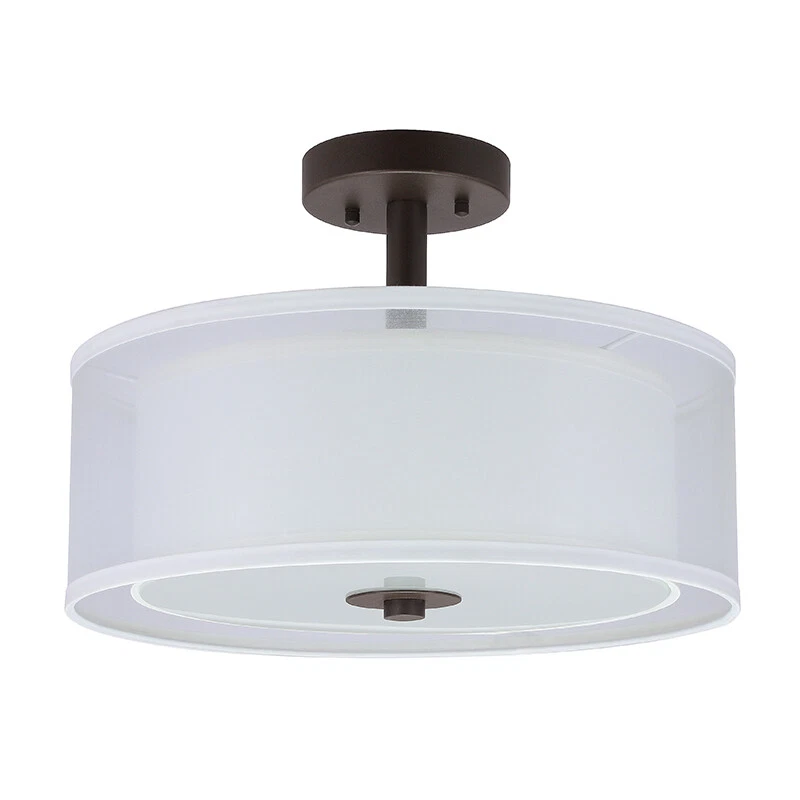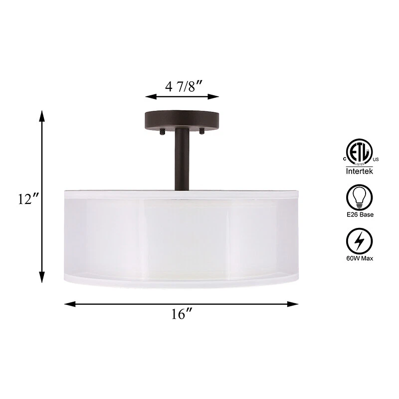 Drum semi flush ceiling light featuring a smooth dark bronze finish and white fabric shade, frosted glass diffuser. Its double fabric shade creates a comfortable and brings all the modern elements. This elegant drum ceiling fixture is perfect for Kitchen, Bedroom, Living room, dining room, foyer or any living areas, of which will lend elegance to your space while surrounding it with relaxing ambient light. Dark bronzed semi flush light is is an ideal for low or mid-height ceilings. The drum-shaped fixture has a dual outer and inner shade that adds a delightful dimensional aspect. Product Specification Dimension: W:16" x H:12" Finish: Dark Bronze Shade Material: Double Fabric Shade + Frosted Glass Diffuser Shade Dimensions: (Outer) W:16" x H: 6" (Inner) W:13ʺ x H: 5ʺ Socket: E26 Socket 3x60W (Bulb not Included) Compatible with Variety of Bulbs This semi flush mount is suggest to use “A” Type Max. 3x60W bulbs for medium base (E26 socket) (incandescent bulb or equivalent CFL / LED bulbs) The fixture is dimmable when using the dimmable bulb with compatible dimmer switch. Bulb not Included. Semi Flush Ceiling Light Collection XB-SF1194-BN Dimension W:16" x H:12" Finish Brushed Nickel Shade Material Fabric Shade + Glass Diffuser Shade Diamension (Outer) W:16" x H: 6" Socket E26 Wattage 3x60W (Bulb not Included) XB-SF1194-GB Dimension W:16" x H:12" Finish Gold Brass (Powder Coating) Shade Material Fabric Shade + Glass Diffuser Shade Diamension (Outer) W:16" x H: 6" Socket E26 Wattage 3x60W (Bulb not Included) XB-SF1289-DB Dimension W:16" x H:12" Finish Dark Bronze Shade Material Fabric Shade + Glass Diffuser Shade Diamension (Outer) W:16" x H: 4-7/8" Socket E26 Wattage 3x60W (Bulb not Included) Terms of Sale Shipping Policy: We ship within 1-2 business day from receipt of payment. We do not change your shipping address by email. Please make sure your address is correct before checking out and making payment. Payment Policy We accept most major credit cards, including, but not limited to, Visa, Mastercard, American Express, or Discover card and PayPal. All major credit cards are accepted through secure payment processor eBay Payment. All payment must be made within 7 days of the end of the auction. Otherwise, an "Unpaid Item Dispute" will be filed with eBay. Return Policy If you have any questions about purchases or concerns on our products or accessories replacement, please feel free to contact us through eBay's Message Center. However, if a return is required, please kindly noted that all returns should be met with following conditions: All return requests must be within 30 days of receipt. Return item must be in original condition as received (brand new in sealed package / with tags). Refund of purchase price less original shipping will be issued. Return postage is buyer's responsibility. Original shipping is not refundable for products features free shipping unless we're found at fault. We won't be able to refund if products are found damaged or used. Thank you. Any accessories (such as: Glass) broken via transportation can be replaced for free within 30 days receipt. However, If exceed the valid date to contact us that need you to pay for the accessories (such as: Glass), thanks!