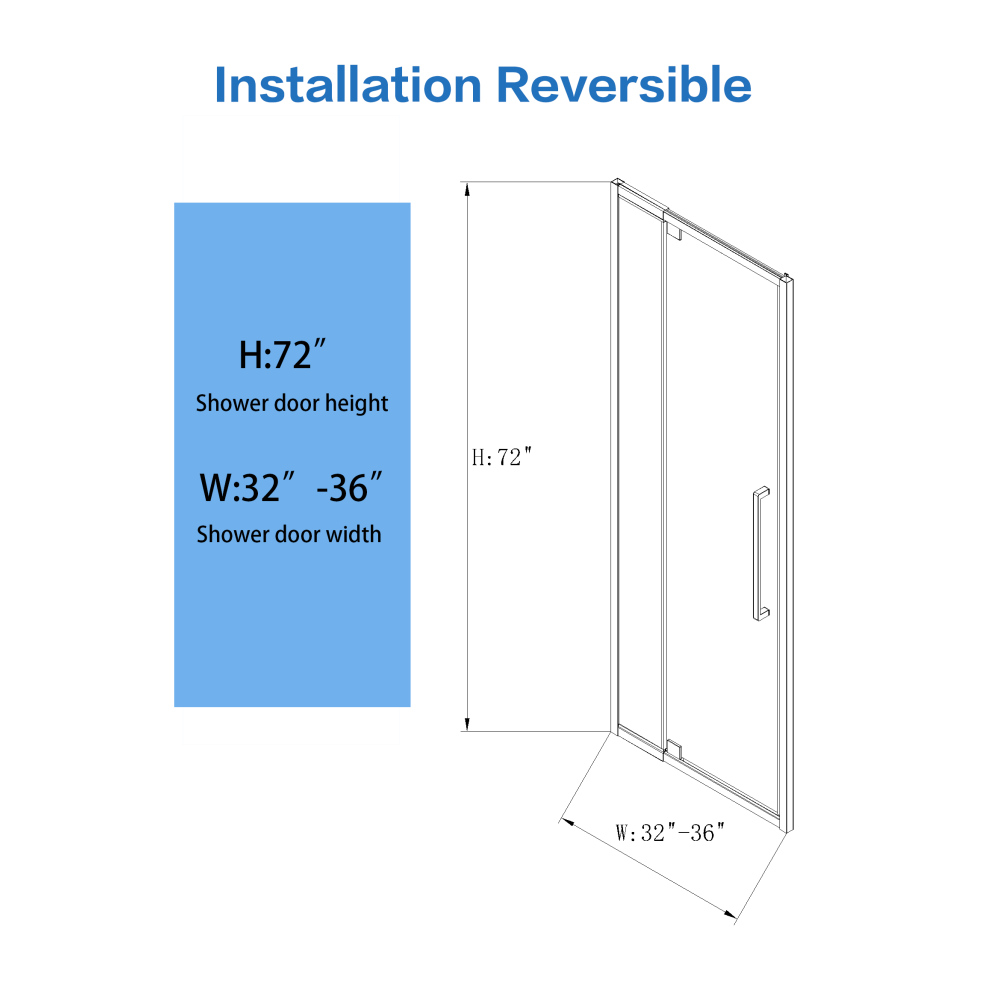eBay Product Description: Semi-Frameless Pivot Hinged Glass Shower Door Introducing this sleek semi-frameless pivot hinged glass shower door, crafted with American design sensibilities to elevate your bathroom’s functionality and style. Made with premium 1/4" (6mm) tempered glass and durable aluminum filling, it balances sturdiness and modern elegance—ideal for any bathroom decor. Key Features • Adjustable Dimensions : Width adjusts from 32 7/8" to 36 6/8" (834~934 MM), height reaches 76" (1930 MM), and the walk-in opening measures 20" (515 MM) to fit most standard bathroom layouts.• Flexible Installation : Equipped with telescopic rails offering up to 4" width adjustment, this door accommodates irregular/trapezoidal walls. Wall profiles add 3/8" adjustment per side, perfect for non-vertical (uneven) surfaces.• Reliable Waterproofing : A fully transparent sealing strip at the door junction prevents water leakage, keeping your bathroom floor dry and safe.• Reversible Opening : Designed for easy left/right opening installation—choose the configuration that best fits your bathroom layout. Note: Measure after completing wall finishes (tiles, backer boards) for a precise fit. Product Specifications Finish: Matte Black Material: 1/4" (6mm) Tempered Glass Filling Material: Aluminum Assembled Length: 36.00" Assembled Height: 72.00" Assembled Width: Not Applicable Product Weight: 55.00 lbs Package Details Package Length: 77.17" Package Width: 30.51" Package Height: 2.95" Package Weight: 60.00 lbs Warranty & Return Policy 1-Year Limited Warranty : Enjoy peace of mind with a 1-year warranty against manufacturing defects. 30-Day Free Return & Exchange : Not satisfied? Return or exchange the product within 30 days of delivery—no hassle, provided it’s unused and in original packaging.
