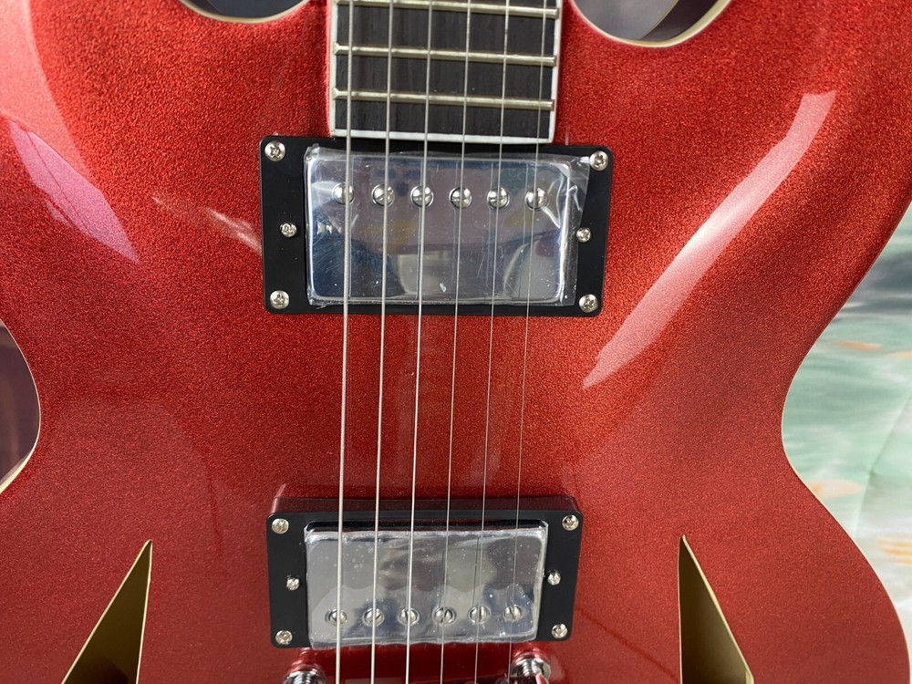 The product is a high-quality semi hollow electric guitar with a red maple body, mahogany neck, and rosewood fretboard. It is a professional-level 6-string guitar designed for right-handed players. This limited-time offer includes a cable and has 22 frets. With a standard series and custom model year of 2025, this electric guitar is perfect for musicians looking for a versatile and well-crafted instrument.