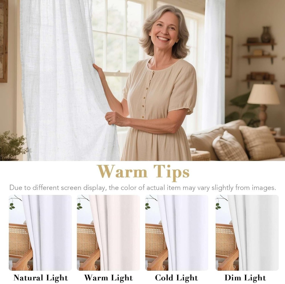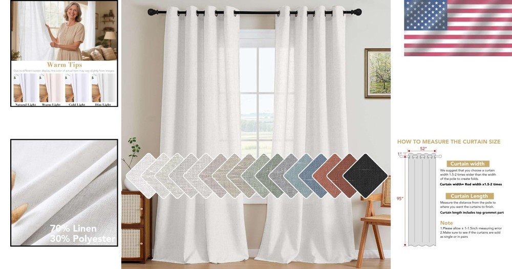 Semi Sheer Linen Curtains, Energy Efficient, 52"x96" ‹ › ‹ › ‹ › ‹ › ‹ › ‹ › ‹ › ‹ › ‹ › ‹ › Semi Sheer Linen Curtains Energy Efficient Size: 52" x 96" (each panel) | Set measures: 104" x 96" Material: 70% Linen and 30% Polyester Features: Crafted from open weave linen blended fabric, providing a primitive and natural aesthetic. Passed GLOBAL RECYCLED STANDARD certification, ensuring an environmentally friendly product. Natural linen composition offers a unique, slightly brownish tone for a rustic touch. Soft touch feeling that adds a refreshing charm while diffusing light beautifully. Designed for energy efficiency, reducing energy usage while providing privacy protection. Sold as a pair, each panel featuring 8 nickel grommets, suitable for up to 1 1/4" curtain rods/poles. Benefits: Create an elegant and aesthetic atmosphere in any space. Timeless design that complements various home styles, enhancing overall decor. Lightweight and airy texture provides both illumination and privacy. Easy to maintain – machine washable and designed for lasting beauty. Why Choose Our Semi Sheer Linen Curtains? Transform your living space into a serene oasis with our Semi Sheer Linen Curtains. These elegant draperies combine functionality with extraordinary style, offering a timeless classic that charms any room. Crafted from a luxurious linen blend, these curtains not only elevate the aesthetic value of your home but also promote energy efficiency, ensuring your living space remains comfortable -round. Whether you seek to infuse a garden-like essence into your home or simply wish to enjoy a soft, diffused light, these curtains embody the perfect blend of beauty and practicality. Make your living environment effortlessly chic - order your pair today! Shipping Free & Fast Shipping - We offer free shipping to most of the USA with a normal delivery time of 3-10 business days. However, due to various situations, additional delivery time (up to 3 weeks) may be required for some items. Alternative Carriers - We may use alternative carriers (e.g. USPS, FedEx, UPS, etc.) to ensure your package arrives safely and on time. Due to the use of multiple carriers, we are unable to provide a tracking number automatically. Handling Time - Orders are processed and shipped within 1-5 business days of receiving cleared payment. Shipping Restrictions - Shipping to Alaska, Hawaii, Puerto Rico, Guam, and other US territories may incur shipping charges or delivery restrictions. Please contact us before ordering, or your order can be refunded/cancelled. State Restrictions - There may be restrictions based on your state of purchase. For example, certain items may not be shipped to California due to state regulations. Contact for Tracking Updates - If you require tracking updates or have any concerns about the delivery of your order, please feel free to contact us, and we will be happy to assist you. Return 30-Day Hassle-Free Returns - We want you to be completely satisfied with your purchase. If you are not, you can return the item within 30 days of receiving it for a full refund or exchange. Easy Return Process - To start a return, simply contact us and we will provide you with a prepaid return shipping label and detailed instructions. Restocking Fee - There are no restocking fees for returns. However, the buyer is responsible for return shipping costs if the return is not due to a seller's error. Refund Processing Time - Refunds will be processed within 5 business days of receiving the returned item in its condition. Payment We accept all major credit cards, PayPal, and Apple Pay for your convenience. Your payment information is secure and encrypted to ensure a safe and seamless transaction. Please complete your payment within 3 days of purchase to avoid any delays in shipping. Feedback Your feedback is extremely important to us. We strive to provide the best products and customer service possible. If you are satisfied with your purchase, please take a moment to leave us a positive review. If you have any concerns or issues with your order, please contact us before leaving negative feedback. We are committed to resolving any problems and ensuring your satisfaction. Contact Us If you have any questions or concerns, please feel free to out to our customer support team. You can contact us through the eBay messaging system. We are available Monday to Friday, 9:00 am to 5:00 pm EST, and we will do our best to respond to your inquiry within 24 hours. Buy it now and enjoy a pleasant shopping experience! Unit Quantity: 2 Features: Light Filtering,Energy Efficient,Environment Friendly,Soft Touch,Privacy Protection Department: Adults Care Instructions: Machine Wash,Tumble Dry Low,Non-Chlorine Bleach Type: Panels Color: Heathered White Pattern: Solid Transparency: Sheer Room: Home Office Style: Casual Curtain Heading: Grommets Mounting: Wall Mounted Size: 52"w x 96"l (pack of 2) Item Weight: Light Theme: Space,love Compatible Window Type: Any Window