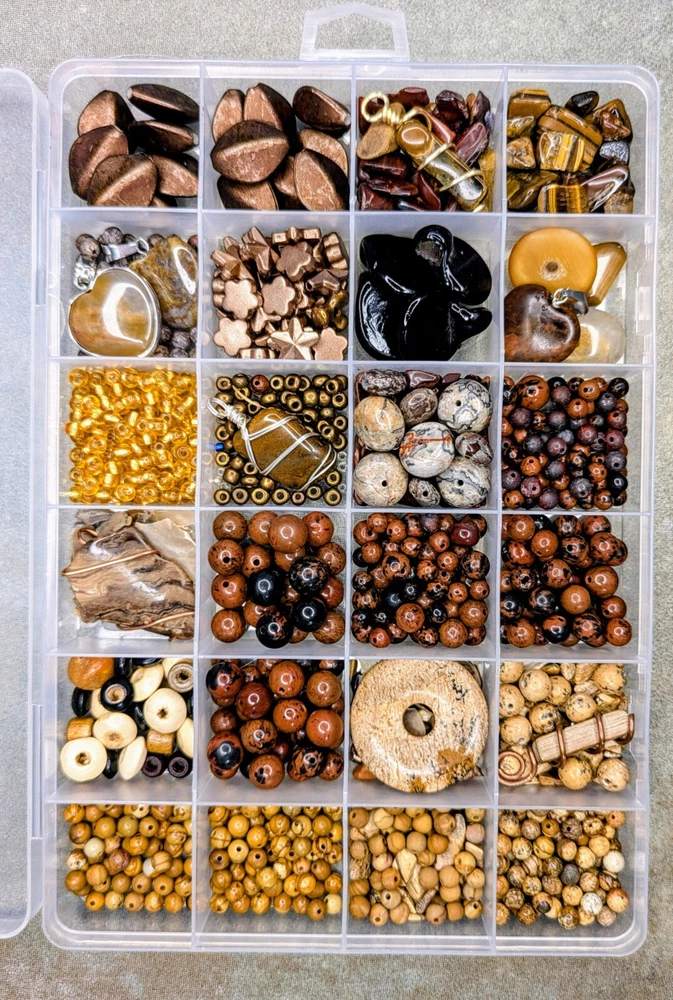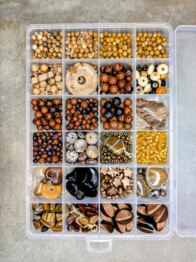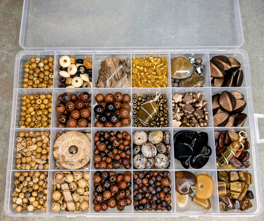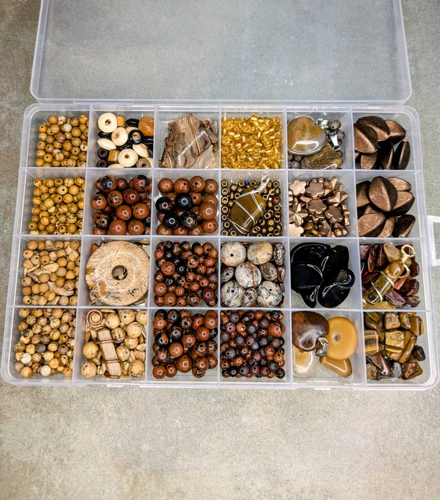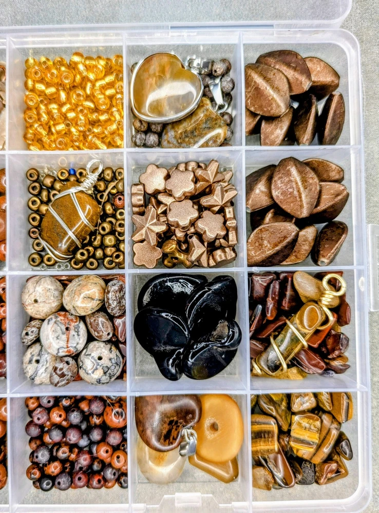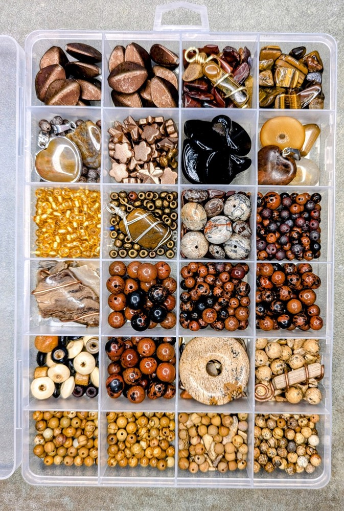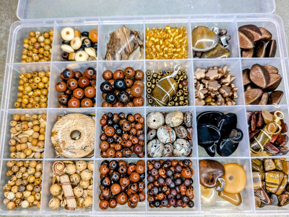 Huge Lot of Semi-precious gemstone beads. Reds & Browns. This lot contains but is not limited to: Mahogany Obsidian ranging from 3mm- 10mm in size. Wood grain Jasper & Picture Jasper in both shiny & matte in 4 & 6mm sizes. Petrified wood pendant - wire wrapped in copper. Gorgeous Large Agate Pendant wrapped in copper, picture Jasper pi-stone pendant/cabochon, large crazy lace agate rondelle beads. Approximately 16mm in size. There are sensory beads in this lot that are not gemstone. I'm not exactly certain what those are made of. Some bone beads, some vintage glass pendants, silver lined gold glass beads, other glass seed beads as well as chip stones. There is also a gorgeous wire wrapped Tiger's Eye Pendant wrapped in gold wire. Shipped from a smoke-free home through usps. I'm happy to combine orders to save on shipping costs. Savings based on actual costs of shipping. If you have any questions about shipping or the item itself, please feel free to message me at any time. I'm happy to answer any questions you might have. Selling only the beads and not the container. Any coins calipers and storage containers are for display purposes only and not part of the lot. Thank you so much for having a look! I hope you have a look at my other listings. Have a great day!!