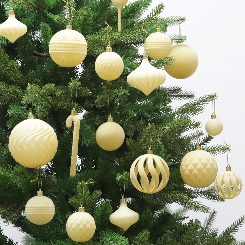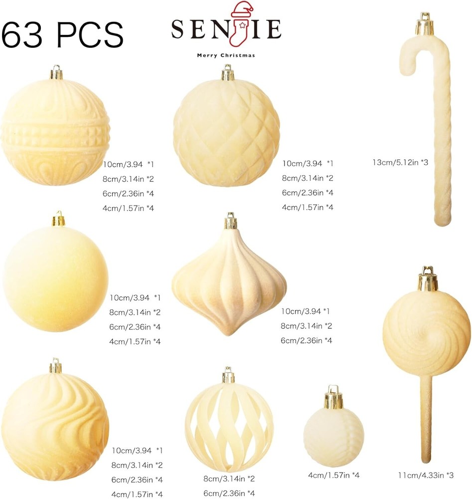 Senjie Christmas Tree Ornaments Velvet Balls,63PCS Bulk Khaki Flocked Decoration Balls Ornaments Sets for Christmas 2025 Package List: the package contains 63pcs of flocked Christmas ball ornaments, measuring approx 3.94/3.15/2.36/1.57/inches in diameter, khaki colors,not only classic styles,but also innovative styles,including five shapes and nice texture can fully meet your needs for decorating Easy to Hang: the velvet Christmas tree ornaments are equipped with a metal buckle and hanging rope,durable and reliable,easy to hang,offering functionality and aesthetics, adding a relaxing atmosphere to your house Flocked Design: the Christmas ornaments balls enjoy flocking texture,scattering these velvet Christmas hanging balls can create a retro and beautiful effect, transforming your home into a distinctive and elegant winter scene Reliable and Practical: the velvet Christmas ornaments balls are mainly made of quality plastic, with a flocking texture, not easy to fade, deform, break, and wear out, easy to hold, suitable for long time use, enhancing the aesthetics of your Christmas tree and overall festive decor for many festive seasons to come Versatile Occasions: the flocked Christmas tree ornament ball isn't restricted to tree decorating, you can also apply the ball on doors, Christmas trees, windows, walls, and porch in your living room, bedroom, fireplace, and other places, ideal for birthdays, Halloween, Christmas, and other festivals, making the festive atmosphere of the holiday spread in every corner of your space B0D62RLXDL