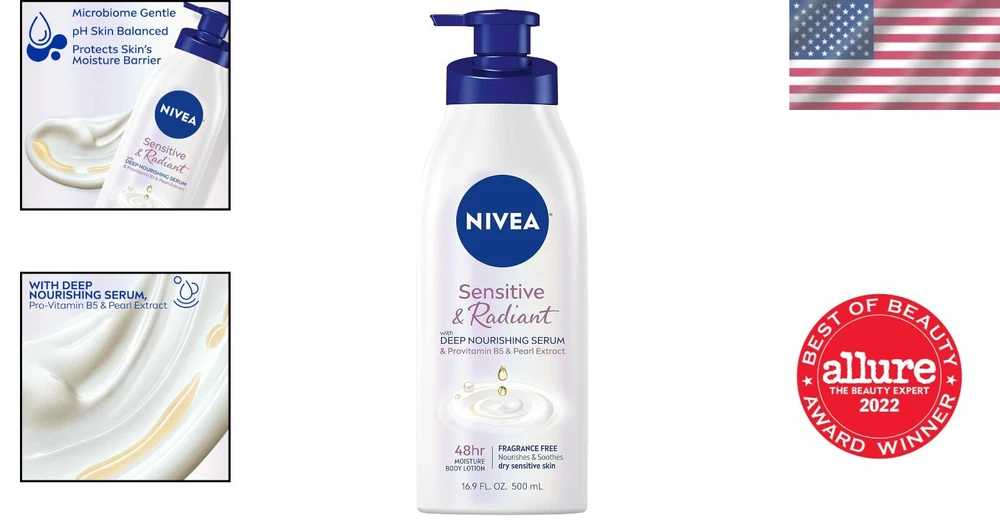 Department: Unisex Item Dimensions L X W X H: 3.27 X 1.97 X 9.45 Inches Sun Protection Factor (SPF): SPF 0 Product Dimensions: 3.27 X 1.97 X 9.45 Inches; 1.28 Pounds Body Area: Full Body, Hands, Feet Age Range (description): Adult gtin13: Does Not Apply Features: Hypoallergenic, Unscented, Skin pH Balanced, Dermatologically Tested, Free of Dyes, Free of Parabens, Gentle, 48-Hour Moisture Volume: 16.9 fl oz Formulation: Lotion Active Ingredients: Provitamin B5, Deep Nourishing Serum, Pearl Extract Item Volume: 16.9 Fluid Ounces Main Purpose: Moisturizer Skin Type: Sensitive Skin Color: Clear Special Feature: Hypoallergenic Scent: Unscented Ingredients: Provitamin B5, Deep Nourishing Serum, Pearl Extract Type: Daily Use Expiration Date: NIVEA Body Lotion for Sensitive Skin UPC: Does Not Apply Brand: Unbranded Size: 16.9 fl oz Set Includes: Pack of 1