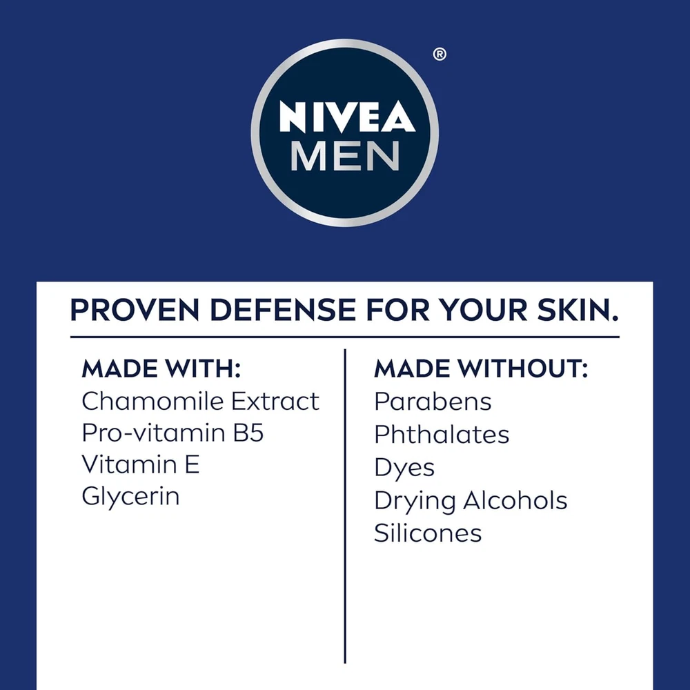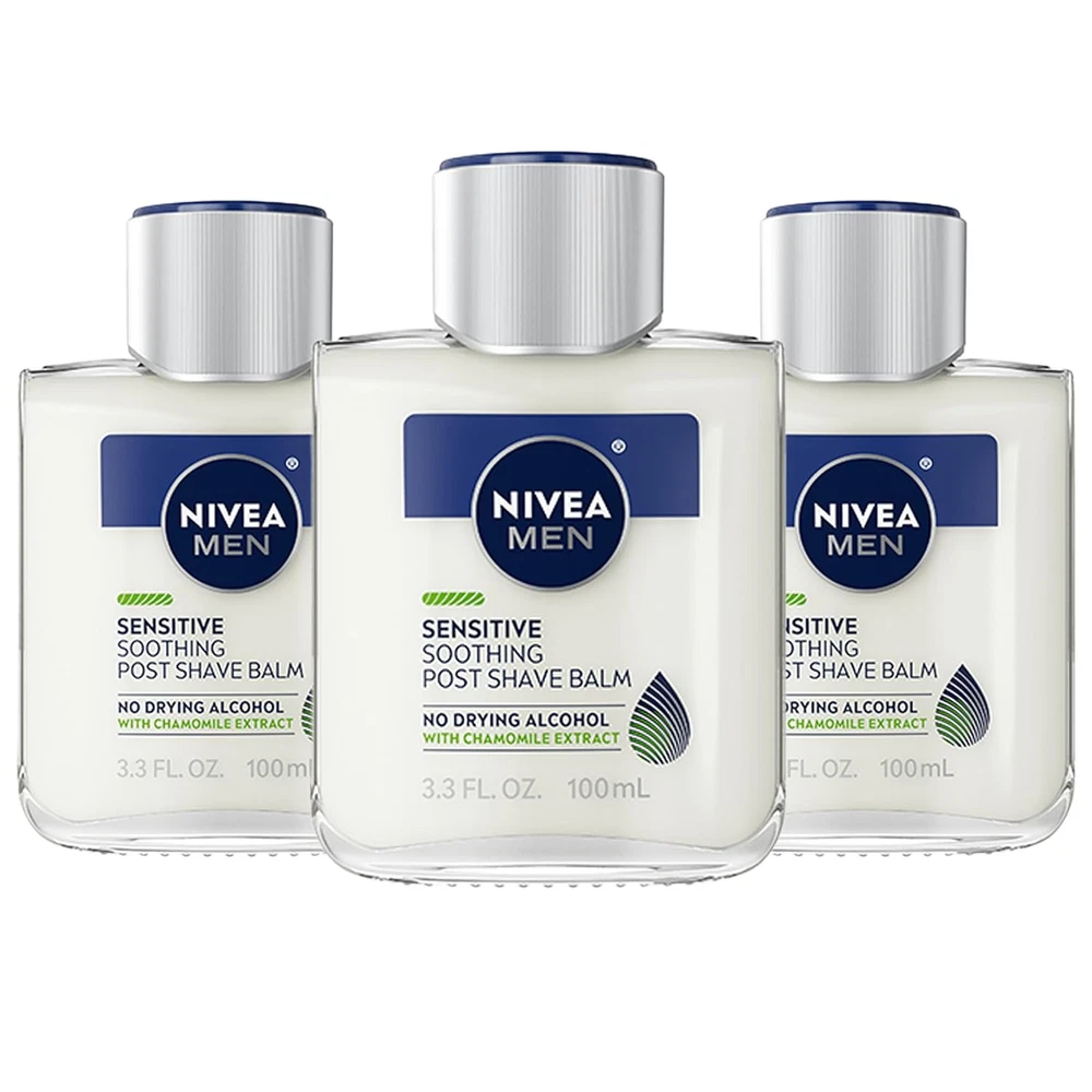VITAMIN E AND CHAMOMILE ENRICHED: Enriched with Vitamin E, Pro-Vitamin B5 and Chamomile extract, this aftershave for men helps calm and hydrate sensitive skin SOOTHES SENSITIVE SKIN: Soothes and moisturizes to protect sensitive skin from dryness after shaving QUICK ABSORPTION AND LIGHTWEIGHT FEEL: This lightweight aftershave balm for men is fast-absorbing, non-greasy, and has been dermatologically-tested on men with sensitive skin COMBATS 5 SIGNS OF SHAVE IRRITATION: Fights five signs of shaving irritation, including burning, micro cuts, dryness, tightness and stubble itch PERFECT FATHER'S DAY GIFTS: Treat any dad in your life to this NIVEA MEN Sensitive Soothing Post Shave Balm pack (3 x 3.3 fluid ounce bottles) ? the perfect skincare gifts for dad this Father's Day NIVEA MEN Sensitive Soothing Post Shave Balm is a proven defense for your skin. This extra gentle post shaving balm is specially formulated for men with sensitive skin, to help moisturize and protect your skin from dryness caused by/after shaving. NIVEA Sensitive Post Shave Balm for Men is enriched with Vitamin E, Pro-Vitamin B5 and soothing natural Chamomile extract to help calm and hydrate sensitive skin. A lightweight, fast-absorbing, non-sticky and non-greasy formula helps provide your skin with long-lasting moisturization for the ultimate skin comfort. This mens aftershave balm fights the five signs of shave irritation: burning, micro cuts, dryness, tightness and stubble itch. Free of parabens, dyes and drying alcohols, this after shave balm is suitable for daily use. This shaving balm is a key part of a skin and beard care routine and pairs well with NIVEA MEN Sensitive Shave Gel, Sensitive Face Wash and Sensitive Face Lotion with Broad Spectrum SPF 15 Sunscreen as part of a daily skincare regimen. To use, apply this aftershave balm for men liberally all over the face, beard and neck area after shaving or cleansing. With daily use of this after shave for men, skin feels comfortable, smooth, resilient and healthy-looking.
