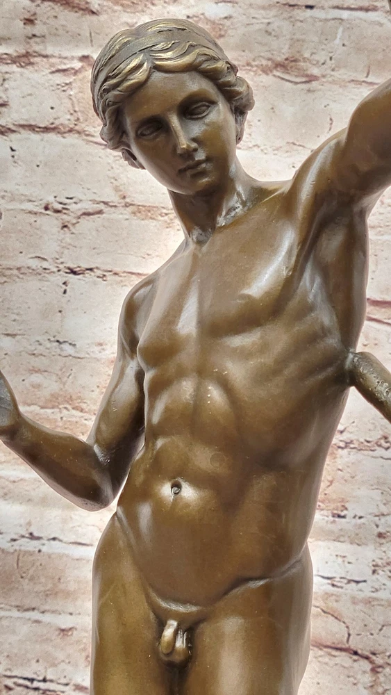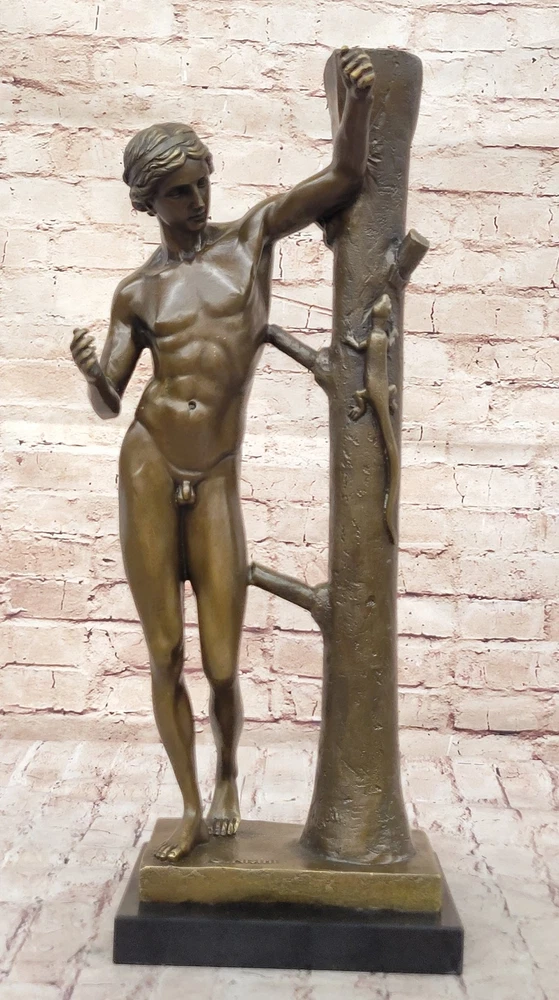Sensual Male Nude Greek God Collector Lizard Bronze Marble Statue Sculpture Gift Sensual Male Nude Greek God Collector Lizard Bronze Marble Statue Sculpture Gift Condition : This sculpture is in perfect condition. Bronze Dimensions with Marble Base: Height 21" X Width 9" Marble Dimensions:8" X 5" Height without base:20" Weight:18 LBS Inventory:44Y1968444 Mesmerizing Moment in Nature Transport yourself to the tranquility of a wooded garden with this mesmerizing bronze sculpture. Here, in the heart of nature, a nude male figure takes a leisurely stroll, his attention captivated by a lizard gracefully making its way up a tree. Enthralled by the lizard's graceful ascent, he pauses, resting his left forearm against the tree trunk, his gaze locked on the reptile's elegant climb towards the canopy above. Masterful Craftsmanship Crafted with meticulous precision, this bronze sculpture embodies the time-honored technique of lost-wax casting, ensuring that every intricate detail is faithfully preserved, guaranteeing its enduring beauty. Enhanced with a lustrous brown patina finish, it exudes an ageless charm that transcends time. Poised atop an elegant black marble base, this masterpiece bears the unmistakable signature of the renowned artist G. Nisini. Harmony and Serenity Let this enchanting sculpture introduce the wonders of the natural world into your surroundings, encapsulating a moment of profound curiosity and harmony between humanity and nature. Whether displayed in your home or office, it serves as a tangible reminder of the serenity and magic found in the unspoiled beauty of the great outdoors. G. NISINI NUDE MALE LEANING AGAINST TREE BRONZE STATUE SCULPTURE FIGURINE DECOR www.bronzhaus.com Video will open in a new window Using the eBay App? Paste link into a browser window: [isdntekvideo] Shipping Terms : Most of our items are shipped via USPS (United States Postal Service) mail or UPS. Most orders are shipped within 24-48 hours of purchase. Please be aware that not all items are available for USPS shipping due to size and weight. We do ship to Hawaii, Alaska, Canada, Puerto Rico, APO/AE, and U.S. Virgin Islands, however, an additional charge may be required. Please contact us before making any purchases in these areas. For Non-USA customers, you may be responsible for all duty, tax, brokerage fees that may be due upon delivery (shipping costs cover freight charges only). We also ship internationally. Please refer to the "Shipping and Handling" chart for the rates for each area. Payment : We accept just about any form of payment. PayPal, Master Card, Visa or American Express credit cards. Money orders, cashiers checks, and even personal or business checks. For governmental institutions, we will also accept a purchase order. Please understand that for personal or business checks we have to wait for the check to clear (usually 7 days) before shipping. Condition : New Detailed Hand Crafted Hot Cast Bronze Satisfaction Guaranteed. This is Stock Photo, Slight Color Variation!! Listing and template services provided by inkFrog