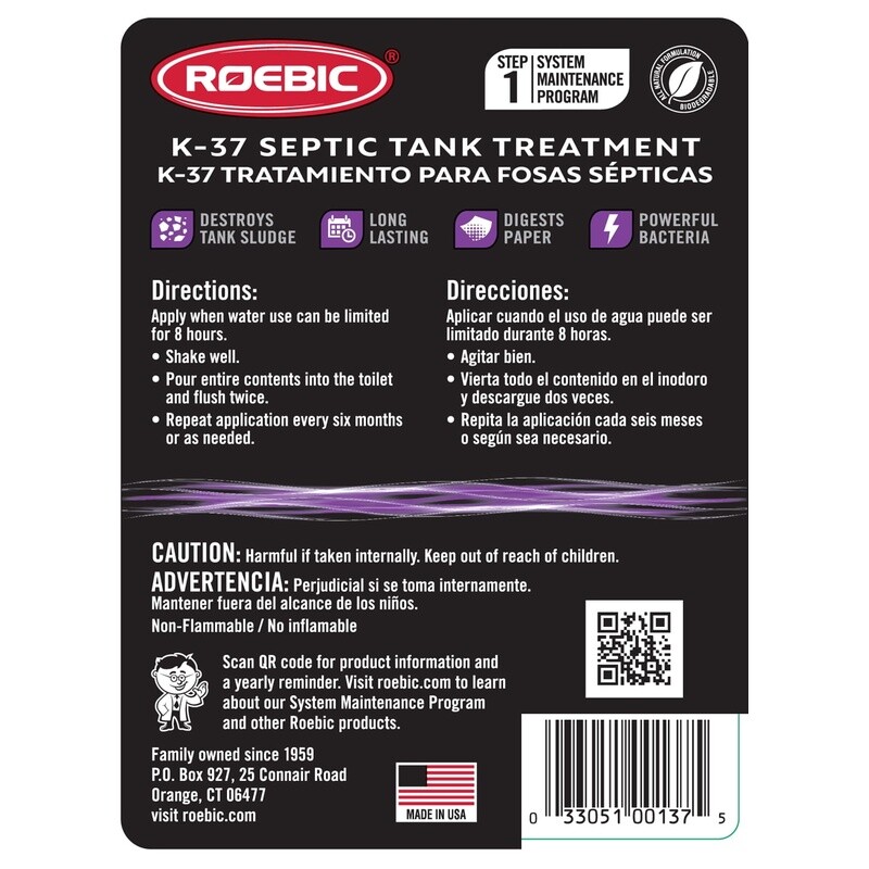You may also like 2 Pack Max Gel Drain Clog Remover Professional Strength Thick Formula Safe Pipes 38.98 USD 41.03 USD Free shipping 5% off Oxy Power Degreaser Liquid Dish Soap 70oz Tough Grease Fighter Fresh Scent New 11.67 USD 12.28 USD Free shipping 5% off Roebic K-37 Septic Tank Treatment prevents clogging of inlets and outlets, build up in the tank, overflowing receptacles and unpleasant odors. Use regularly to keep your septic tank in excellent condition. It easy to use, simply shake well and pour the entire contents of the bottle into your toilet and flush twice. Use this twice a year, or as needed, to keep your tank running optimally. Roebic has been a trusted brand providing products to maintain septic tanks since 1959. Septic Tank Treatment is formulated with RoeTech, Rebic's exclusive bacteria to break down sewage waste. It is a blend of beneficial bacteria that thrive in a "septic" environment (low oxygen, high nitrate), and through their metabolic activities they accelerate the breakdown of sewage waste, which helps to keep your septic tank functioning properly. Using K-37 is a natural way to keep your system clean, there are no harsh chemicals that can destroy the natural balance needed by your septic tank to work properly. It is safe to use in all pipes and for the environment. Safe for all plumbing, works in septic tanks and drain fields. Prevents clogging, odors, and overflowing receptacles Restores natural balance, promotes rapid breakdown of solids, reduces sludge, scum levels, odors, and clogs for efficient system operation Patented Roetech bacteria keeps system running smoothly, prevents common septic problems, and ensures efficient operation Economical and easy to use. Treats a 500-gallon septic tank, lasting for a full year. Maintains system efficiency Biodegradable, safe for the environment. Contains aerobic, spore-bearing bacteria resistant to soaps and detergents You may also like Portable 2 Pc Gun Rests Adjustable Slip Resistant Lightweight Support Rubber New 29.18 USD 30.72 USD Free shipping 5% off Butter Powder 2 Lbs Shelf Stable Cooking Baking Emergency Food Gluten Free New 29.14 USD 30.67 USD Free shipping 5% off Milano Bean Bag Chair Comfortable Durable Smart Max Fabric Versatile Kids Gaming 88.33 USD 92.98 USD Free shipping 5% off Waterproof Marine Dry Box Lockable Outdoor Storage Gear Boat Fishing Travel New 36.06 USD 37.96 USD Free shipping 5% off Plush Bean Bag Chair Refillable Compact Durable Lightweight Comfort Turquoise US 49.28 USD 51.87 USD Free shipping 5% off Dry Dog Food Beef Chicken Flavor 45 Lb Kibble Balanced Nutrition Antioxidants US 33.05 USD 34.79 USD Free shipping 5% off 24 Can Zipperless Cooler Soft Sided Leak Proof Insulated Durable Carrying Strap 36.73 USD 38.66 USD Free shipping 5% off Rifle Soft Case 42" Durable Polyester Foam Padding Protective Zipper Lock Navy 28.82 USD 30.34 USD Free shipping 5% off 8qt Stainless Steel Stock Pot W/ Lid Dishwasher Oven Safe Induction Cookware New 34.2 USD 36.0 USD Free shipping 5% off Turbo Force Table Fan 3 Speed 90° Pivot Quiet Air Circulator Wall Mount Plastic 26.84 USD 28.25 USD Free shipping 5% off Low VOC Interior Paint Washable Good Hide Coverage Certified Eggshell 1gal New 25.7 USD 27.05 USD Free shipping 5% off 3qt Electric Indoor Grill Nonstick Portable 3 In 1 Cook Steamer Sear Slow Cook 38.1 USD 40.11 USD Free shipping 5% off
