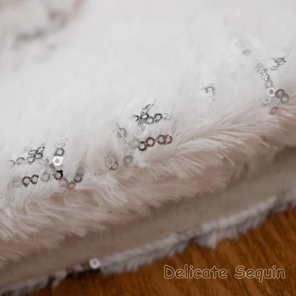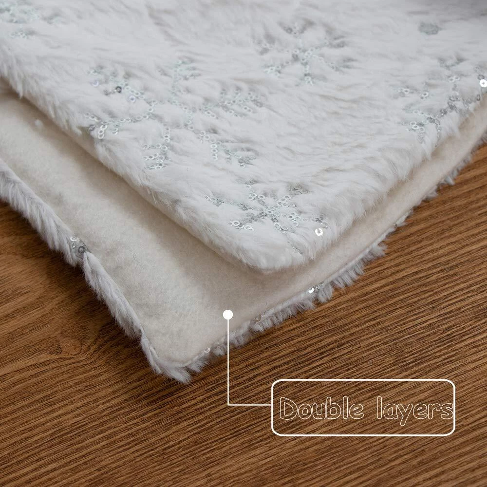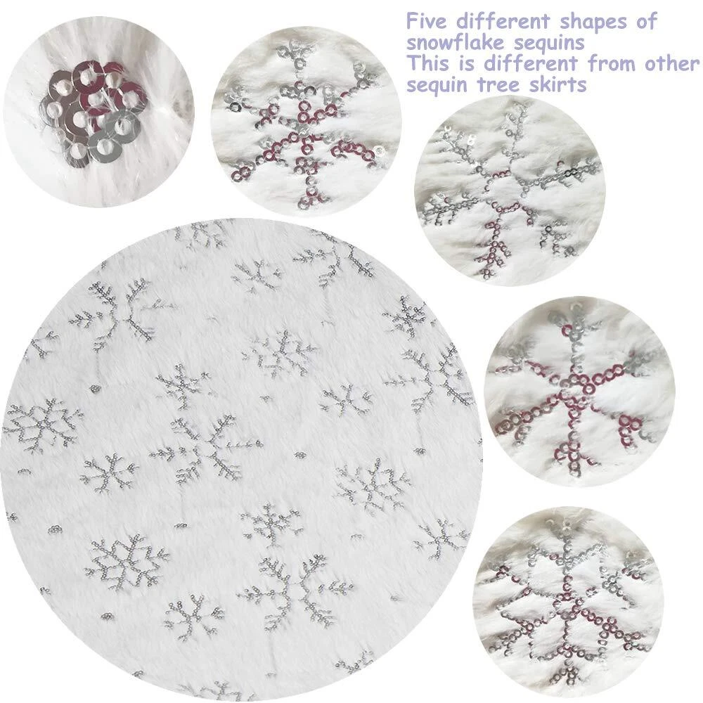 The gorgeous tree skirt is designed with a hand-made silver snowflake. No tree is complete without a beautiful tree skirt. This Christmas tree skirt fits any size tree and drapes nicely over your tree stand. This evocative tree skirt captures the of Christmas Eve. White plush and silver snowflakes form a perfect Christmas scene. The skirt creates a warm and soft feel, perfect for any cozy Christmas theme. This tree skirt features a white background accented with snowflakes of different sizes that accent the entire tree skirt. Material: Double Layers (Front is White Faux Fur; Back is Polyester) Diameter: 24 Inches; 32 Inches; 48 Inches Design: White Faux Fur Sequin Snowflakes Soft and Warm Double Layers It made with white faux fur for a warm look and feel. Double Layers. Three tapes closures round this piece out with a handy touch for keeping your tree wrapped up. This tree skirt has an allover design with sequin snowflakes adornments for an extra festive touch. Add the perfect finishing touch to your Christmas tree with this tree skirt with sequin snowflakes. Add this traditional Christmas tree skirt to your decor to add a splash of beauty to your home.Its sequin design is accented with snowflake appliques for a festive touch. Our cozy plush tree skirt is a simple and festive way to dress up a tree and protect floors from fallen needles. Bring the tasteful holiday look with this faux fur luxury christmas tree skirt. This tree skirt is jolly, merry, festive, joyful, and full of Christmas cheer. A timeless and fun design that you will cherish as part of your Christmas decorations.
