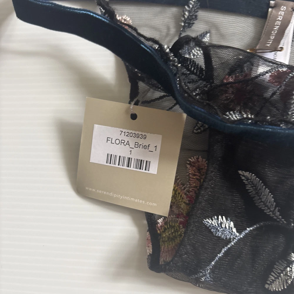 Serendipity presents a size 2 black thong with floral embroidery on mesh fabric. This women's panty features a thong/string style with a flower theme, offering stretch and breathability for comfort. Perfect for those who appreciate delicate accents in their intimates.