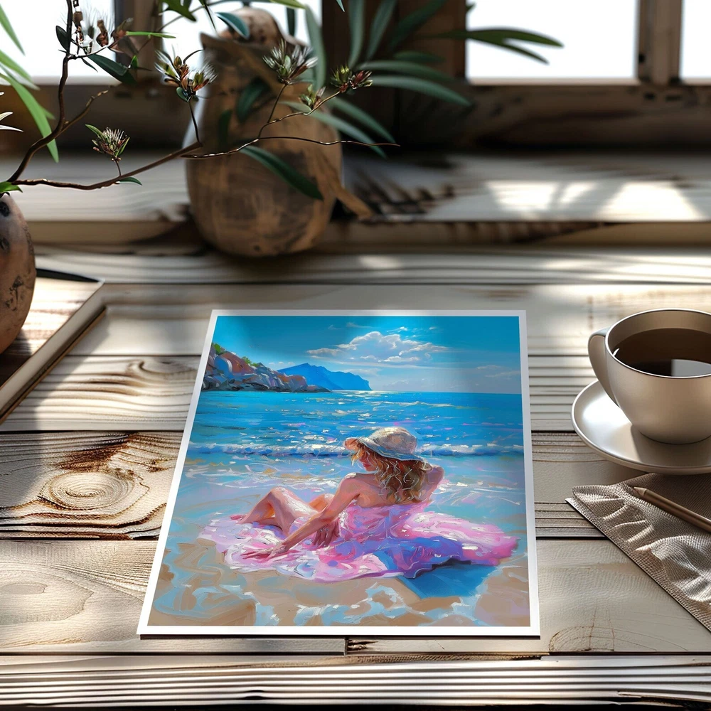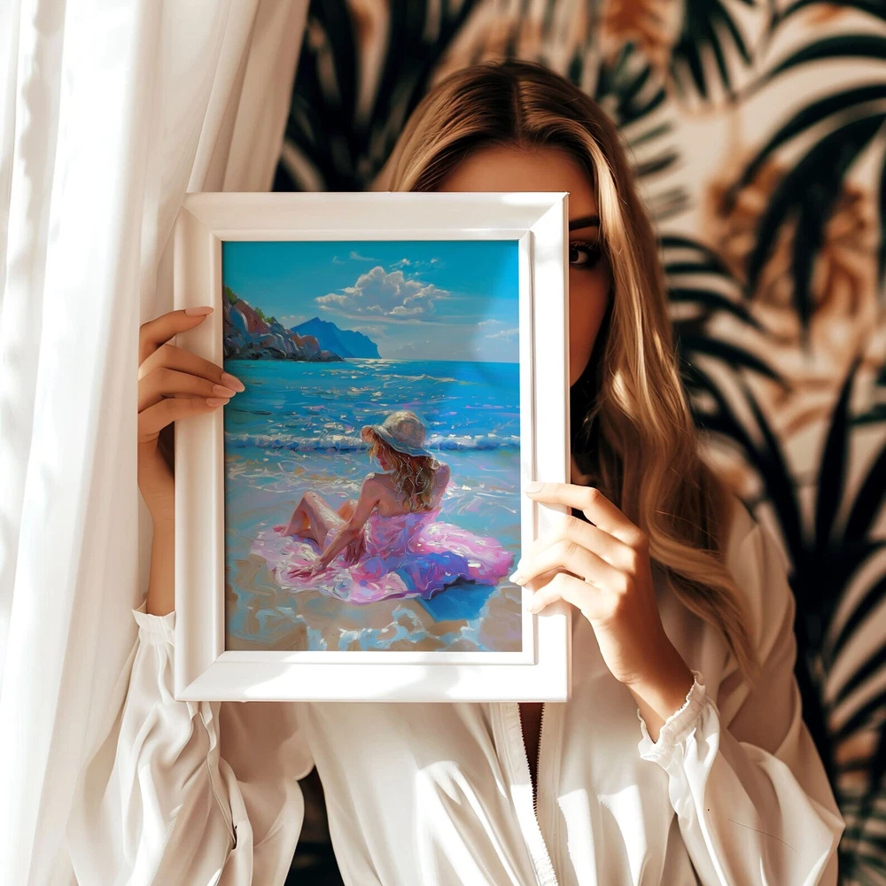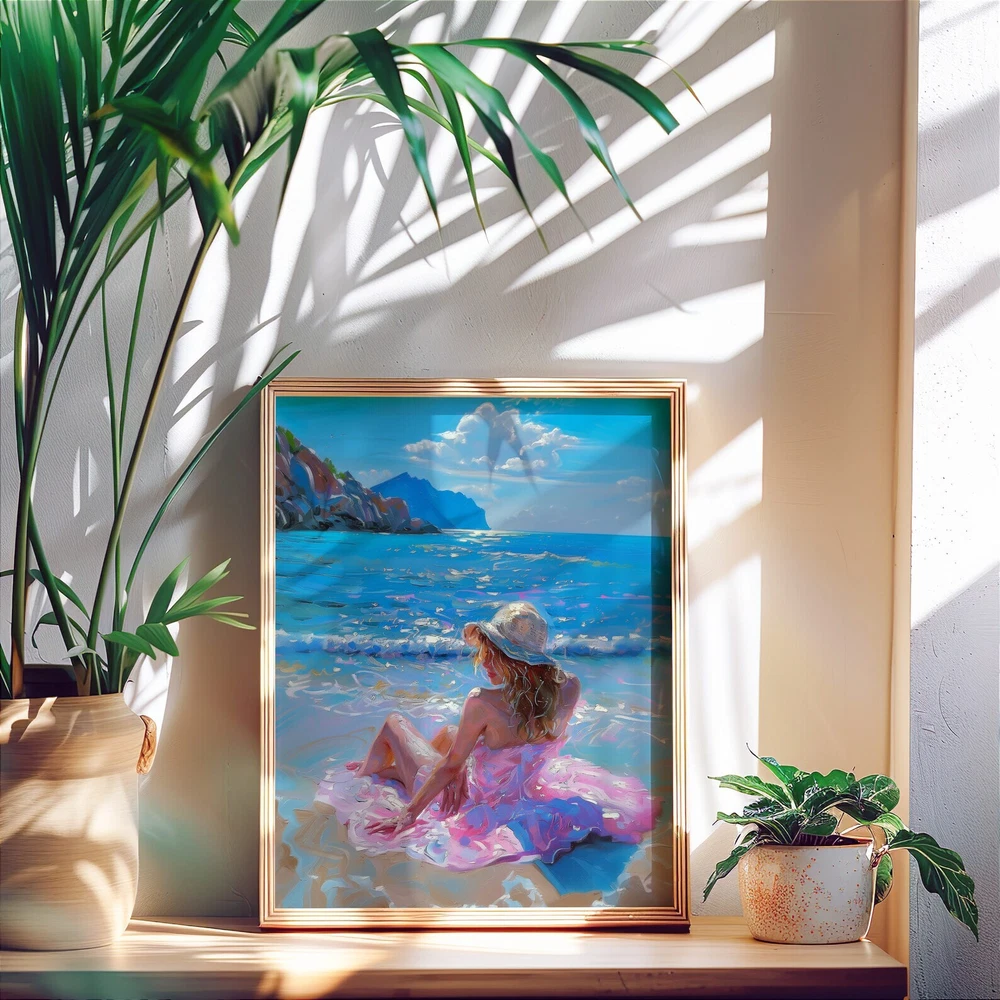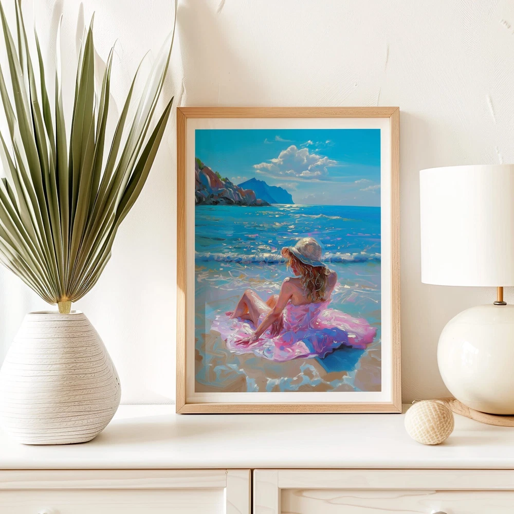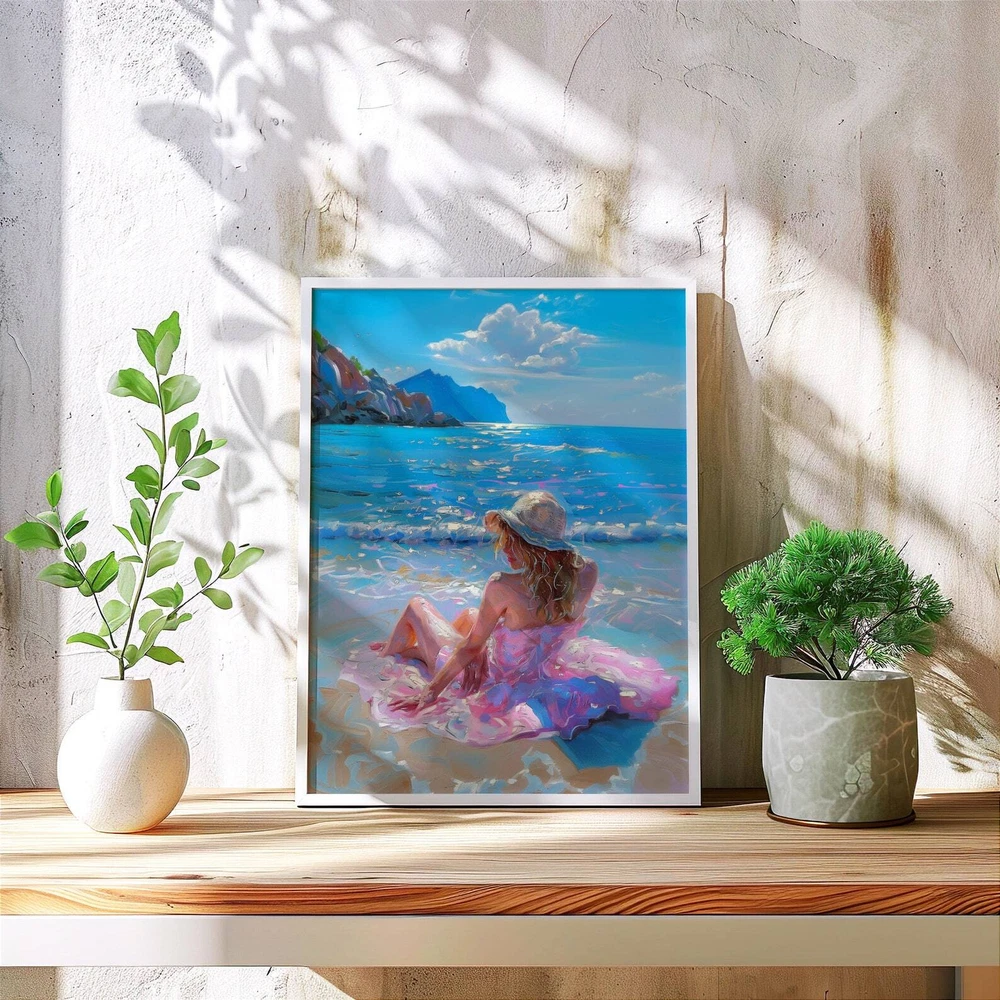 Serene Beach Scene With Woman In Hat Coastal Art Print Ocean View Wall Decor Summer Beach Art Material: Premium luster photo paper Print type: Inkjet printing One side printed + The finish provides the highest possible resolution and color saturation + Lasts up to 200 years in color and 400 years in black-and-white + Printed on high-quality resin-coated photo base paper medium + Posters can be hung with double-sided tape, tacks, or framed + Hand washing with a gentle cry cloth is recommended for extended durability I will hand select the best choice of paper for your chosen design to ensure top quality results for a beautiful, bright and luxurious print. All prints are sealed in cellophane slips for protection during transportation, and are shipped in a protective cardboard envelope.