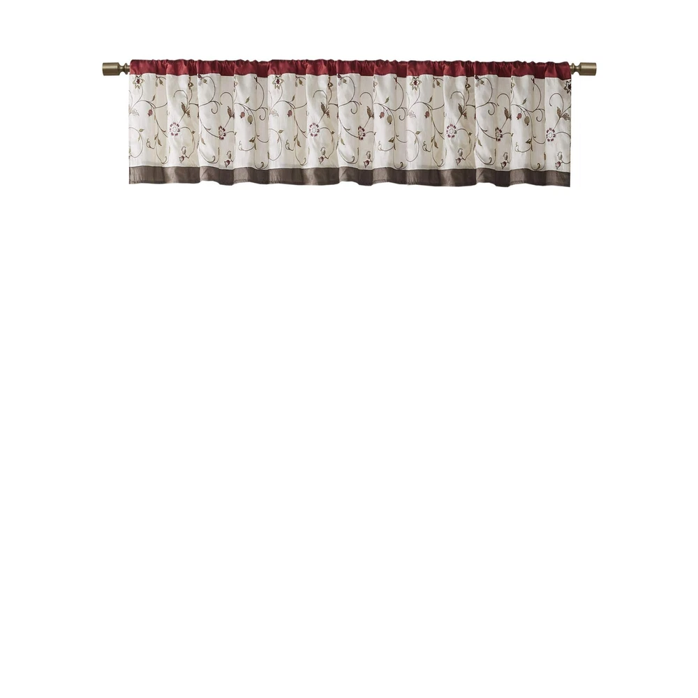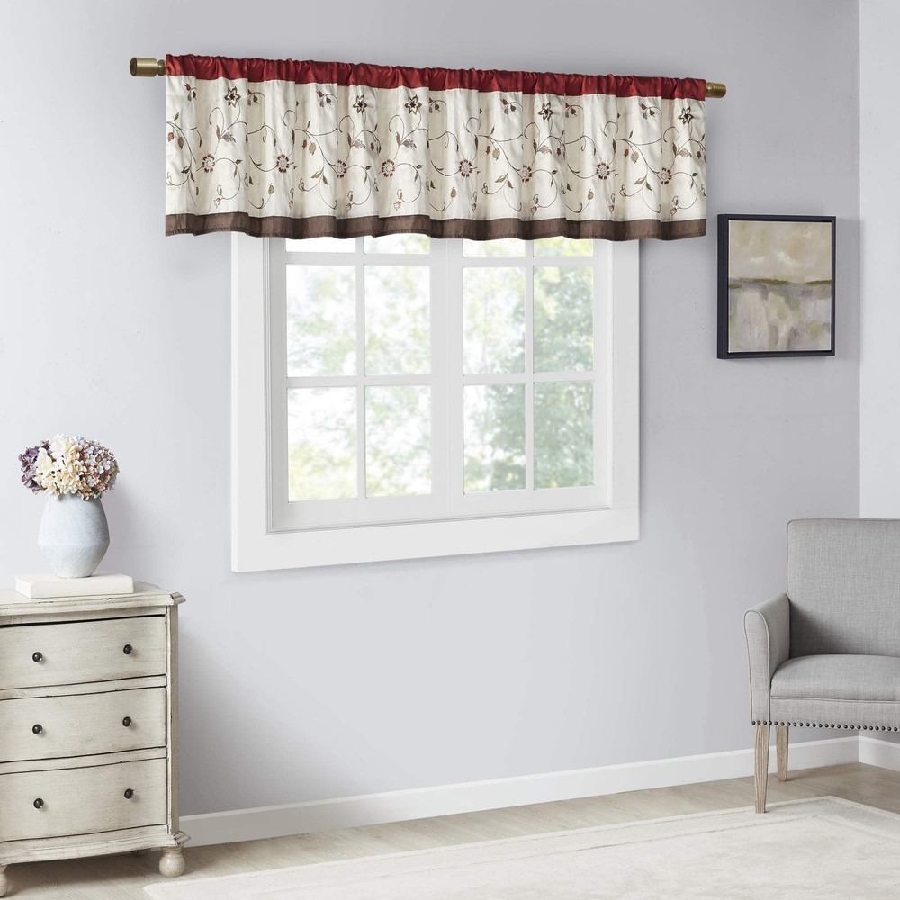 Set Includes: 1 Window Valance This valance features delicate floral embroidery in rust spice and neutral hues, offering beautiful contrast for a sophisticated look. The pieced and pleated details provide extra dimension and charm to your home decor, while added lining helps filter the perfect amount of sunlight into your home. Simply hang on 3" rod pocket, fits up to a 1. 25" diameter rod. Care Instructions: Machine Washable