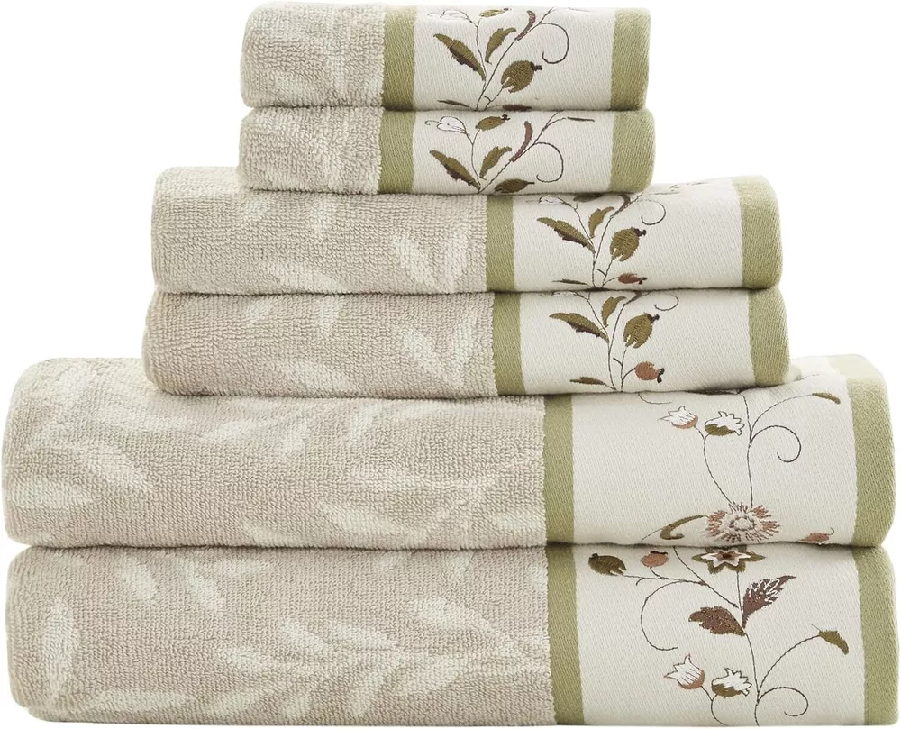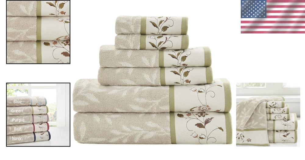 Type: Bath Towel Size: Multiple Sizes Material: 100% Cotton Assembly Required: No Item Thickness: Medium Personalize: No Product Care Instructions: Machine Washable Theme: Floral gtin13: Does Not Apply Brand: Unbranded Pattern: Floral Unit Count: 6.0 Count Number Of Items: 1 Number Of Pieces: 6 Fabric Type: 100% Cotton Care Instructions: Machine Wash, Do Not Iron, Do Not Tumble Dry, Dry Clean Only UPC: Does Not Apply Department: Adults Towel Form Type: Bath Towel Features: Embroidered, Jacquard, OEKO-TEX Certified Item Weight: 3.1 Pounds Package Type: Standard Packaging Softness: Soft, Extra Soft GSM (Grams per Square Meter): 600-900 GSM Age Range (description): Adult Room: Bathroom, Any Room Set Includes: Bath Towel, Hand Towel, Fingertip Towel Number of Items in Set: Six-Piece Batteries Required: No Included Components: 2 Bath Towels, 2 Hand Towels, 2 Fingertip Towels Color: Green Product Dimensions: 52"l X 27"w Shape: Rectangle Special Feature: Embroidered Volume: 1 Milliliters