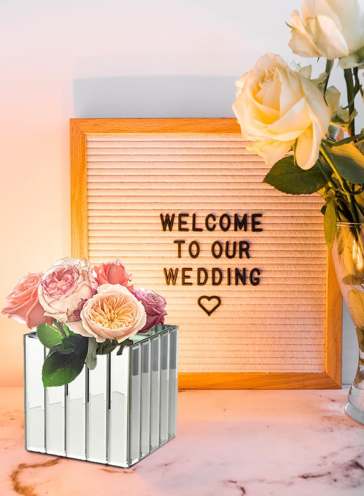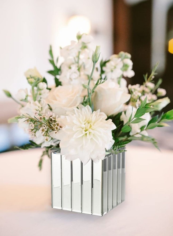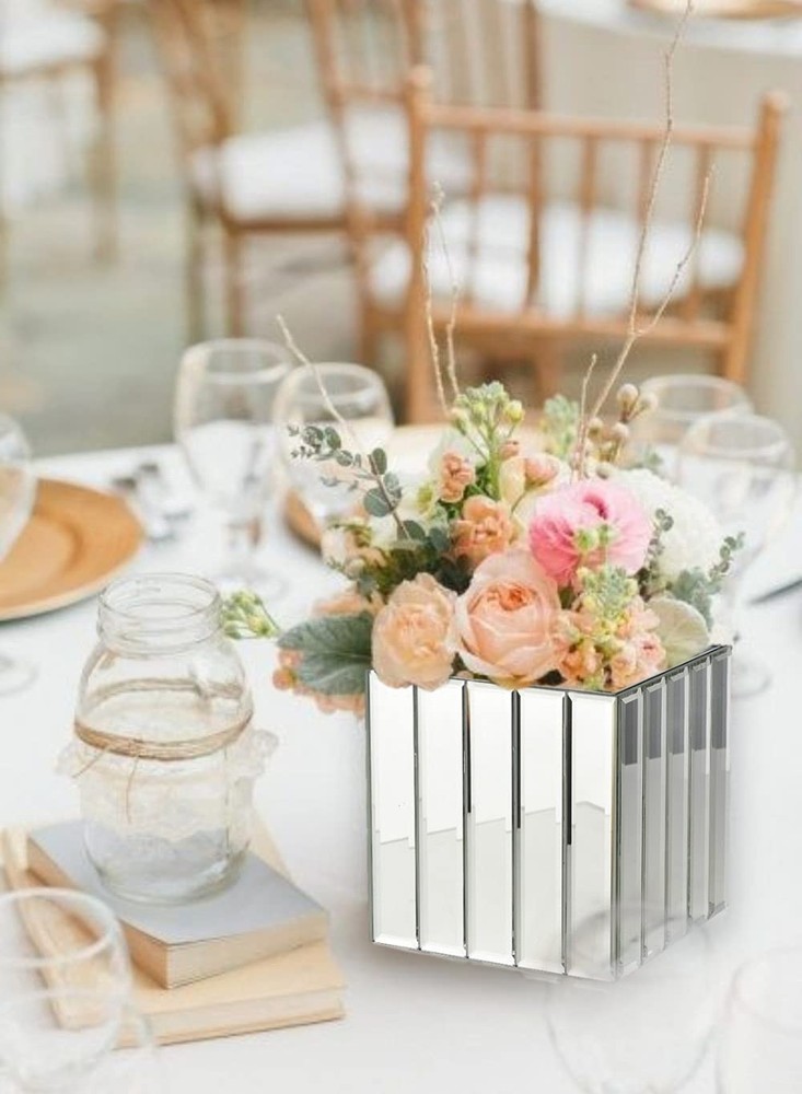 Mirrored Vase - The art deco style heavy cube vase features mirrored glass strips on each side of the exterior for a stylish design. Sold as a set of 6. Heavy Cubes - The 5.75-inch cube shape of the vase also could be used as a votive holder for a candle thanks to its weight, and a smaller vase is available separately Multiple Use Cases - The style of the cube vase will work well in your home, at a wedding, in a restaurant or almost anywhere Modern Design - The art deco cube vase includes a mirror panel on each of the four interior walls, which yields a modern design look Add a Floral Bouquet - To complete the serene look this mirrored cube vase provides, add some simple artificial flowers or greenery