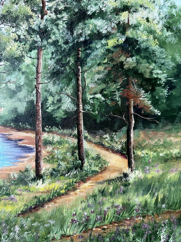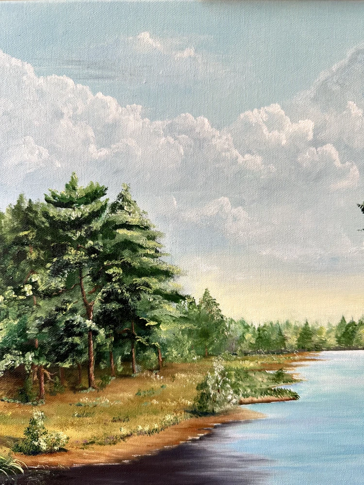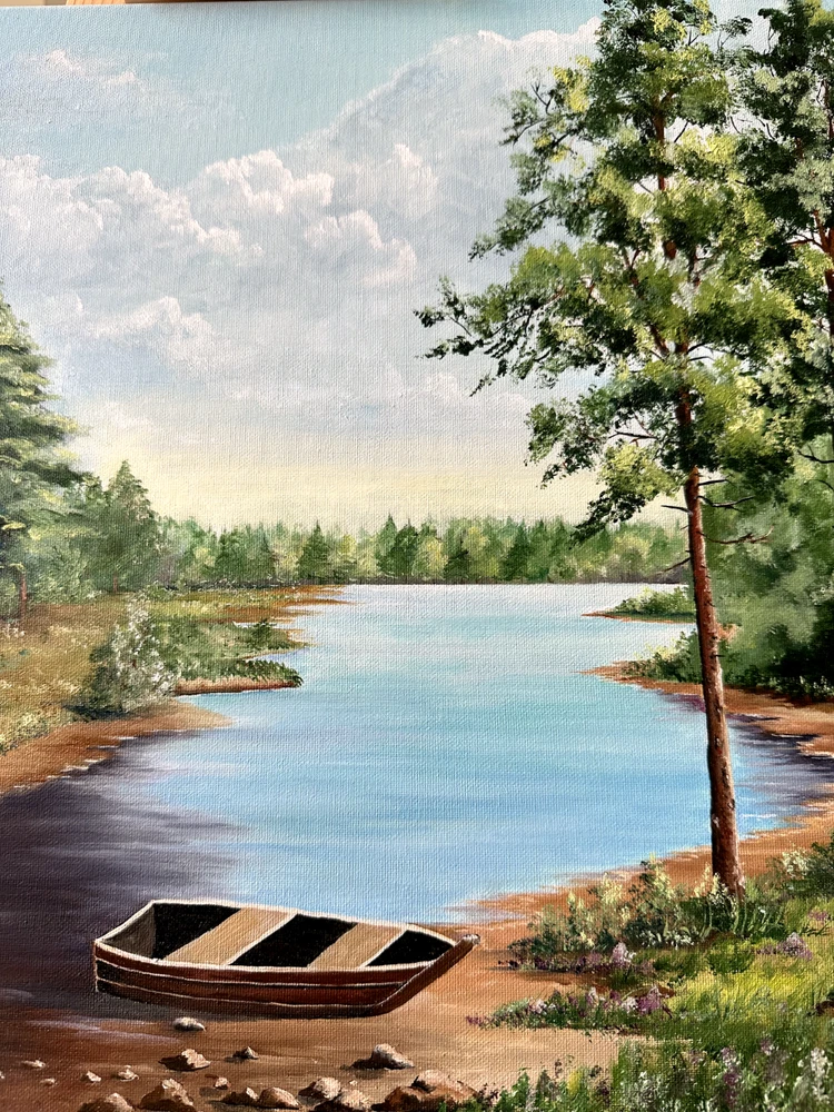 This serene landscape painting captures the peaceful beauty of a quiet riverside. A wooden boat rests on the sandy shore, surrounded by lush green trees and soft grasses, under a bright blue sky with fluffy white clouds. Perfect for adding a sense of calm and natural beauty to any space, this artwork invites viewers to pause and appreciate the tranquility of nature's embrace.