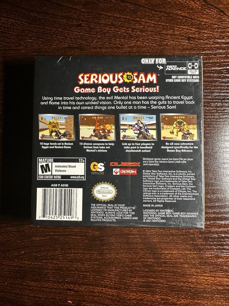 Release Year:2004UPC:0710425251498Genre:ShooterRegion Code:NTSC-U/C (US/Canada)Rating:M - MatureVideo Game Series:Serious Sam SeriesGame Name:Serious Sam AdvancePlatform:Nintendo Game Boy Advancegtin13:0710425251498Publisher:Gotham GamesCountry of Origin:Japan