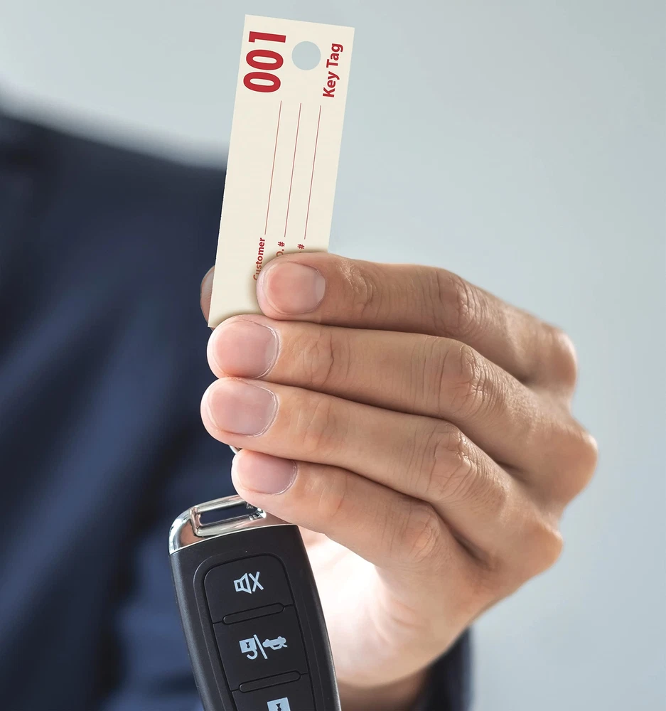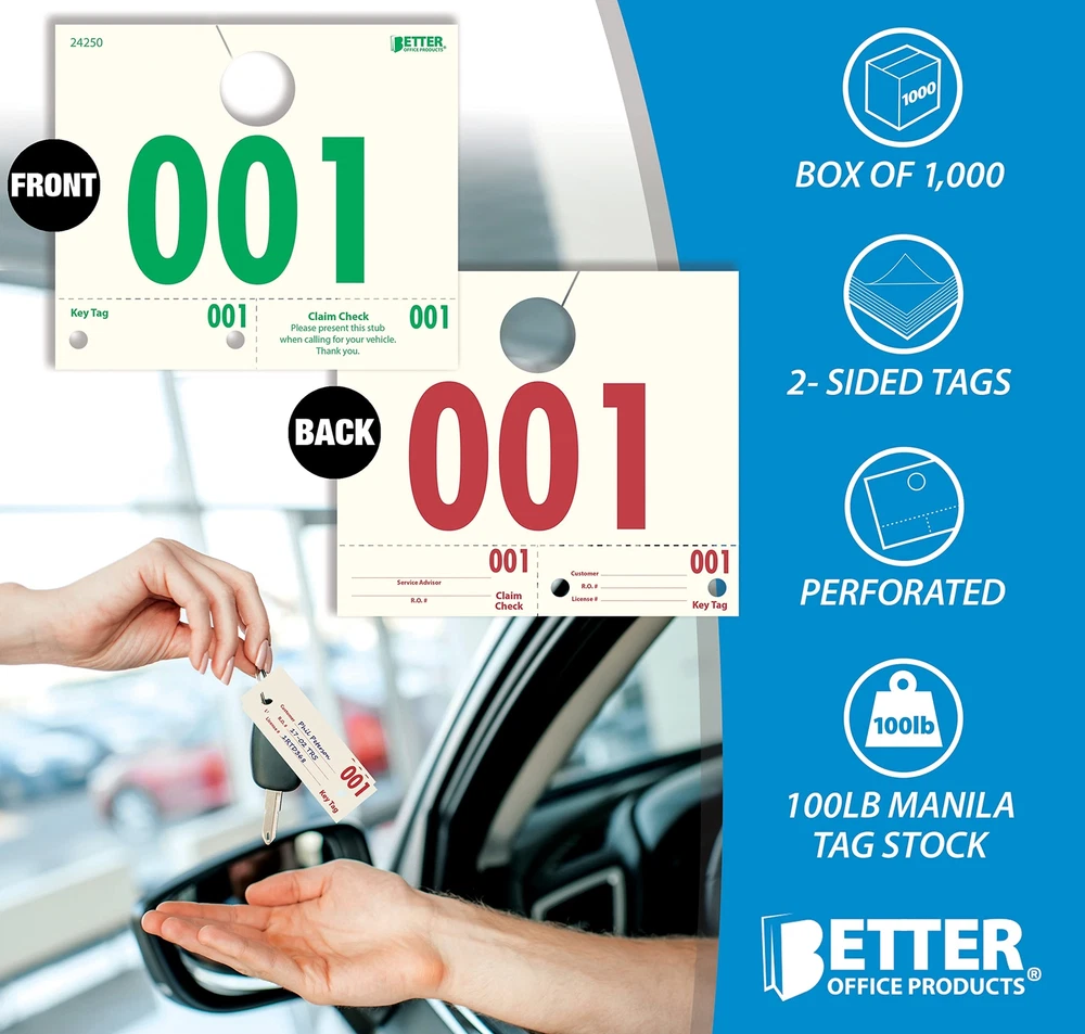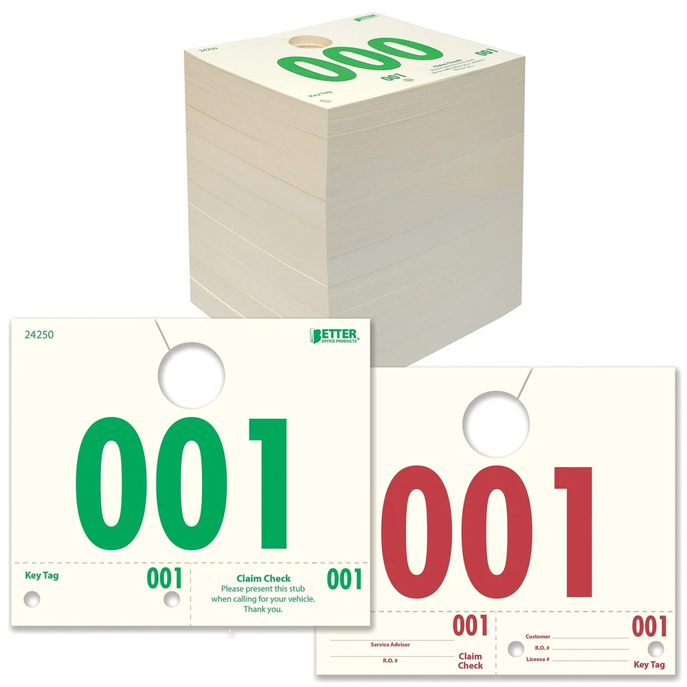 Complete auto service dispatch management hang tags, 6" x 7"; 3-part double-sided tags that are printed in RED on one side and GREEN on the opposite side using color coding as a visual aid to decipher whether cars are in-service or ready for pick up. Perforated tags have tear-away Key Tag and Claim Check, each with ample space to write in all pertinent auto and customer information per printed -outs. Box contains 10 pads of 100 tags for easy distribution. 1,000 NUMBERED TAGS - Consecutively numbered 6" x 7" tags from 000-999 (10 pads of 100 tags per box for easy distribution) SERVICE DISPATCH MANAGEMENT - 3-Part perforated sheets with large hanging mirror tag, key tag, and claim check, all parts stamped with the same # DOUBLE-SIDED - Red text on one side and green on the other side CUSTOMIZE - Key Tag and Claim Check tear-offs have lines to write in important auto and customer ID info. EASILY READABLE - Large numbers in vibrant colors to increase visibility from a distance
