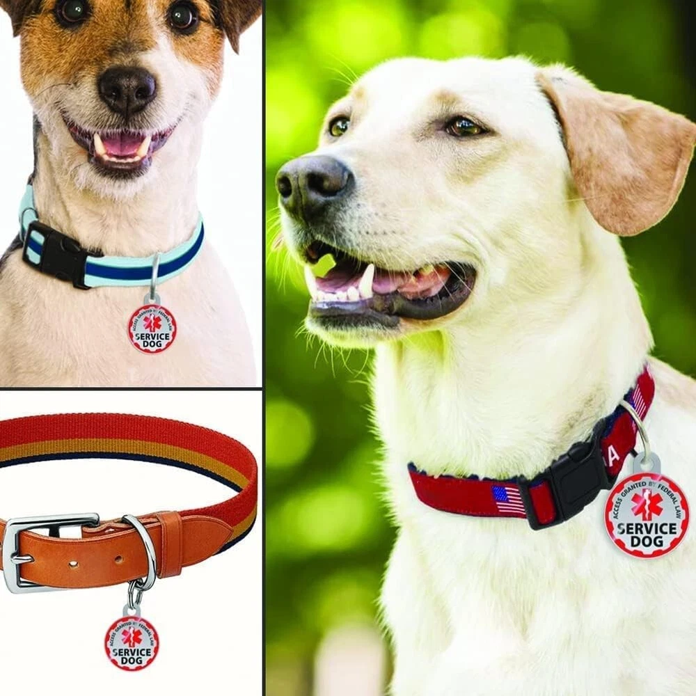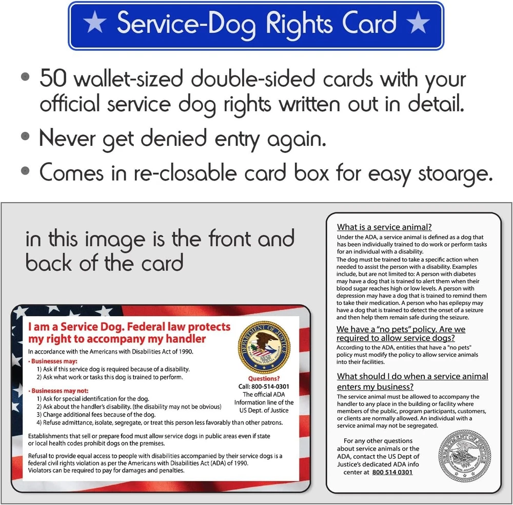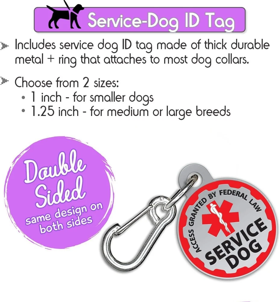 Service Dog ID Tag + 50 ADA Information Cards - Metal Dog Tag is Double-Sided Product Details: Service dog cards and tag for your K9 accessories so you can have certification to enter establishments without your rights being taken away. Good for service animals as defined by federal law, not recommended for service dogs in training, ESA, therapy dogs, or emotional support dogs. CHOOSE FROM 2 SIZE ID TAGS - 1 inch for smaller dogs, 1.25 inch for medium and larger dogs. Easily attaches to harness, vest, or collar includes a clip that fits onto any collar. 2-sided thick metal material ensures that the fact is always seen and wont get ruined with wear and tear 50 High quality cards with all your federal government rights written on both sides. Includes box to hold the cards so they wont get ruined. ADA cards are similar size to credit-card and will fit in your wallet so you always have it when you need it These accessories can be used in addition to, or instead of, a vest, patch, or other identifiers. When you present the card or ID tag, you DO NOT need to provide any other proof or identification for you animal