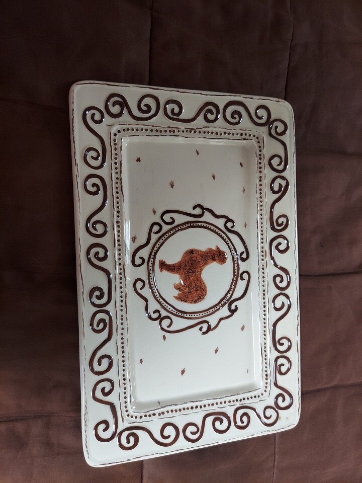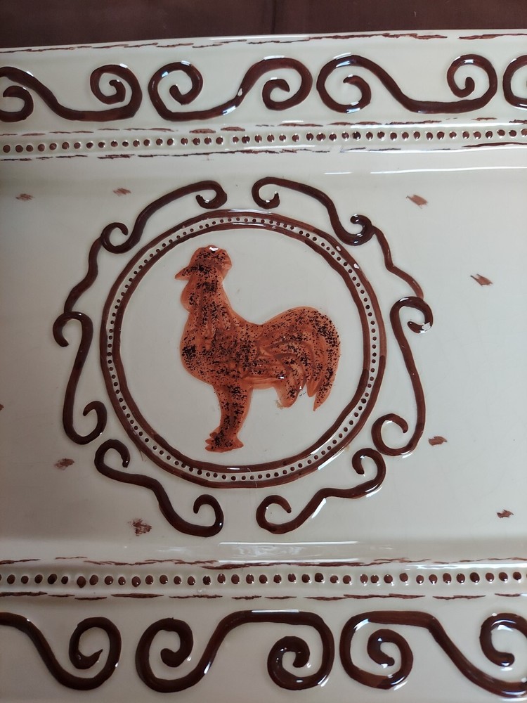 This rustic serving platter features a colorful rooster design, hand-painted on porcelain and ceramic materials. The large rectangle shape measures 20 inches in length and 12 inches in width, with a 3-inch depth and a stand for easy display. Perfect for all occasions, this platter is ideal for serving farm-themed dishes or as a decorative piece in your kitchen. The black wood tone and painted finish add a touch of country style to your home. This unit is sold as a single serving platter, with no personalization options available.