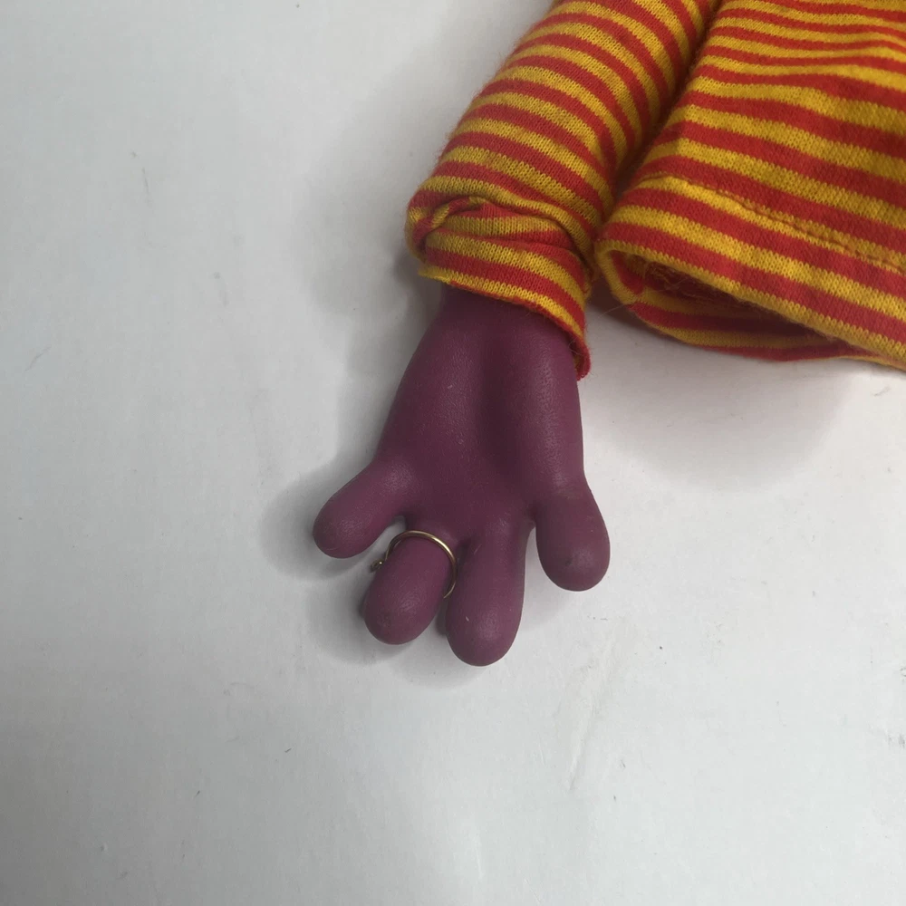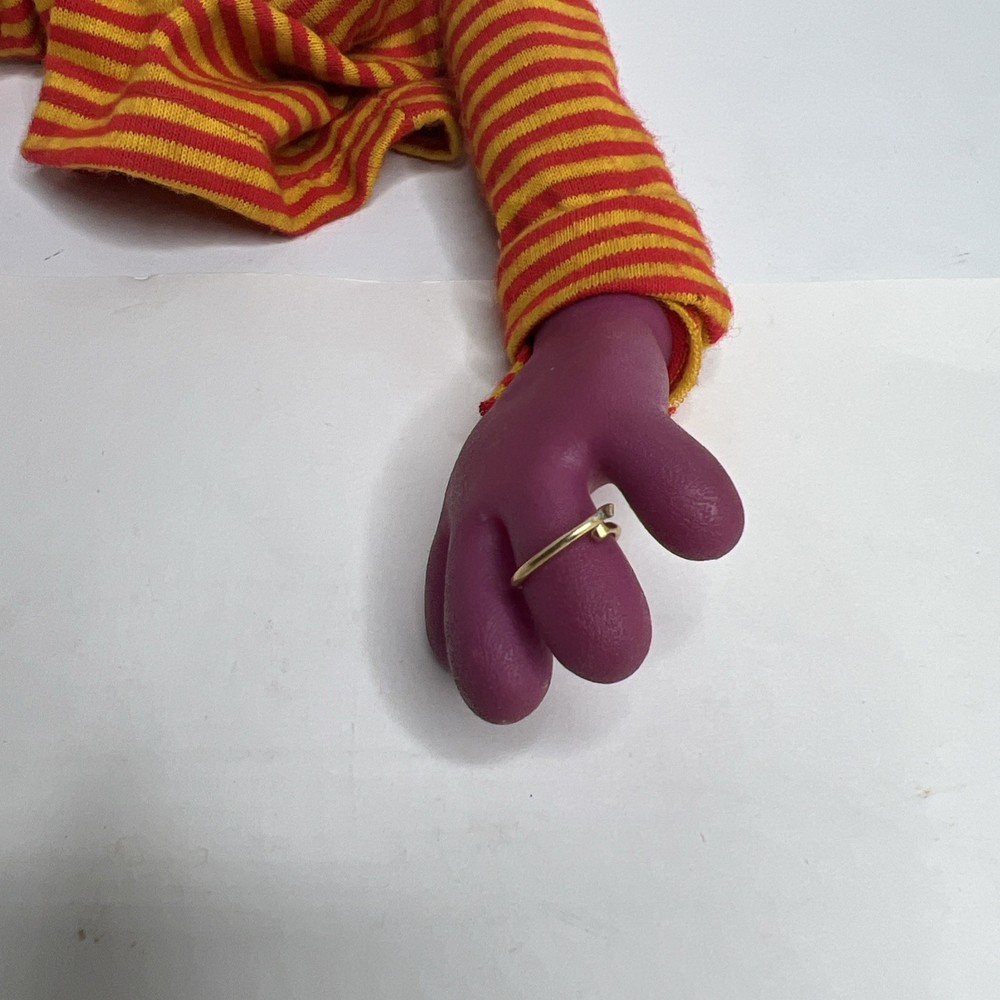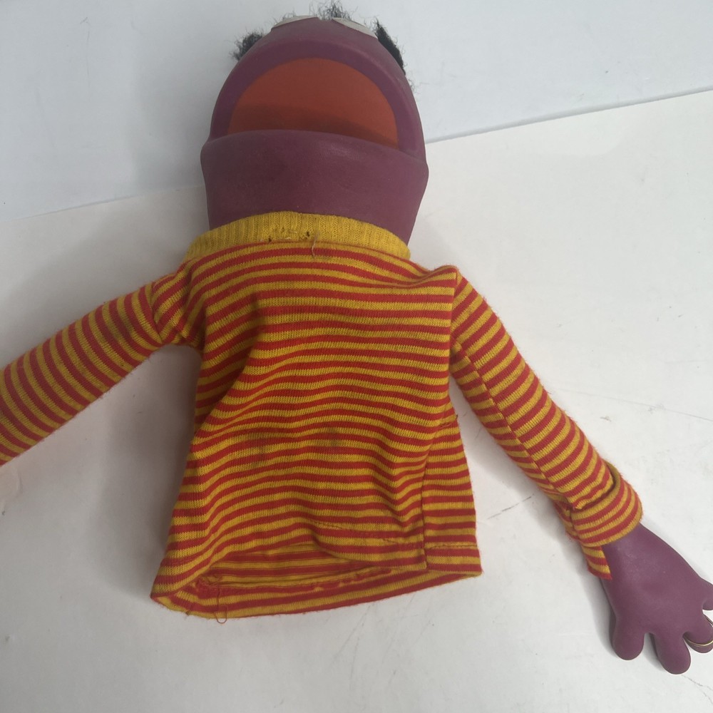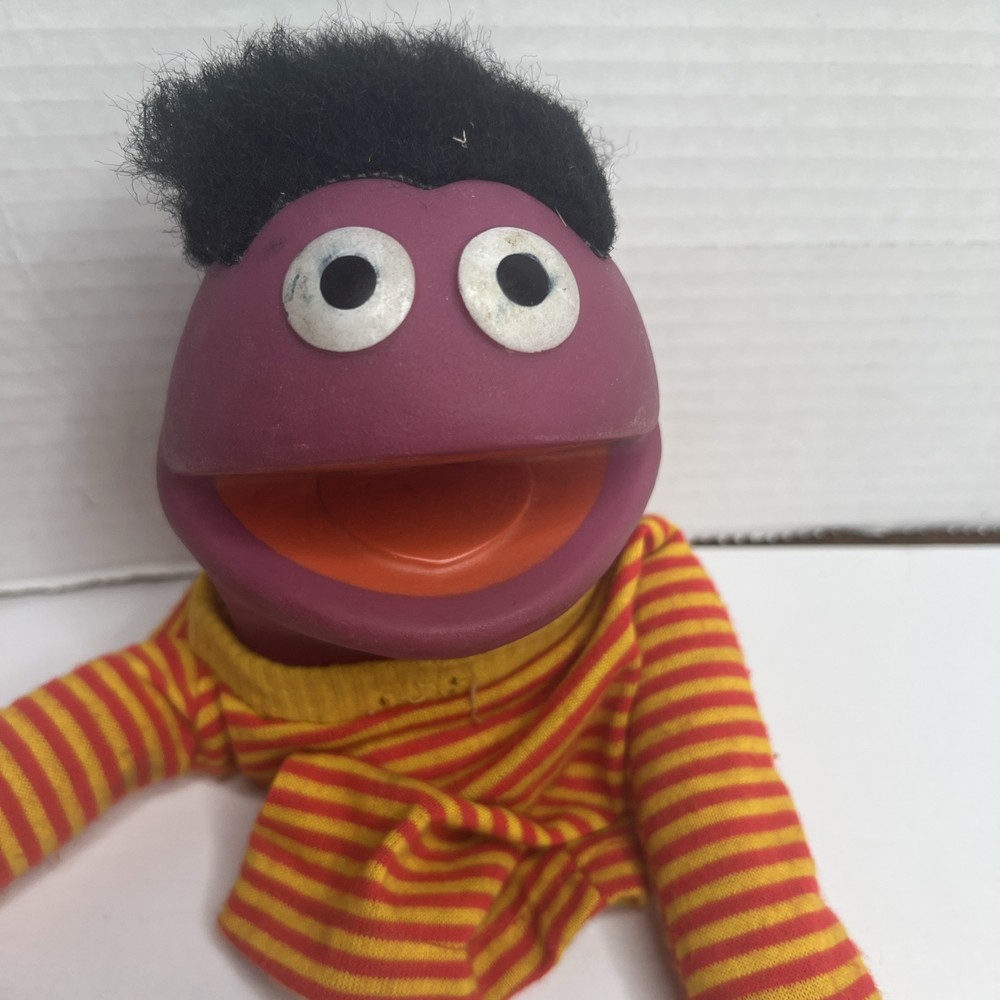The Sesame Street Roosevelt Hand Puppet is a vintage toy featuring a plush vinyl head and hands, perfect for young children aged 1-7. This puppet is part of the beloved Sesame Street character family, making it a fun and interactive toy for both boys and girls. With its unique design and nostalgic appeal, this hand puppet is sure to bring hours of imaginative play to any child. missing one hand.