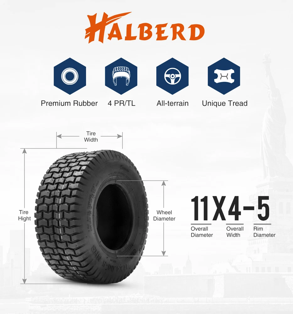 Set 2 11x4.00-5 Lawn Mower Tires 11x4x5 4Ply Premium Turf Garden Tractors Tire Specification: TT/TL: TL Tire Type: Lawn & Garden Tire Speed Rating: A3 Tire Load Range: B Section Width(mm):5'' Rim Width(in): 4.5 Overall Diameter(mm):11'' Tread Depth(mm):0.24'' Max PSI:30 Load Index(lbs):570 Features: ⏩Optimal Lawn Protection: HALBERD P512 tires feature a turf-friendly pattern design with a linear width and classic square shoulders. This design ensures exceptional lawn protection, minimizing turf damage during use. ⏩ Exceptional Traction Dynamics: Experience superb traction and control with the square shoulders. The unique, wide-spacing treads deliver outstanding performance across various terrains, providing stability and control even in rough conditions. ⏩ Versatility Across Terrains: HALBERD P512 tires adapt seamlessly to a wide range of lawn terrains, demonstrating excellent performance in both wet and dry conditions. Ideal for garden tractors, walk-behind mowers, and utility vehicles, these tires excel in diverse lawn applications. ⏩ Comprehensive Package Inclusions: Each purchase includes two HALBERD tires. Please note that rims are not included. Before making a purchase, verify the size of your original tires and the required quantity. For any inquiries or clarifications, feel free to contact us. ⏩ Popular Replacement Choice: HALBERD P512 tires are a popular replacement for a variety of lawn equipment, including lawn mowers, riding lawn mowers, lawn tractors, garden tractors, and even garden tractor pulling applications. Upgrade to HALBERD P512 for reliable and versatile performance. Package Include: 2x Lawn Mower Tires 11x4.00-5 Payment Delivery details Terms of sales About us Contact us Payment 1.We accept various payment methods. Paypal、Debit card、Apple Pay、Google Pay ect. Delivery details 1. Order will be shipped within 1-2 business day after payment confirmed. 2. We will arrange shipment for you from US warehouse via UPS\Fedex. 3. Delivery time varies from 2 to 6 business days. 4. We will ship to your eBay address. Please check your address at checkout. We will not responsible for wrong or undeliverable addresses. Terms of sales Buyer Guarantee We assure you that we are a honest and super reliable seller on ebay, any problems can be solved in a satisfing way for you and any loss will not be brought to you as long as you will kindly contact us via ebay message or your private email. Please kindly contact us firstly if your purchasing is in trouble before leaving any bad feedback including neutral and negative feedback and leaving 3 stars or less stars to me on 4 criteria. Return Policy Please return the item within 30 days after receiving if you are not happy with your purchasing.All returns are expected to be in original conditions, please email us first for return address and instructions. About us 1. We are specialized dealer of ATV UTV SXS Premium Tires for more than 30 years. 2. We have office and warehouse in US to ensure fast shipment and after-sale service. Contact us 1. Our customer-oriented service strives for positive feedbacks with all 5 star selling ratings. 2. Please feel free to contact us via eBay message once you have any question before you giving us negative feedback or open case. 3.We will reply in 24 business hours. 4. Business time: GMT8 (9:00-18:00) from Monday to Friday.