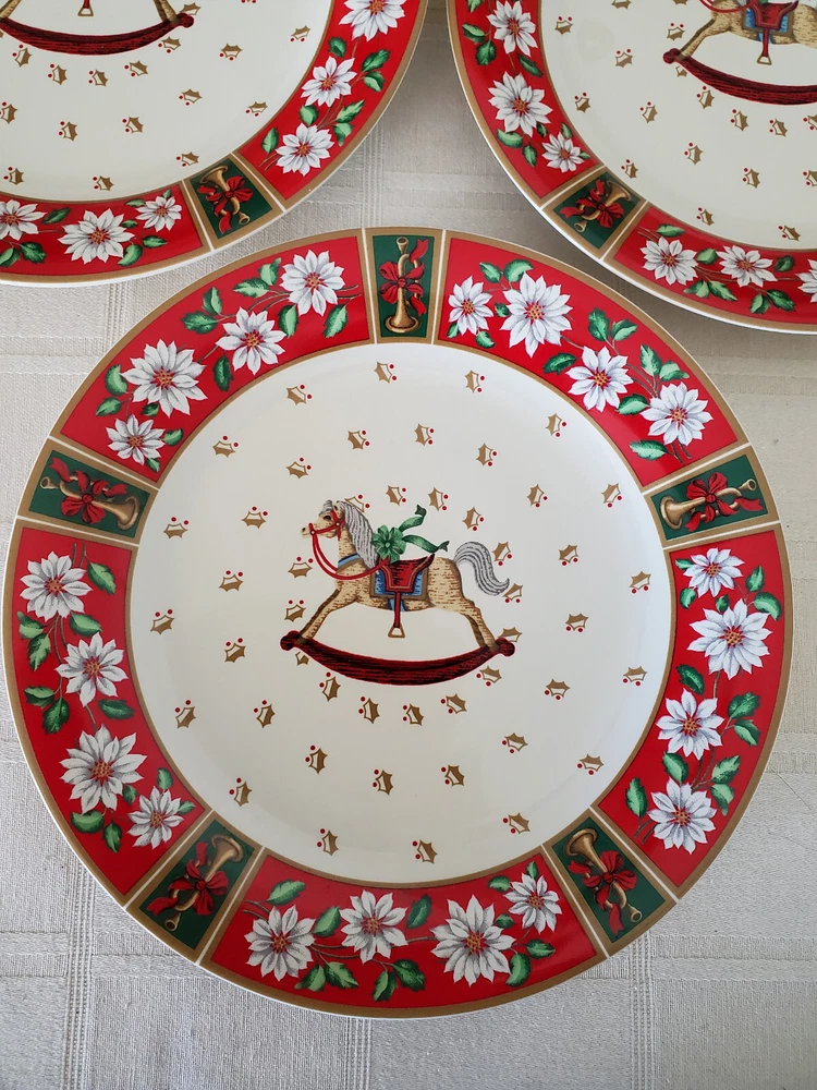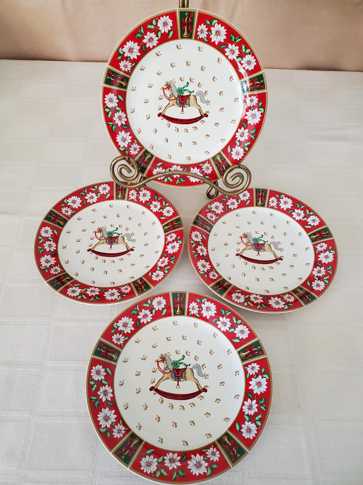 Set of 4 Charlton Hall by Kobe - Classic Traditions SALAD PLATES Produced between 1985-1995 Made in Japan Christmas Poinsettia Flowers - Golden Trumpets tied w/Red Ribbon Plates were NEVER USED - Stored in a plastic bin Measures 7.75" Round Diameter Questions ?? Please .. Just Ask !! Thank you for looking and please check out my other listings ! WILL Combine Shipping for you (IF Shipping is overpaid - WILL refund you back)