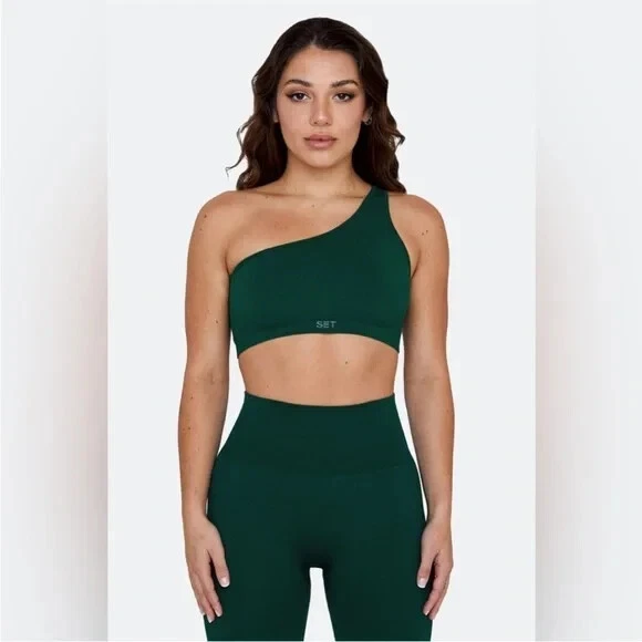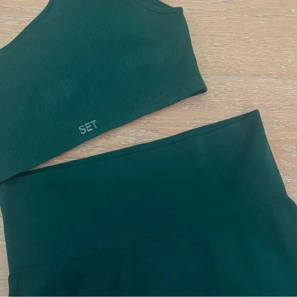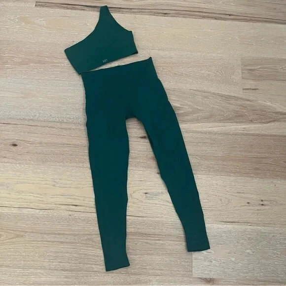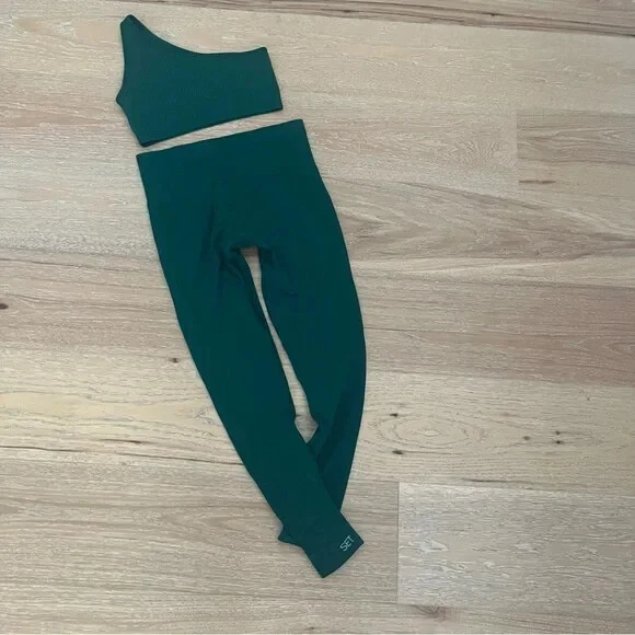 One shoulder ribbed sports bra and high rise leggings, mojito green, excellent preowned condition
