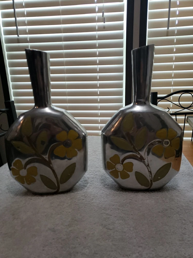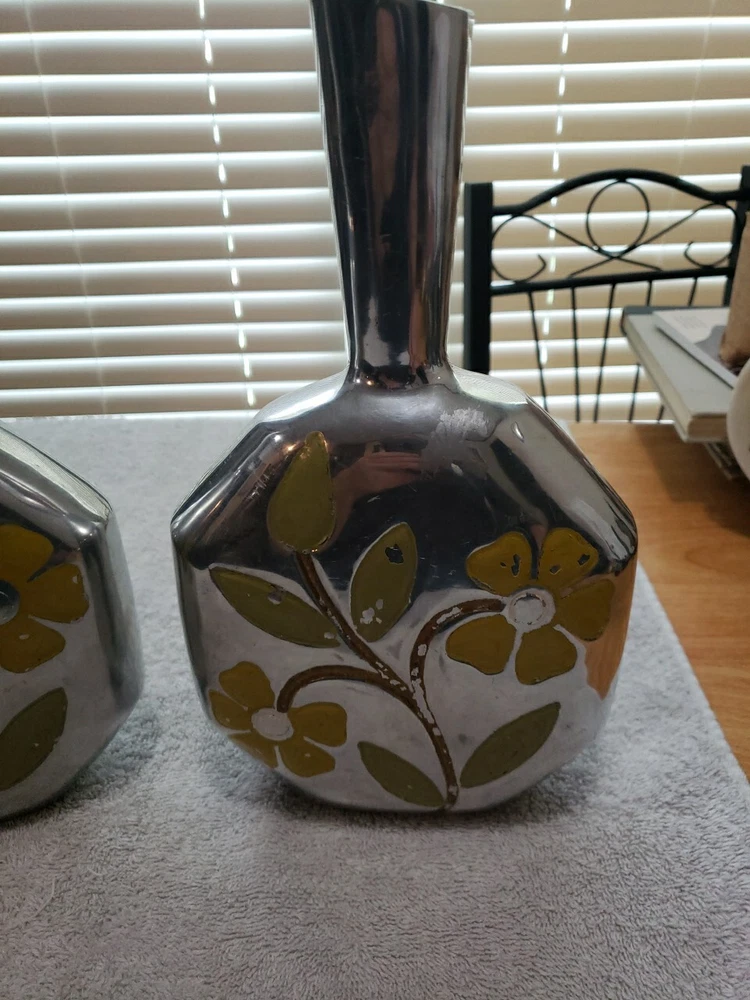 Set Decorative Aluminum Vases Made In India 11.5" Tall 7" Across Floral Design