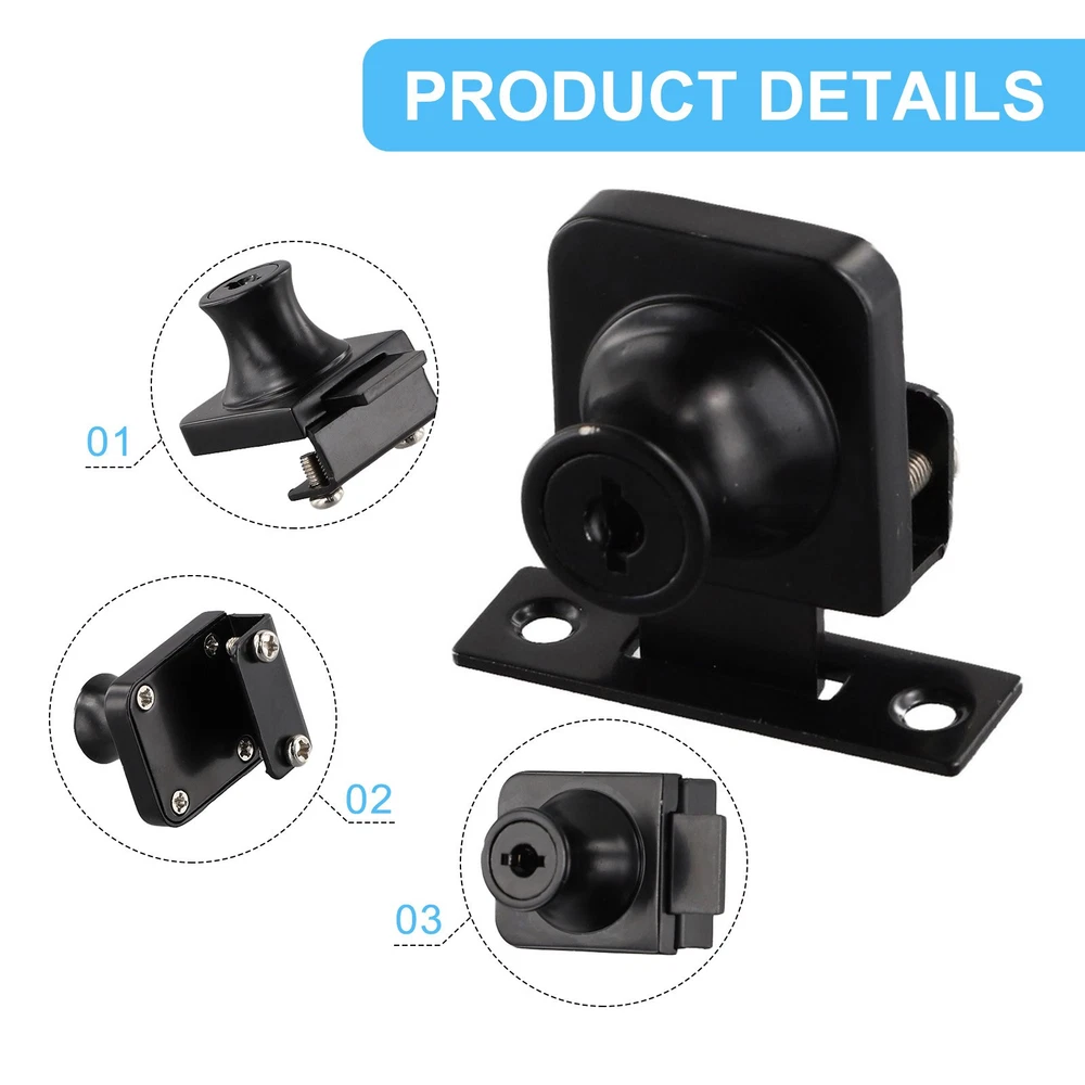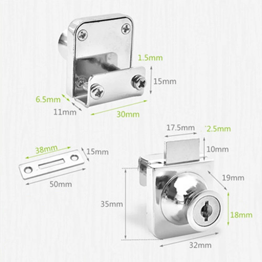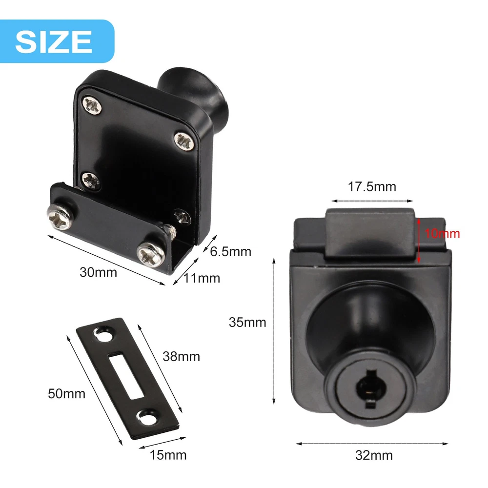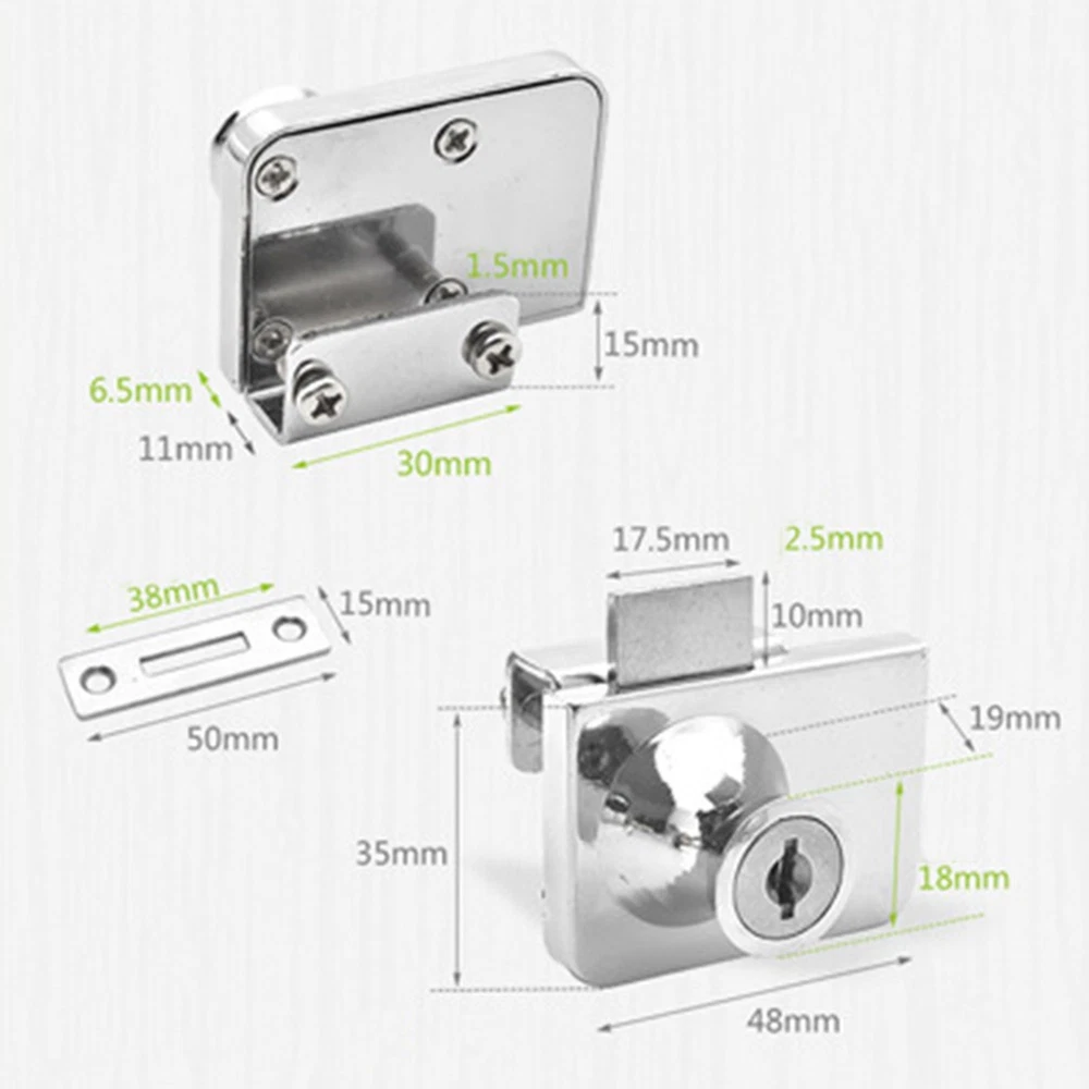 Product Description Features: * new and high quality *Made of high quality material, and practical to use *Compatible for cabinets and showcases with single/double swinging glass doors. *No drilling is required, easy to install *The of the lock body is smooth and delicate with excellent craft *Fit for 5-8mm thick glass Specifications: *Material: Zinc Alloy *Color: Bright light/Black(As pictures show) Tips:A key can correspond to multiple locks Package Contents: 1*Cabinet Lock 2*Keys Note: 1. The real color of the item may be slightly different from the pictures shown on website caused by many factors such as brightness of your monitor and light brightness. 2. Please allow slight manual measurement deviation for the data. Payment Payment must be completed within 5 days. If you have any problems about payment, please contact us via ebay message. Delivery details We only ship to confirmed ebay Order addresses. Please comfirm that your Order address is in line with your shipping address. Please kindly note that the c ombined shipping is not provided because the shipping fee is calculated by weight. Also, the each additional item means exactly the the same color and size. It takes about 7 -15 working days to US; about 10-30 working days to other countries. Transit time may be a little delayed because of the bad weather and customs inspection . If you do not receive your item within 30 working days since payment finished, please contact us immediately for further assistance. Contact us We strive for 100% customer satisfaction! Positive Feedback is very important to us. If you have any questions, p lease feel free to contact us via "Ask seller a question" . We will reply your email within 24 working hours.