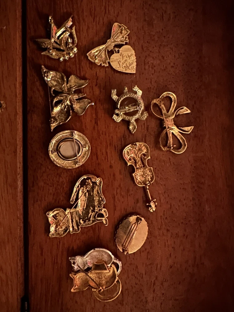This is a set of 10 vintage Avon brooch pins, perfect for adding a touch of elegance to any outfit. These rare estate sells are a great addition to any jewelry collection. Each pin features a unique design and can be worn on any occasion. The brand Avon is known for its high-quality jewelry and these brooches are no exception. Get your hands on these stunning pieces today!
