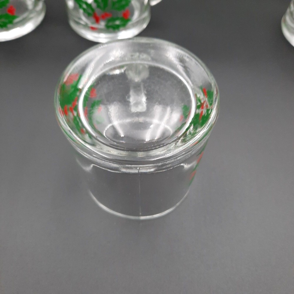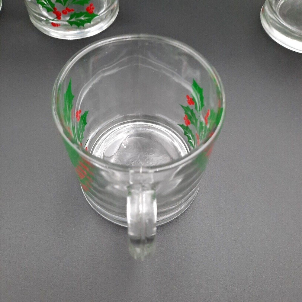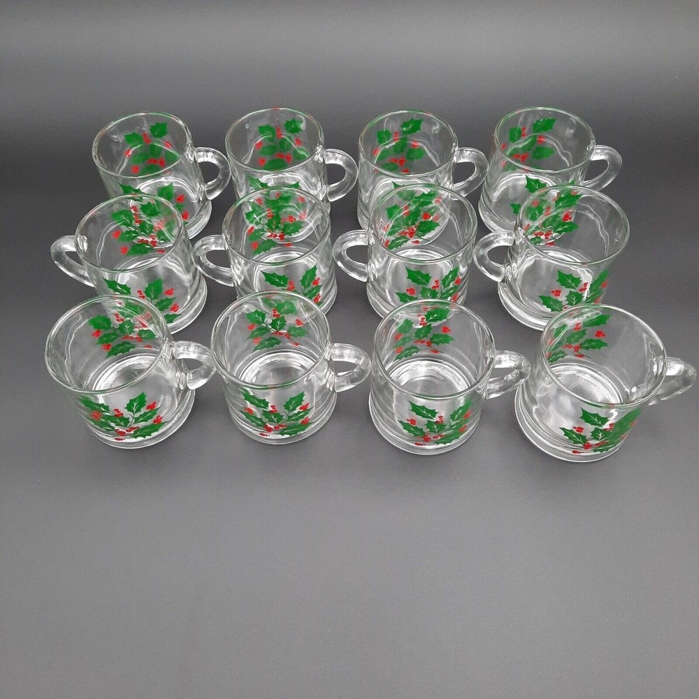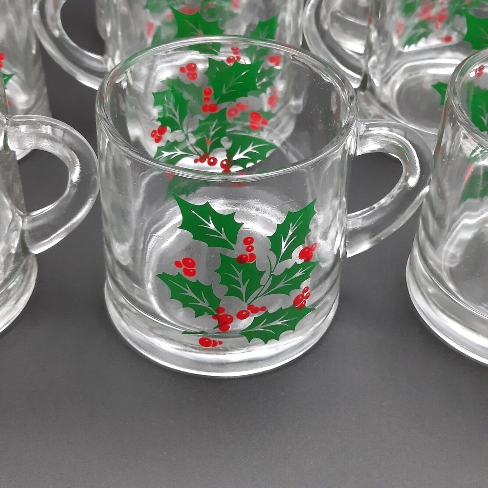 These vintage holiday mugs feature a clear glass build adorned with a classic holly and berry design. Ideal for seasonal gatherings, they add a charming festive touch to your drinkware collection. • Set of 12 mugs • Classic handle design • Holly & berry motif