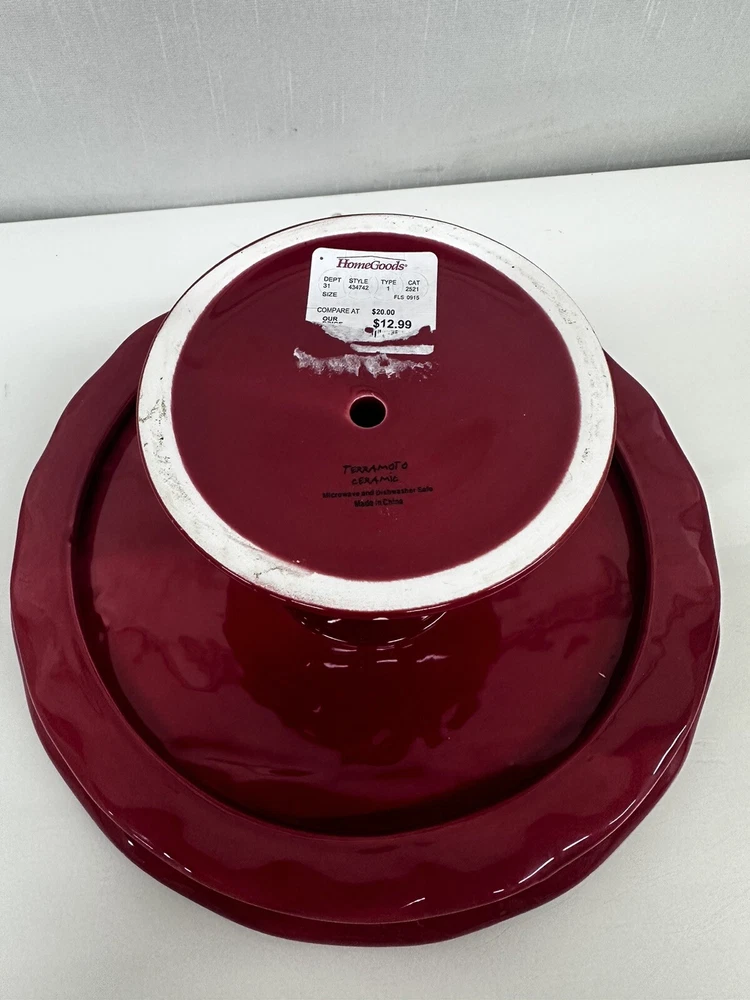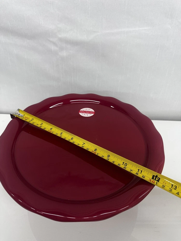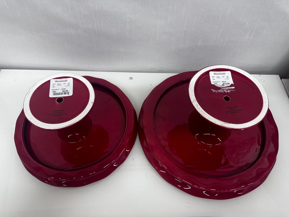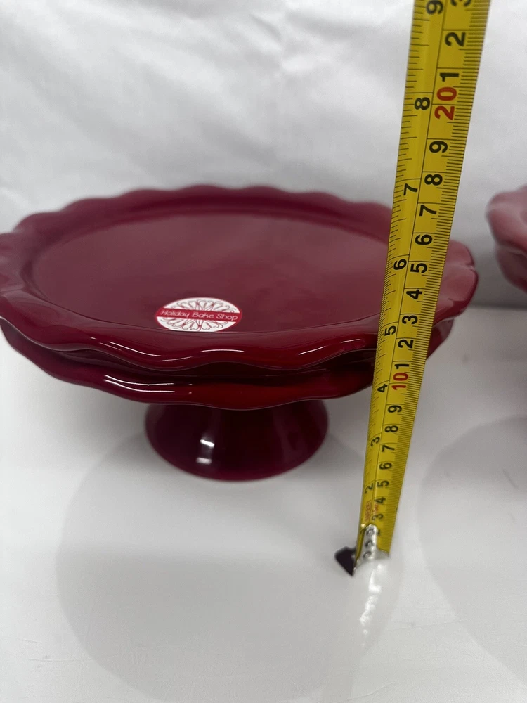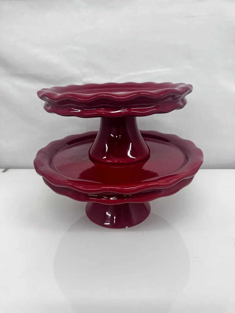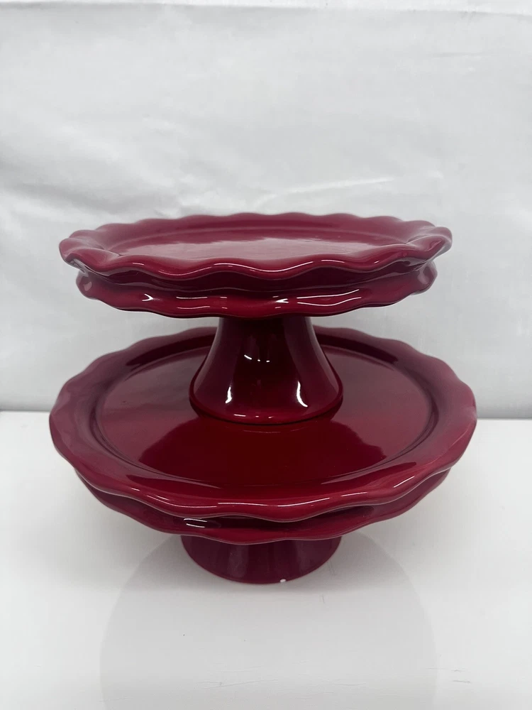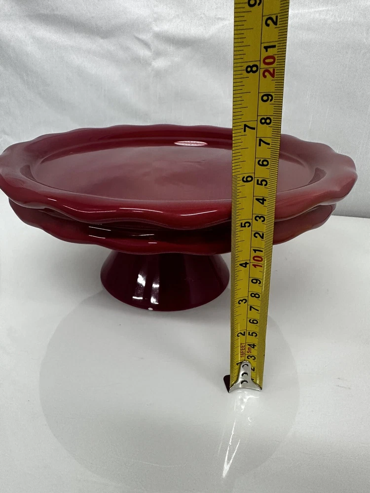 The bigger stand has a small white spot as it shown at the picture. Add a touch of elegance to your dessert presentation with this set of two cake pedestals. The round, footed plates are made of high-quality ceramic and come in diameters of 10" and 12", with a height of 5". The vibrant red color and ruffled design add a pop of color and a feminine touch to any occasion. Perfect for weddings, parties, or just a sweet treat for yourself, these cake stands are sure to impress. The set includes two items and is ideal for displaying your favorite desserts.