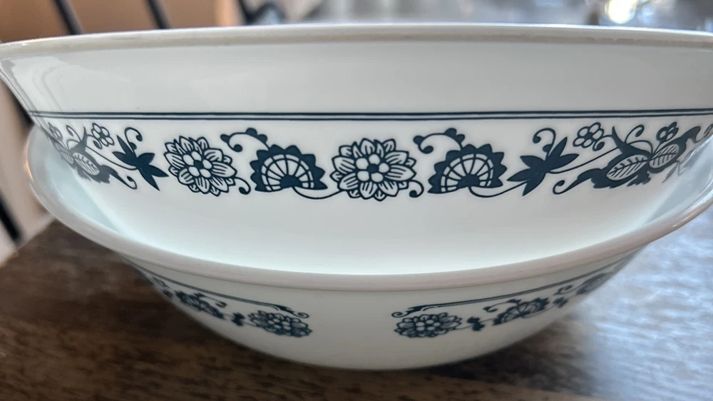 The product is a set of 2 Corelle 8 1/2" Blue Onion Old Town round vegetable serving bowls. These bowls are made of glass with a vibrant blue color and feature a classic design. The set includes 2 serving bowls that are perfect for serving vegetables or other dishes during meals. The bowls are in very good condition, making them a great addition to any dining table for both everyday use and special occasions. Like new condition