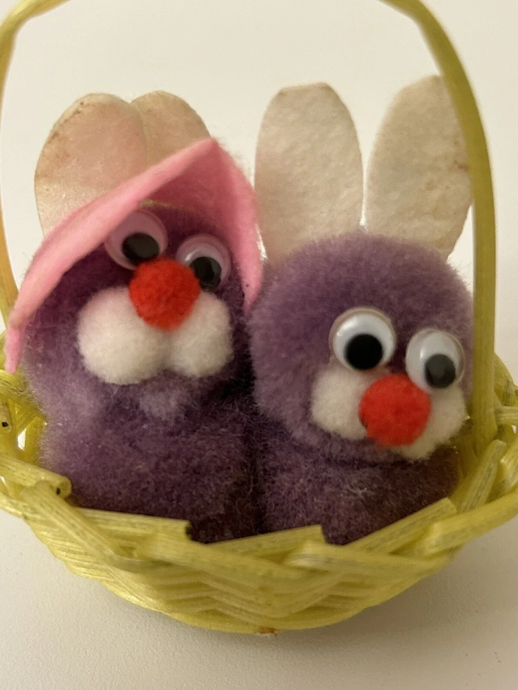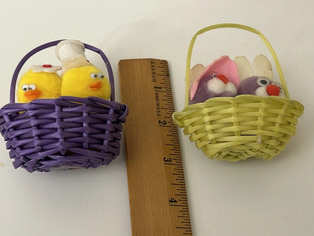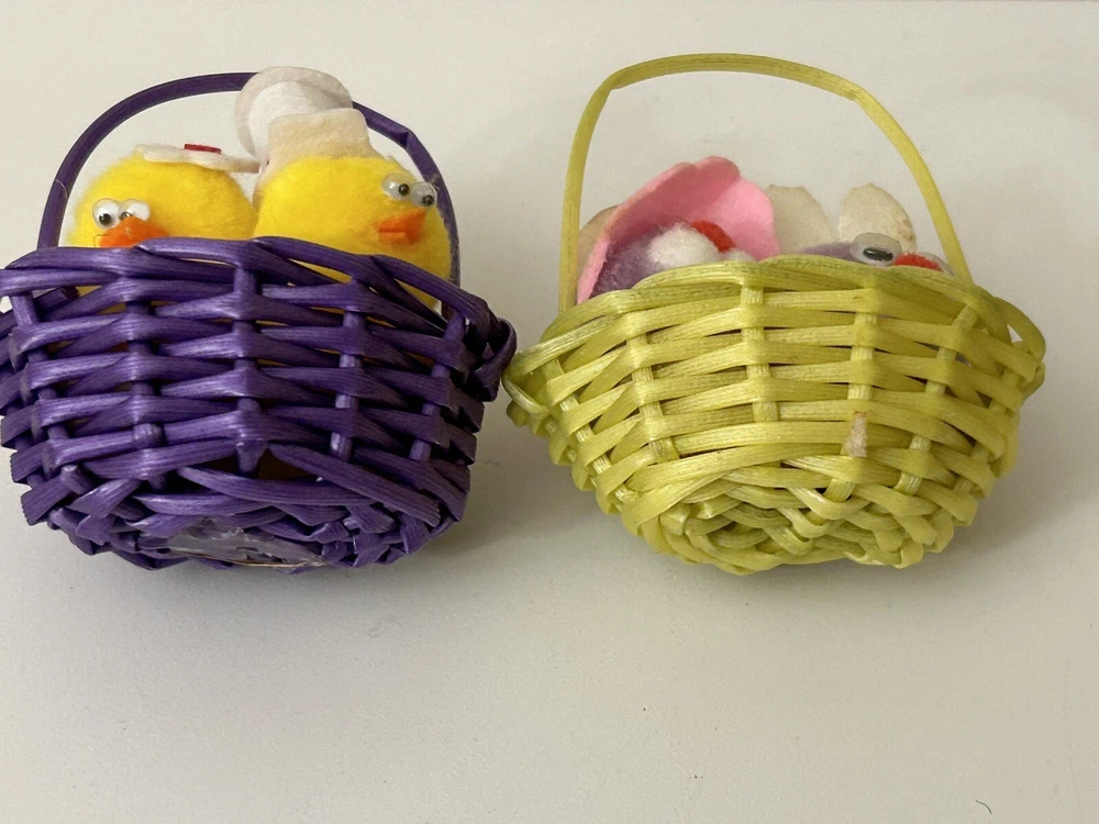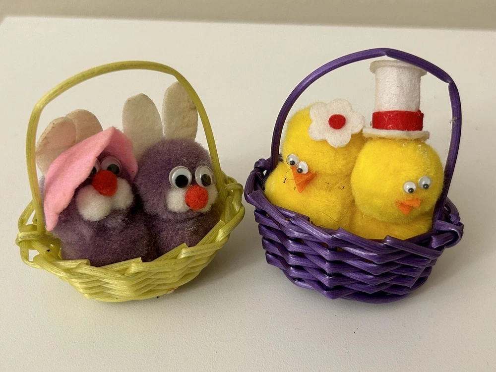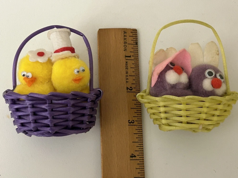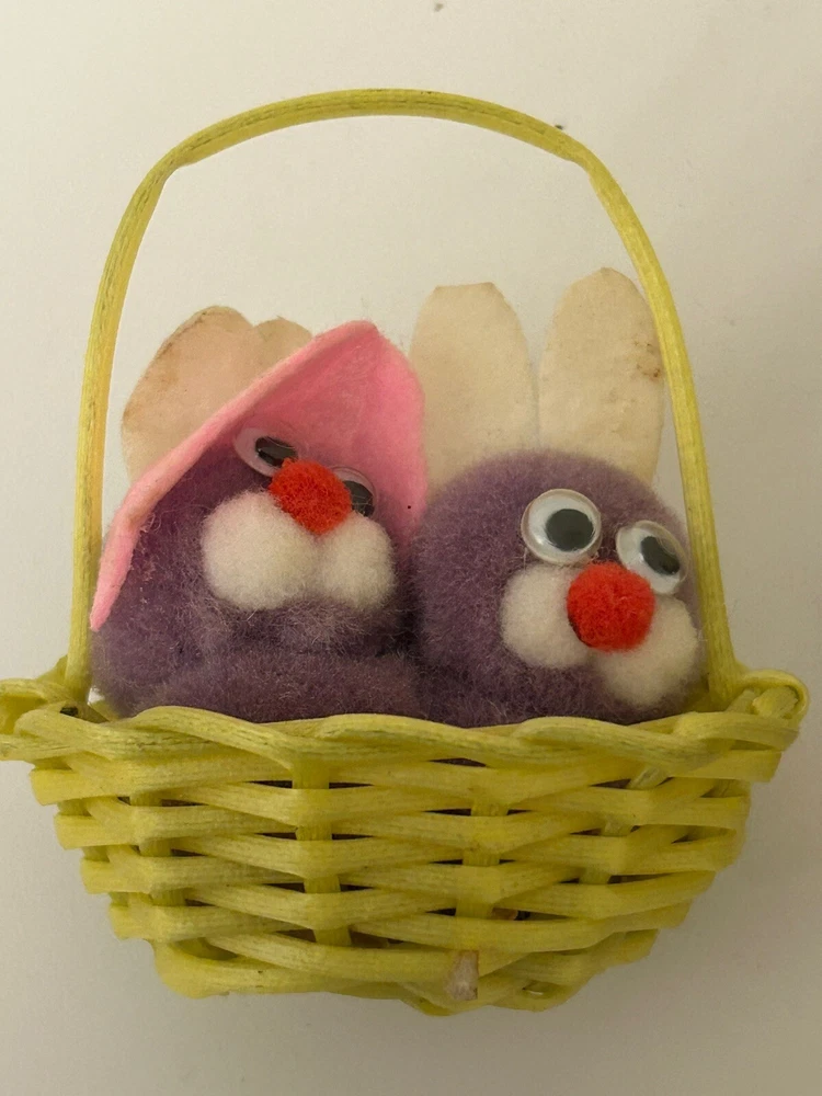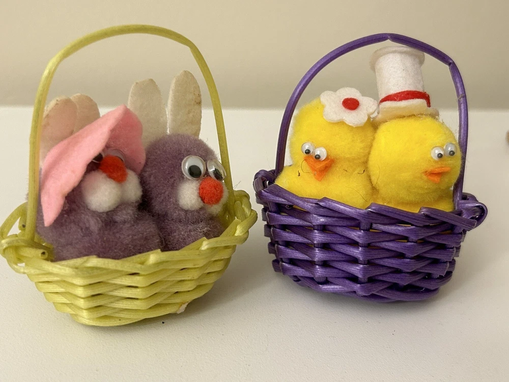 Vintage Set 2 Pom Pom Mini Chicks Ducklings & Bunny In Baskets google eyes Pink purple Easter Decor One has a Magnet- the other magnet is missing Good vintage condition-refer to pictures