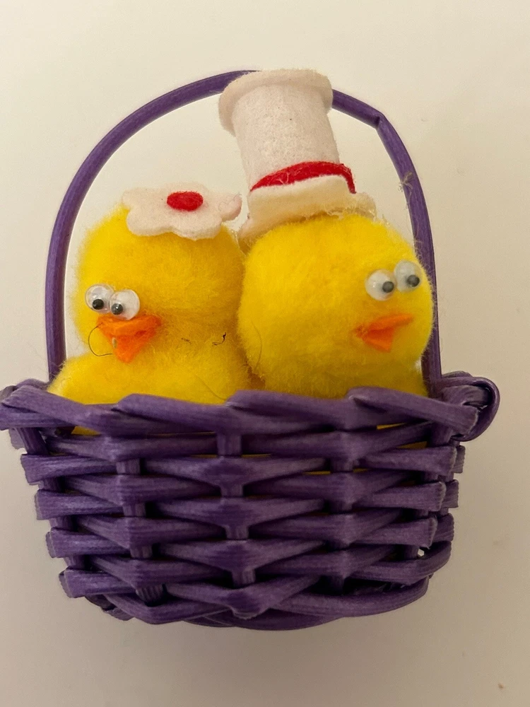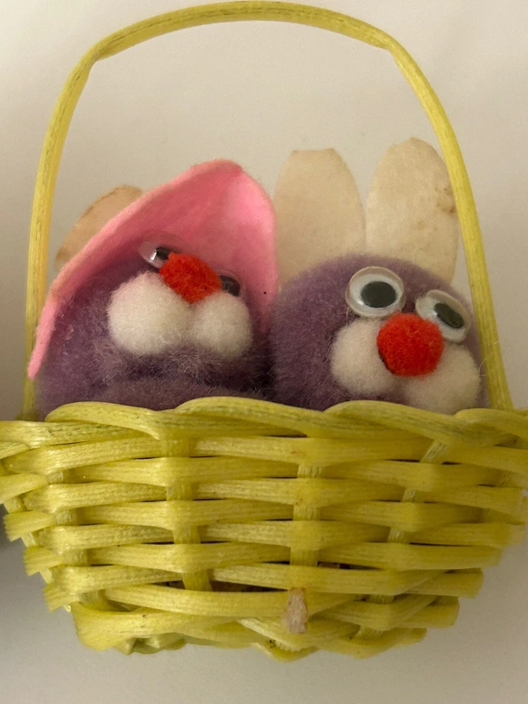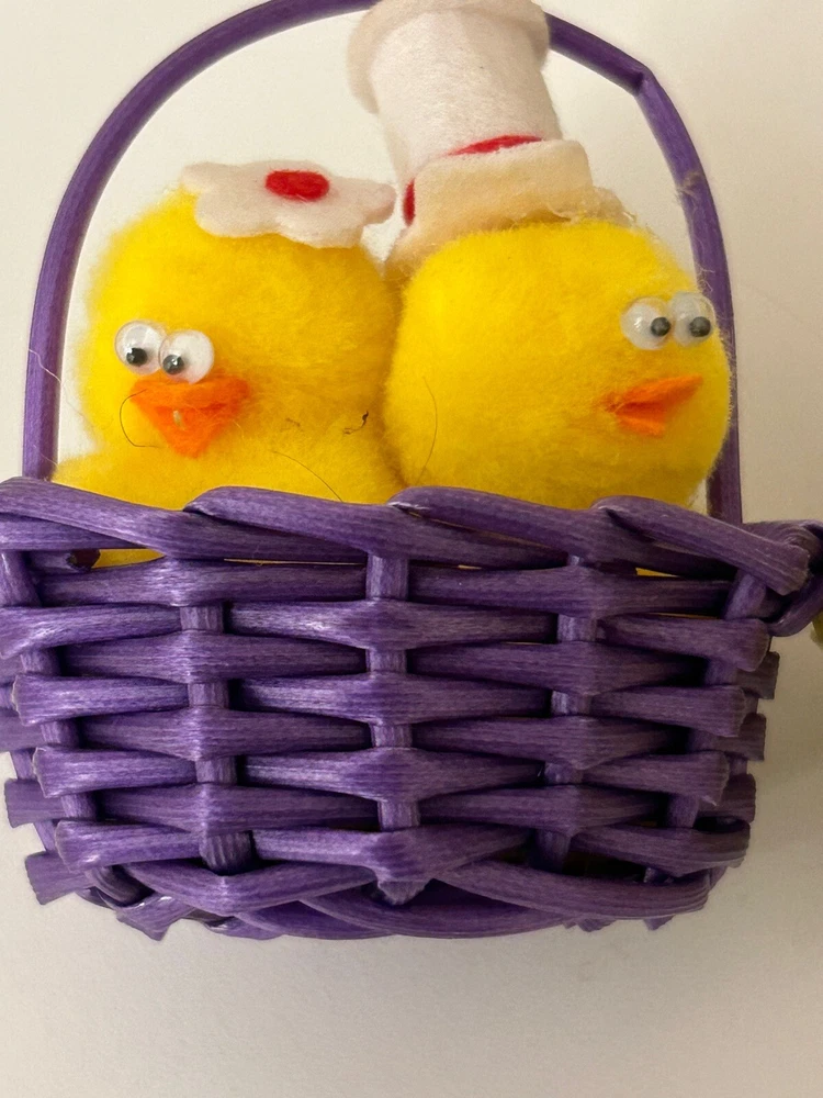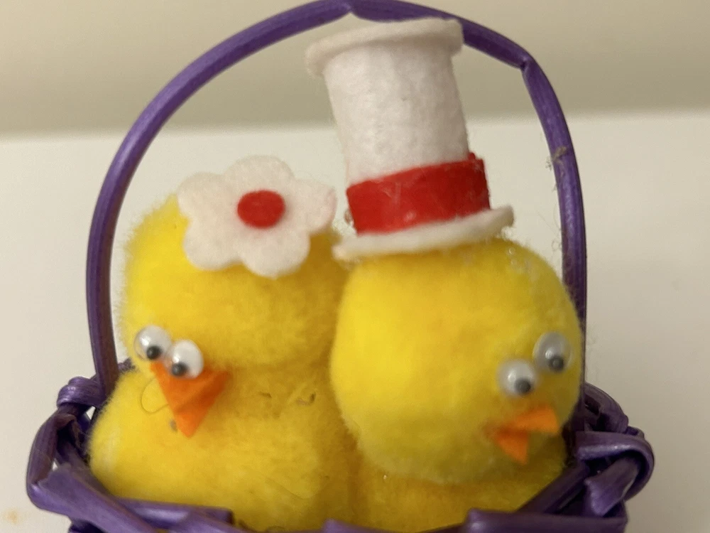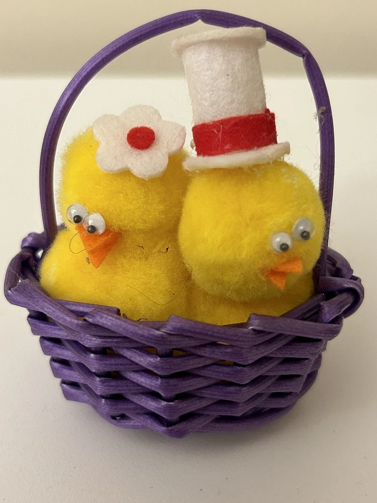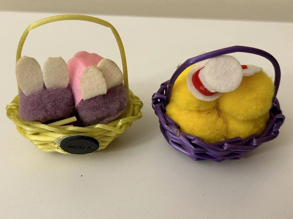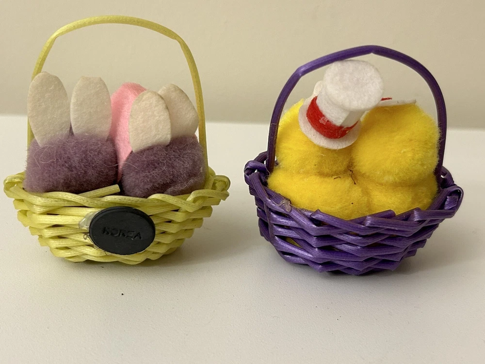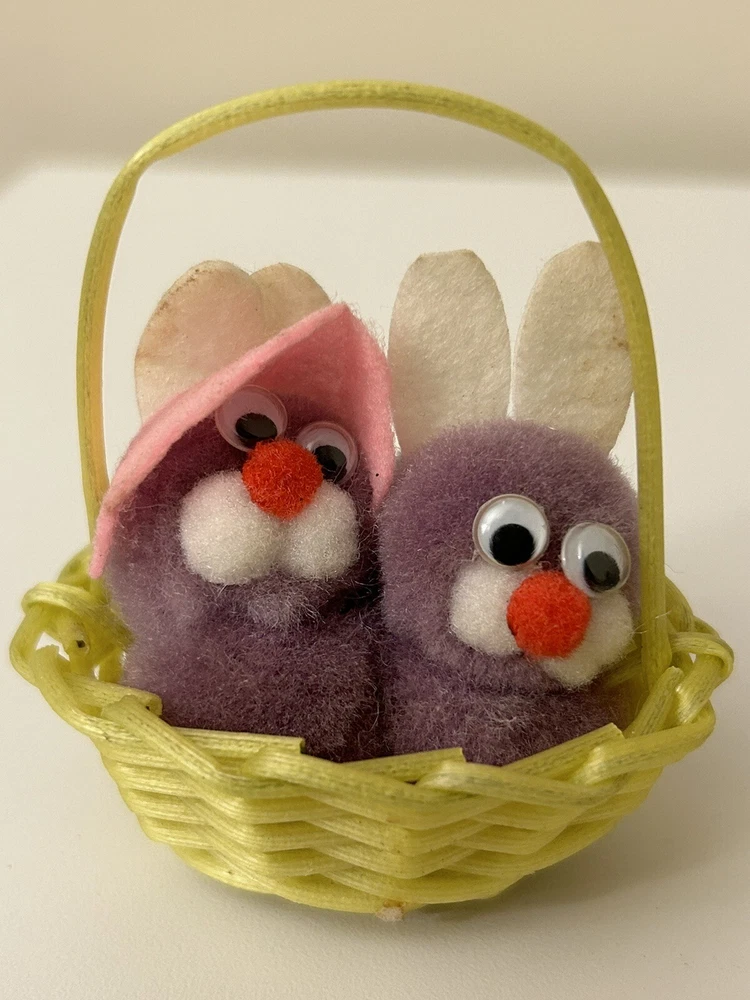 Vintage Set 2 Pom Pom Mini Chicks Ducklings & Bunny In Baskets google eyes Pink purple Easter Decor One has a Magnet- the other magnet is missing Good vintage condition-refer to pictures