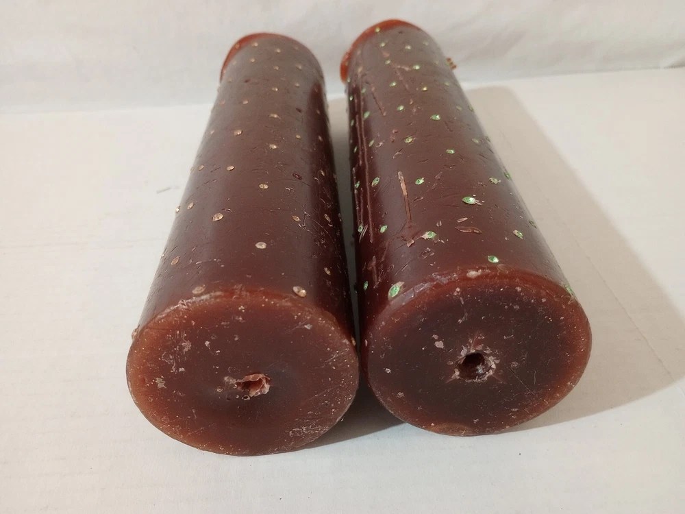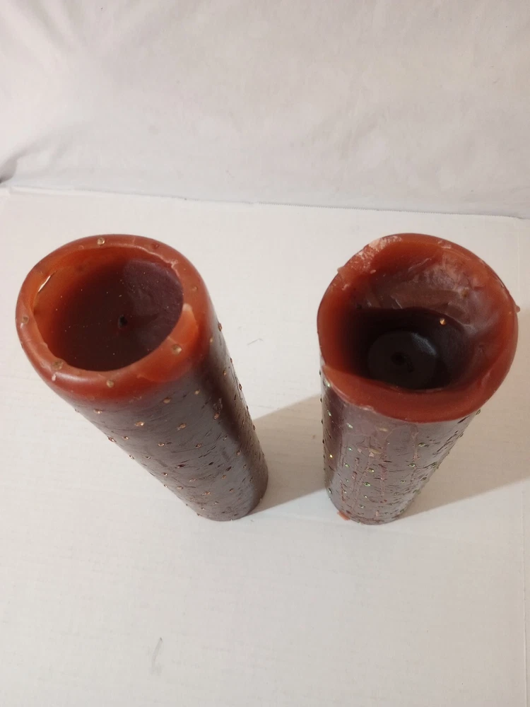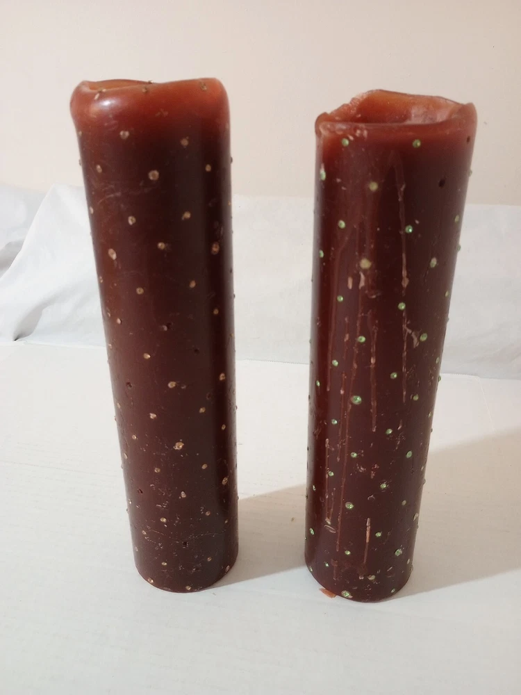 Set Of 2 Pillar Wax Scented Candles 11"-12" X 3" Brown With Crystal Gems. -Some gems missing. -Candles are used. -One candle has drips along the side but generally they don't drip. -The drips were caused by tipping the candle and pouring the hot wax out. -See photos for details. -Shipped with USPS Parcel Select Ground Mail. -Also available for local pickup. We welcome offers counter offers and negotiation. We do not work on Sundays. Thank you for your time.