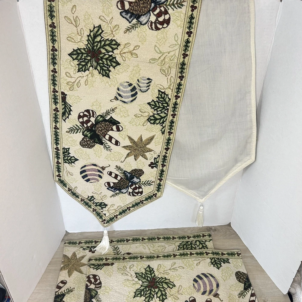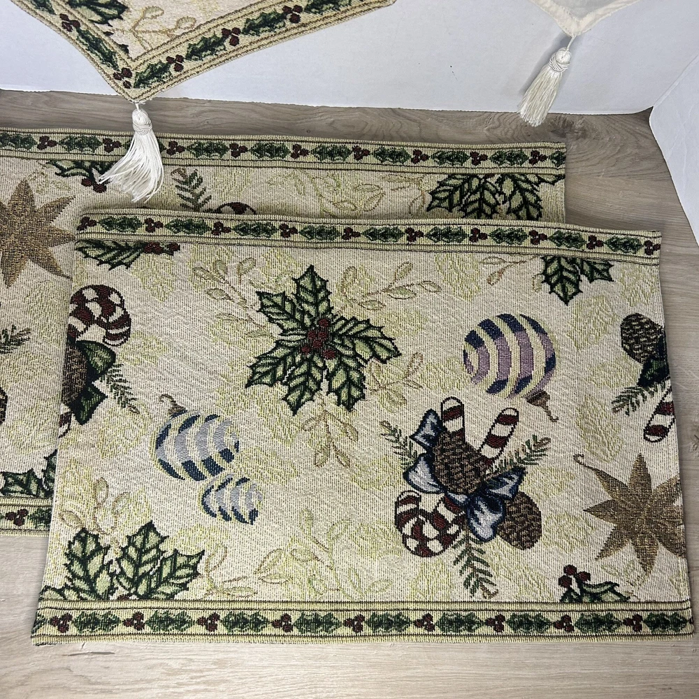 Set of 2 tapestry placemats and matching table runner. Christmas holly and candy cane design with gold thread woven in to give some sparkle. Placemats are 19” x 13” and runner is 70” long. All in great condition with no rips or stains.