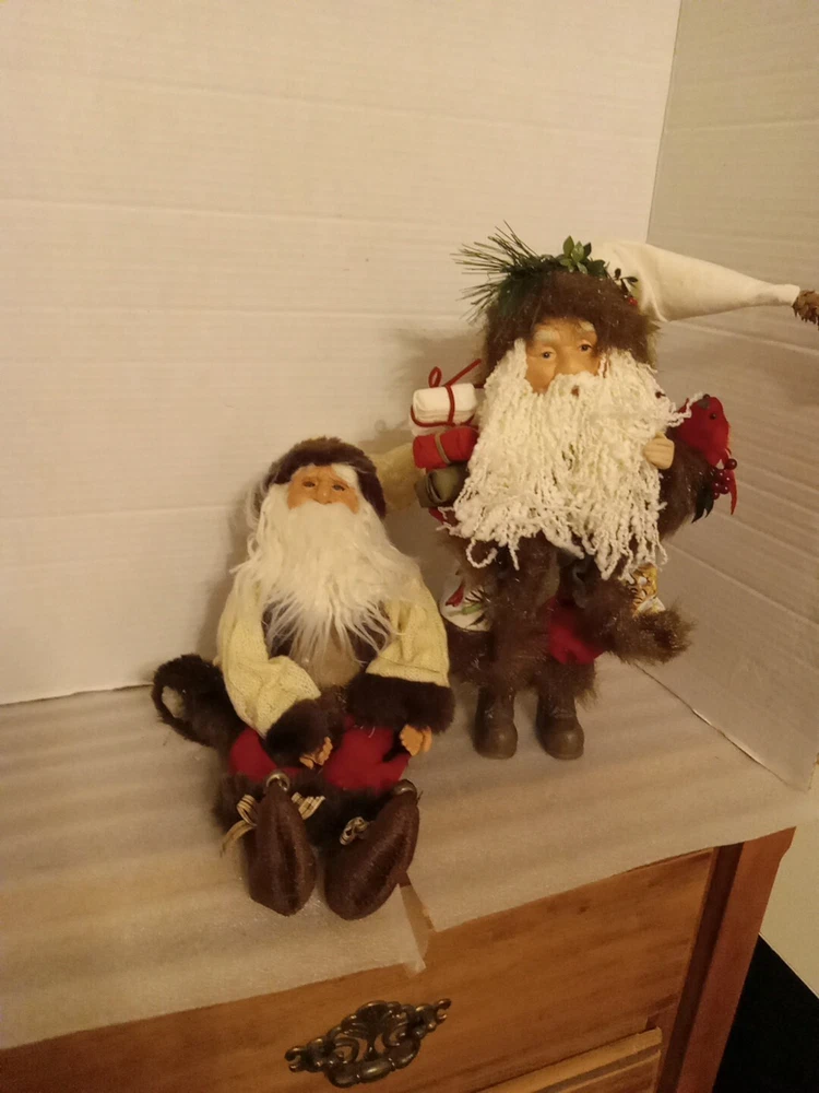 The product is a set of 2 vintage Old World Santas, one sitting and one standing. These figurines feature a multicolor design and are themed around the seasonal occasion of Christmas. Perfect for collectors or holiday decor enthusiasts, these Santas exude a classic charm with their traditional depiction.