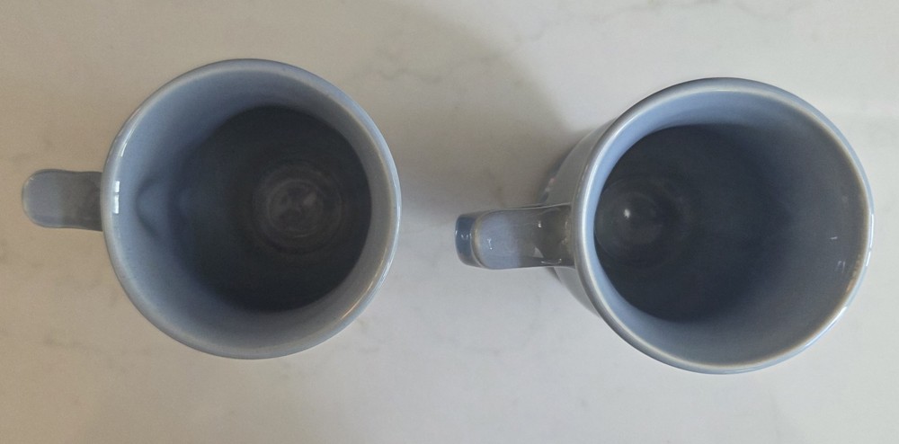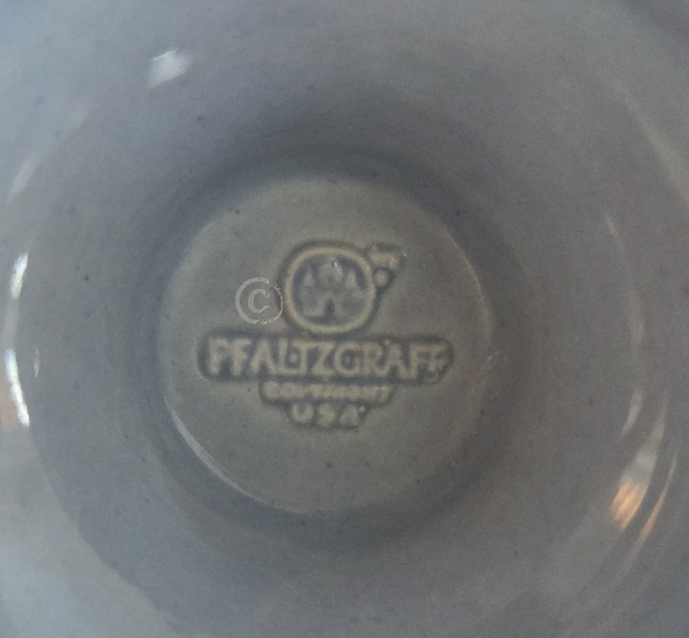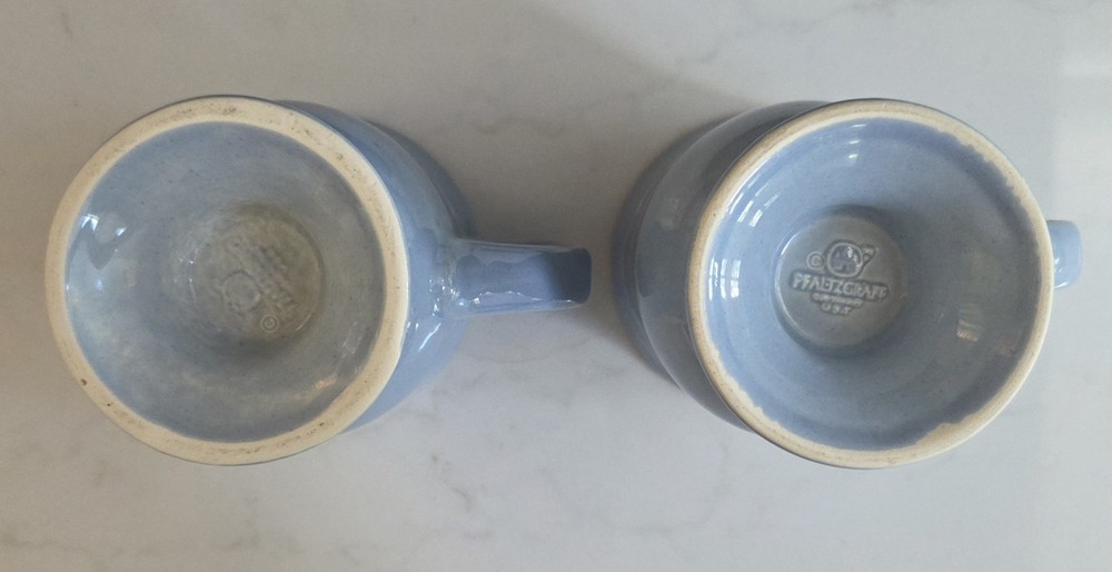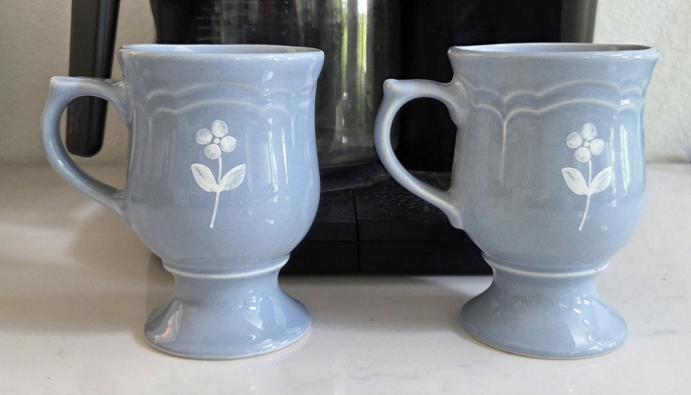 This is a set of 2 vintage Pfaltzgraff Bouquet pedestal mugs made of blue stoneware. Each mug hold ls approximately 8 ounces and are 5" tall and 3" in diameter at rim. Smoke free home.
