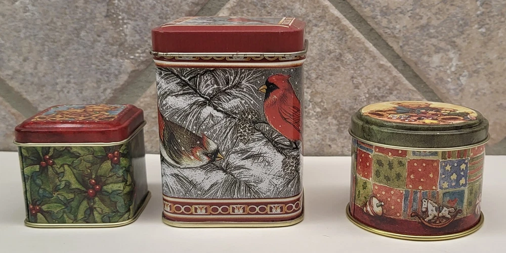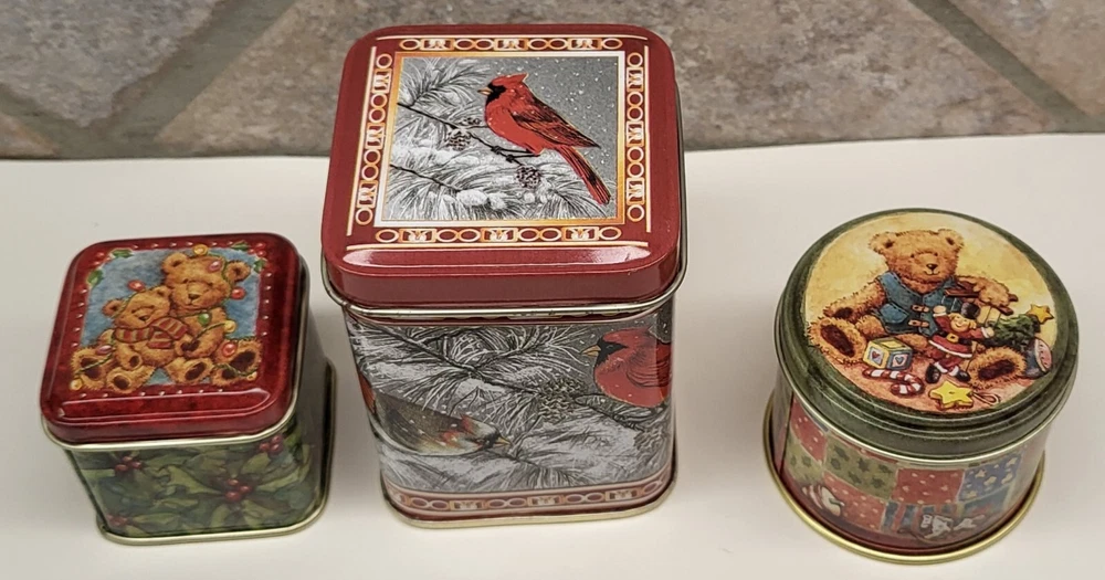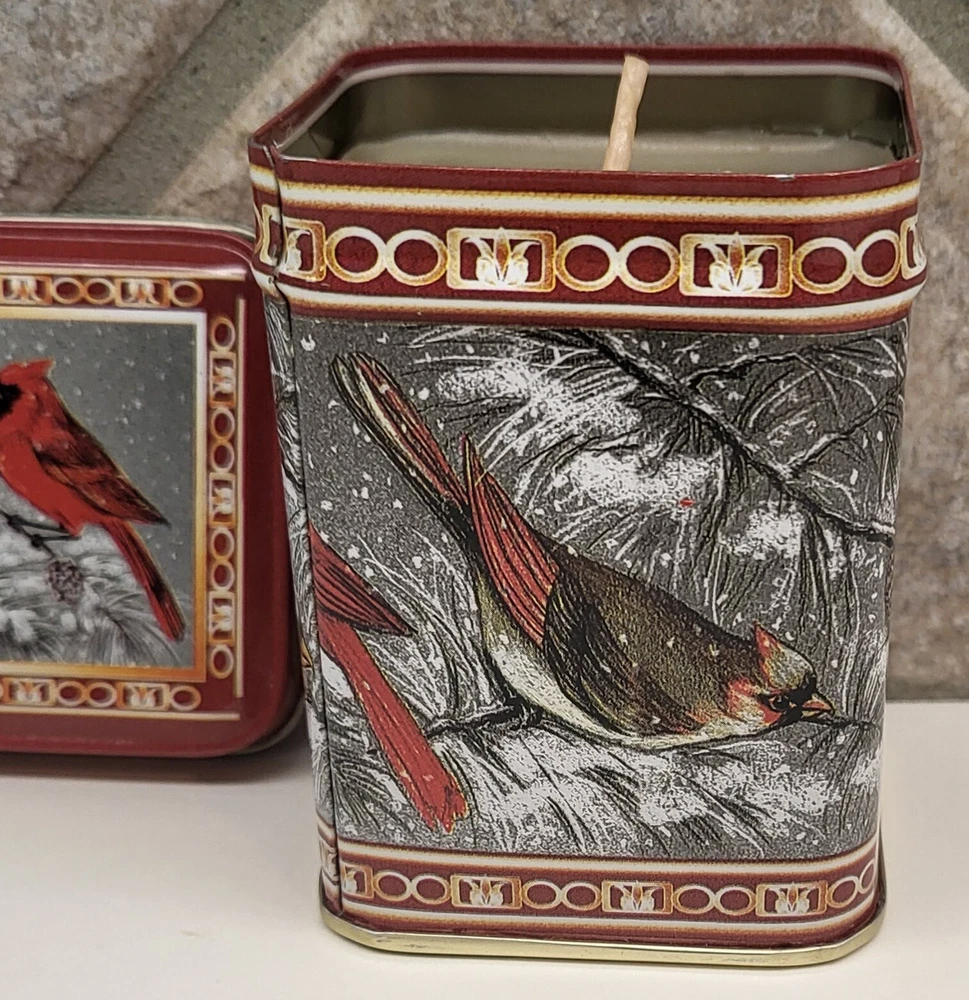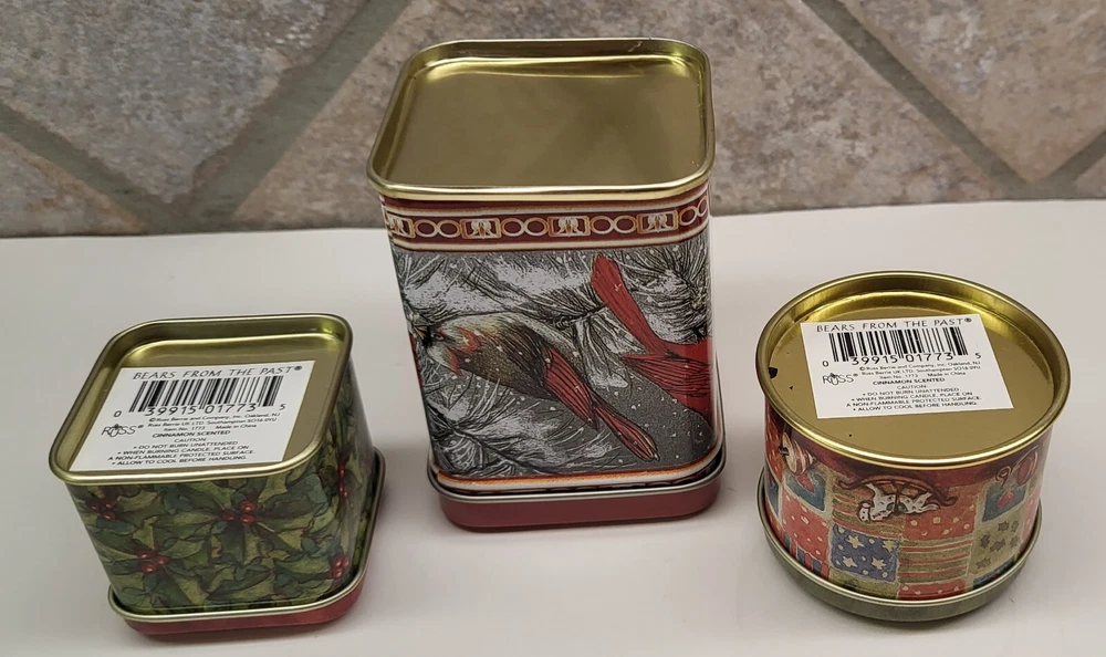 Set of 3 Christmas Candles in Metal Tins. Two Russ Berrie Bears of The Past and one with Cardinals. Excellent unused condition. Shipping will be USPS Ground Advantage Mail. Thank you.