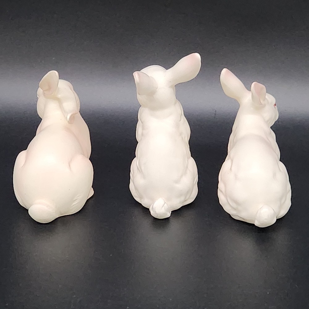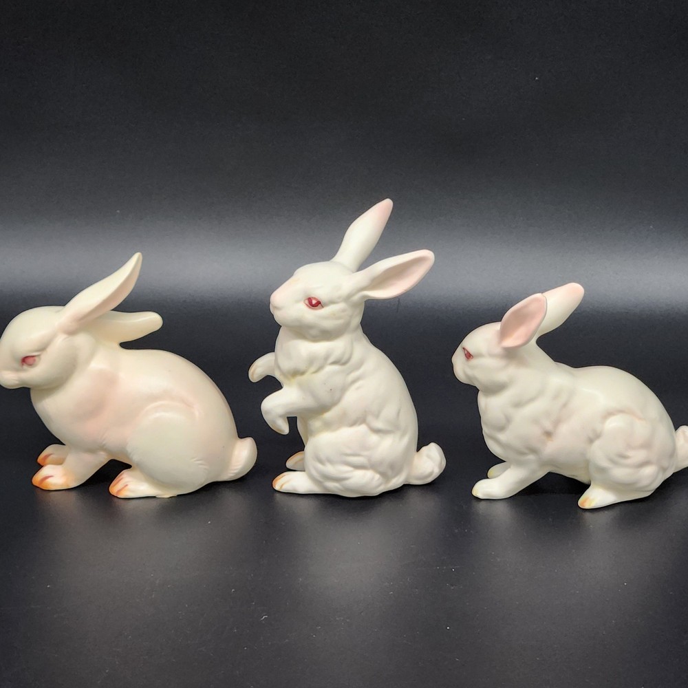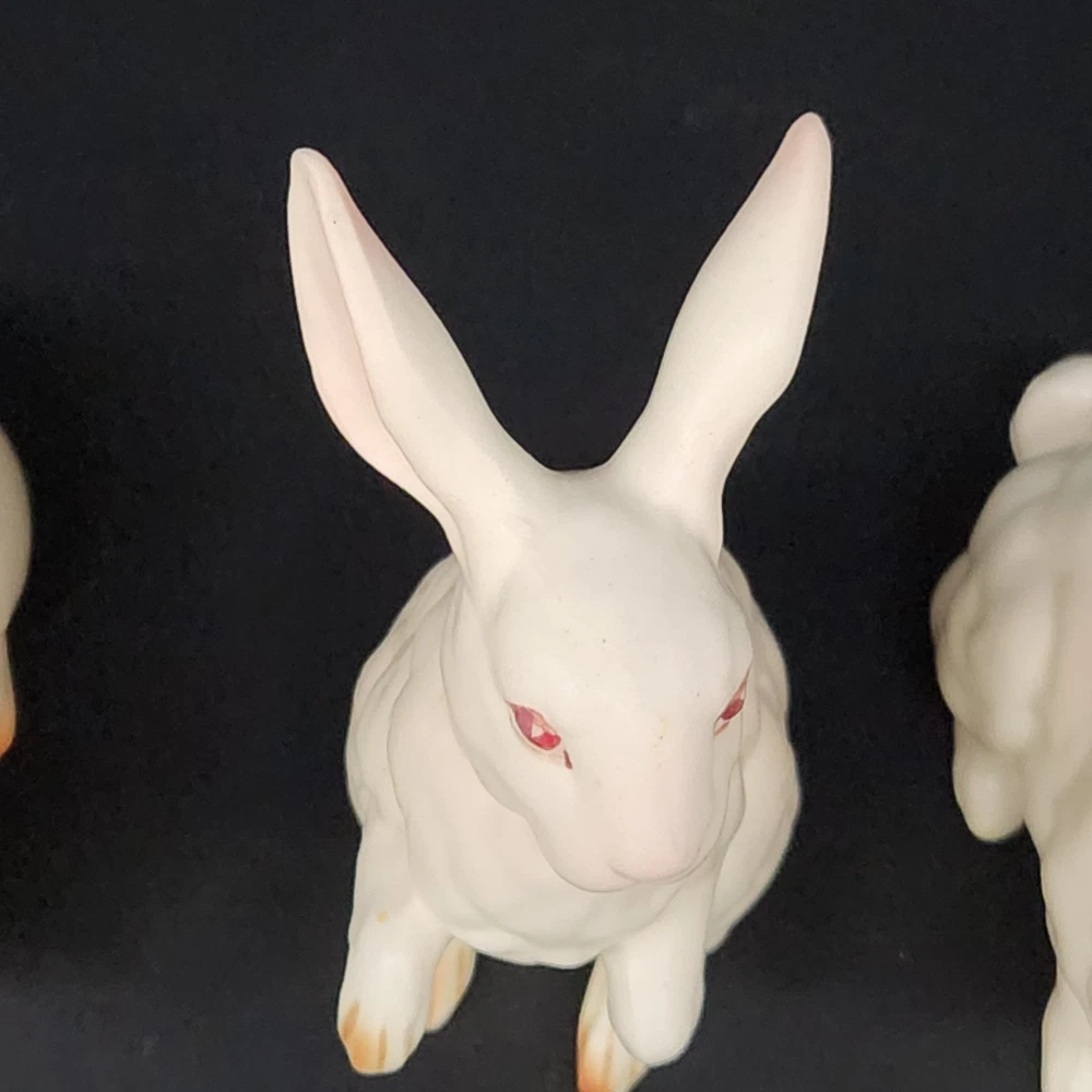 Why settle for one bunny when you can have three judgmental rabbit overlords staring at you with red eyes? Perfectly unsettling decor. • Made from ceramic with hand-painted details • Includes markings: H-7143, H880, and Lefton Japan sticker • Tallest bunny measures 4.25" • Vintage collectible set • Slight wear on bases In very good used condition. One rabbit has a very small chip on his ear. No other issues found. See photos for details.