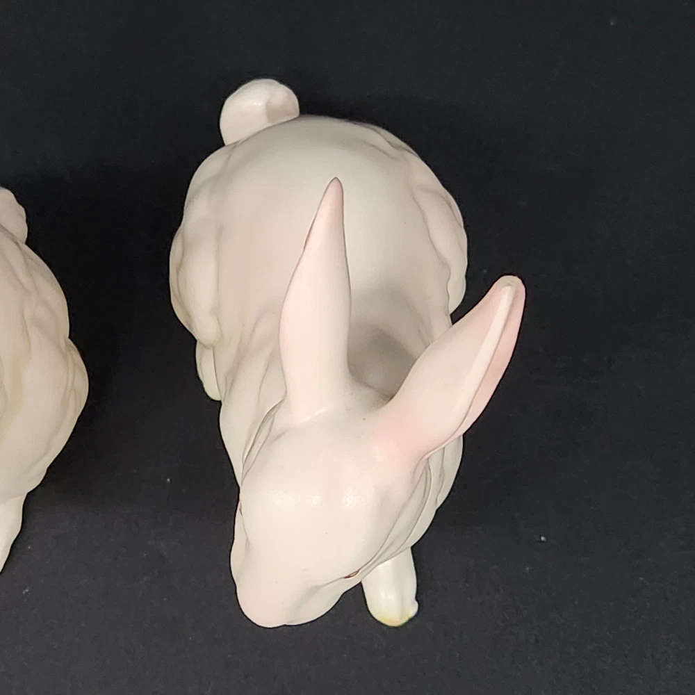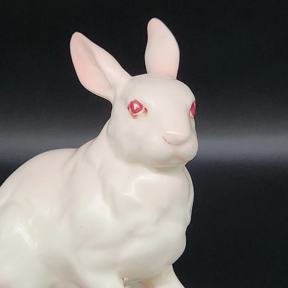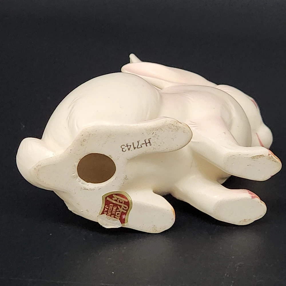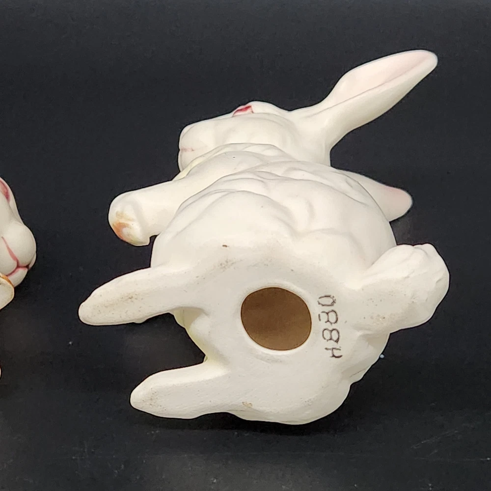 Why settle for one bunny when you can have three judgmental rabbit overlords staring at you with red eyes? Perfectly unsettling decor. • Made from ceramic with hand-painted details • Includes markings: H-7143, H880, and Lefton Japan sticker • Tallest bunny measures 4.25" • Vintage collectible set • Slight wear on bases In very good used condition. One rabbit has a very small chip on his ear. No other issues found. See photos for details.