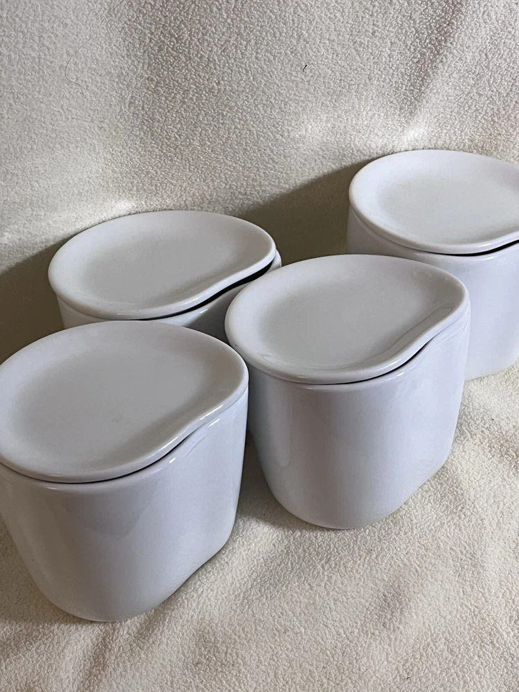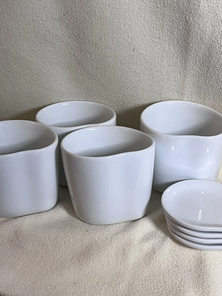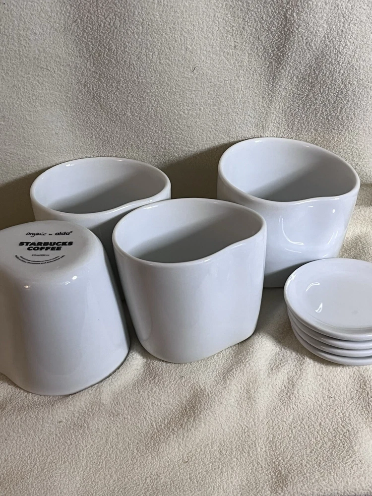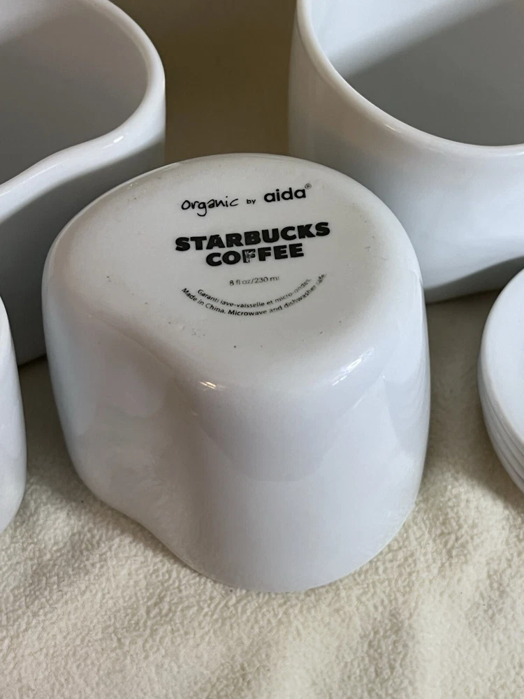The product is a set of 4 Starbucks mugs from 2008, designed by Aida in an organic shape with a wavy line pattern. The mugs are white in color, made of ceramic & porcelain, with lids that double as coasters. Each mug is 3 inches high and 3.5 inches wide, and the set includes lids and cups. The mugs are modern in style, dishwasher safe, and suitable for hot beverages.
