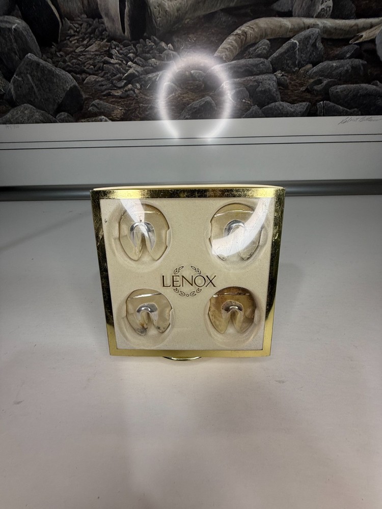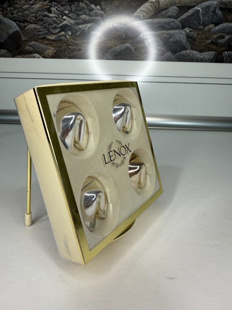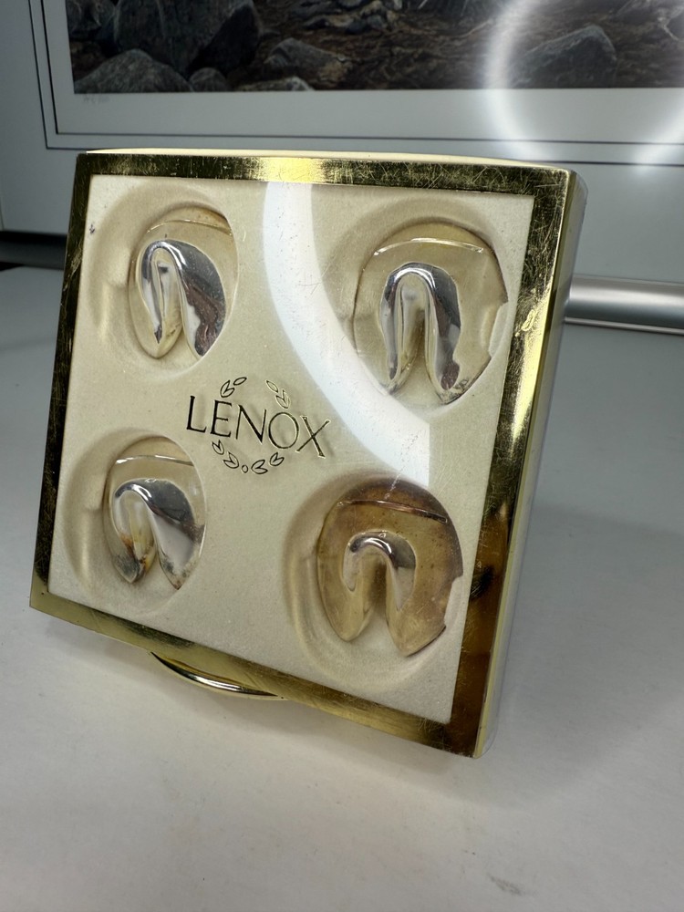 Set Of 4 Lenox Silver Plated Fortune Cookie Place Card Holders Table Decor English: Elevate your dining experience with this elegant Set of 4 Lenox Silver Plated Fortune Cookie Place Card Holders. Beautifully crafted with a gleaming silver-plated finish, these unique holders add a touch of sophistication and charm to any table setting. Perfect for weddings, dinner parties, or festive gatherings, they hold place cards, photos, or small notes with style. A collectible Lenox design, they blend functionality with timeless elegance, making them a thoughtful gift or a stunning addition to your own table décor. Mandarin (中文): 这套 Lenox 镀银幸运饼卡座(共4个) 为您的餐桌增添优雅与独特魅力。闪亮的镀银工艺与创意的幸运饼造型相结合,不仅能精致地展示宾客卡,还可以用来放置照片或小纸条。无论是婚礼、晚宴还是节日聚会,都能营造高雅氛围。作为 Lenox 收藏品,它兼具实用性与艺术感,非常适合馈赠或点缀您的家居餐桌装饰。 Français : Apportez une touche d’élégance raffinée à votre table avec ce lot de 4 porte-noms en forme de biscuit porte-bonheur plaqué argent de Lenox. Leur finition argentée brillante et leur design original en font des pièces parfaites pour mettre en valeur vos cartes de table, photos ou petits messages lors de mariages, réceptions ou repas festifs. Un véritable objet de collection signé Lenox, alliant praticité et style intemporel, idéal pour offrir ou compléter votre décoration de table.