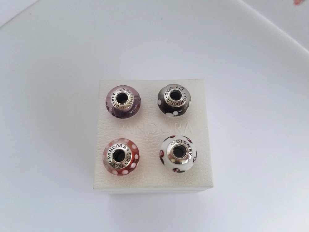 Set Of 4 New Pandora Authentic Disney Mickey and Minnie Murano Charms The charms are new, never worn. Some charms are used for pictures and advertising purposes only. All charms come in Jewelry Pouch with Pandora logo on it. Bracelet and Box NOT INCLUDED.